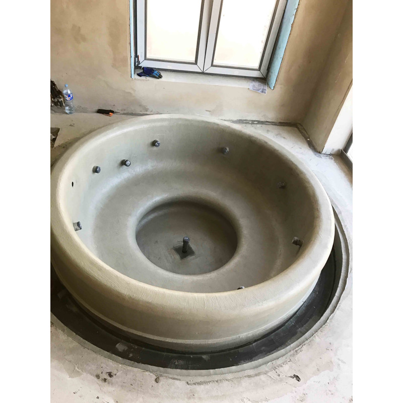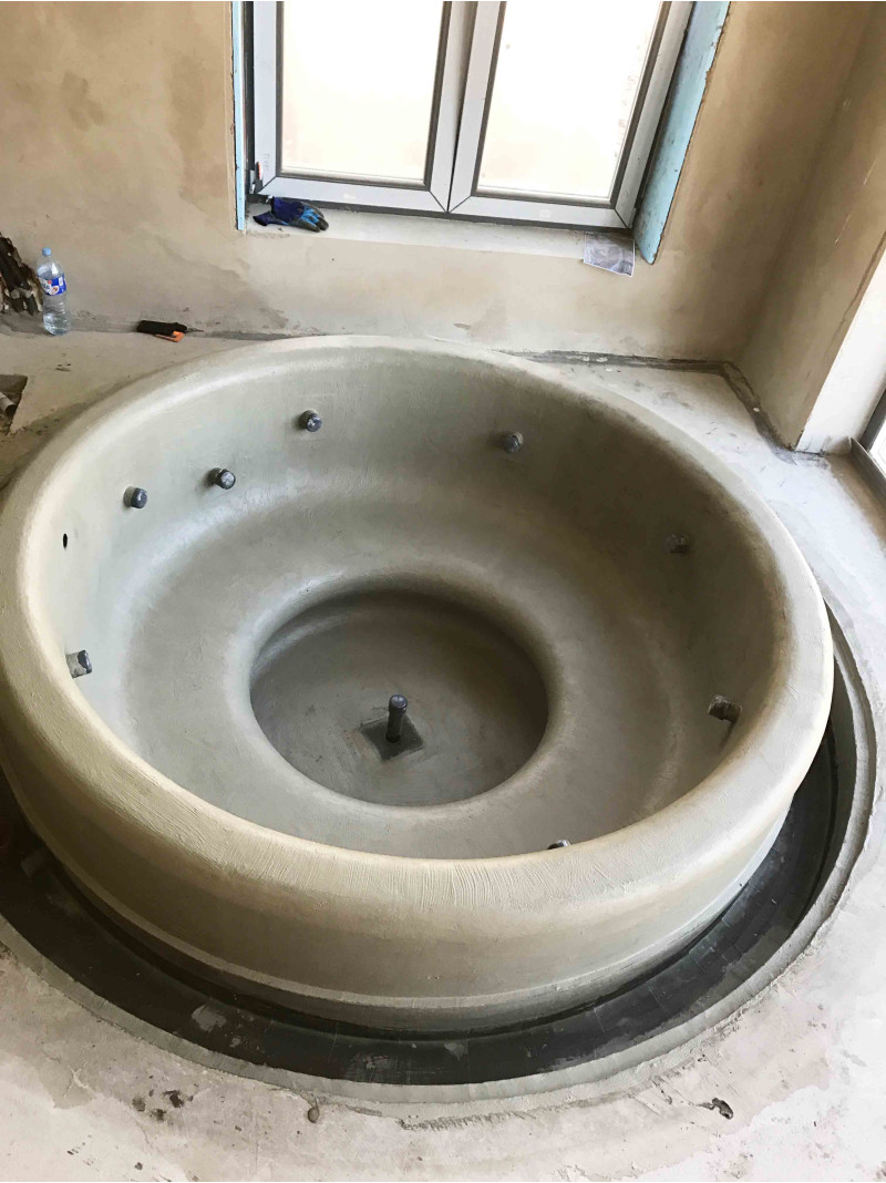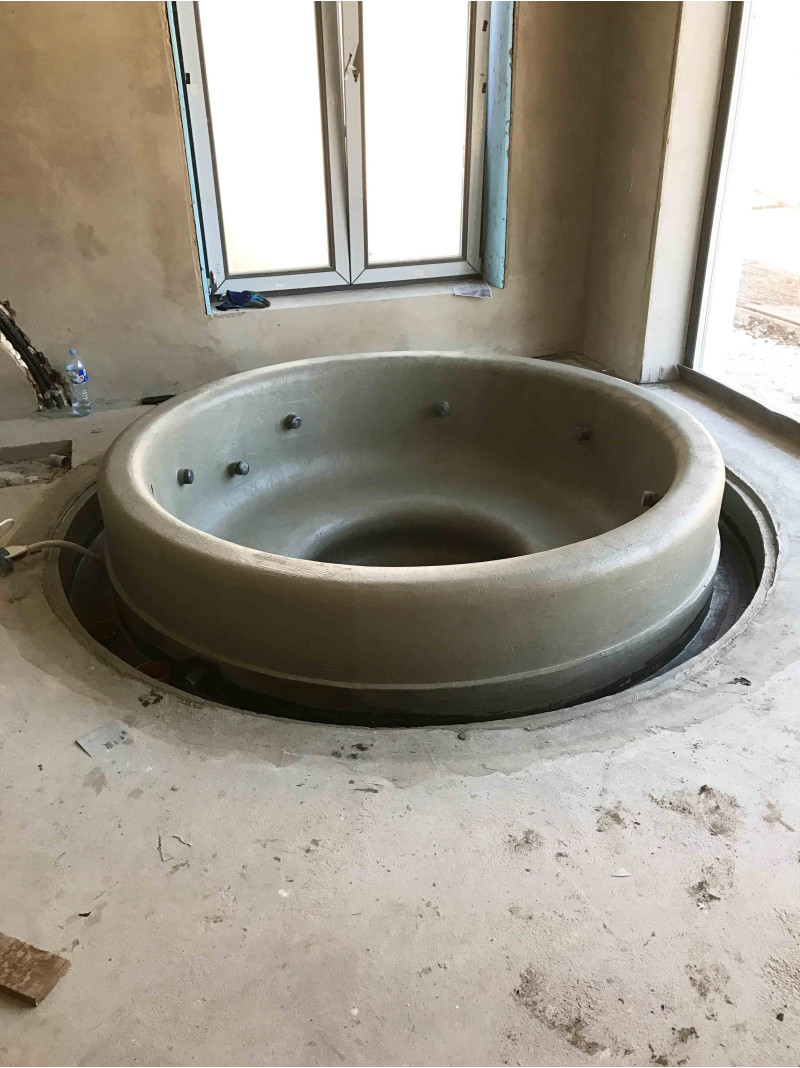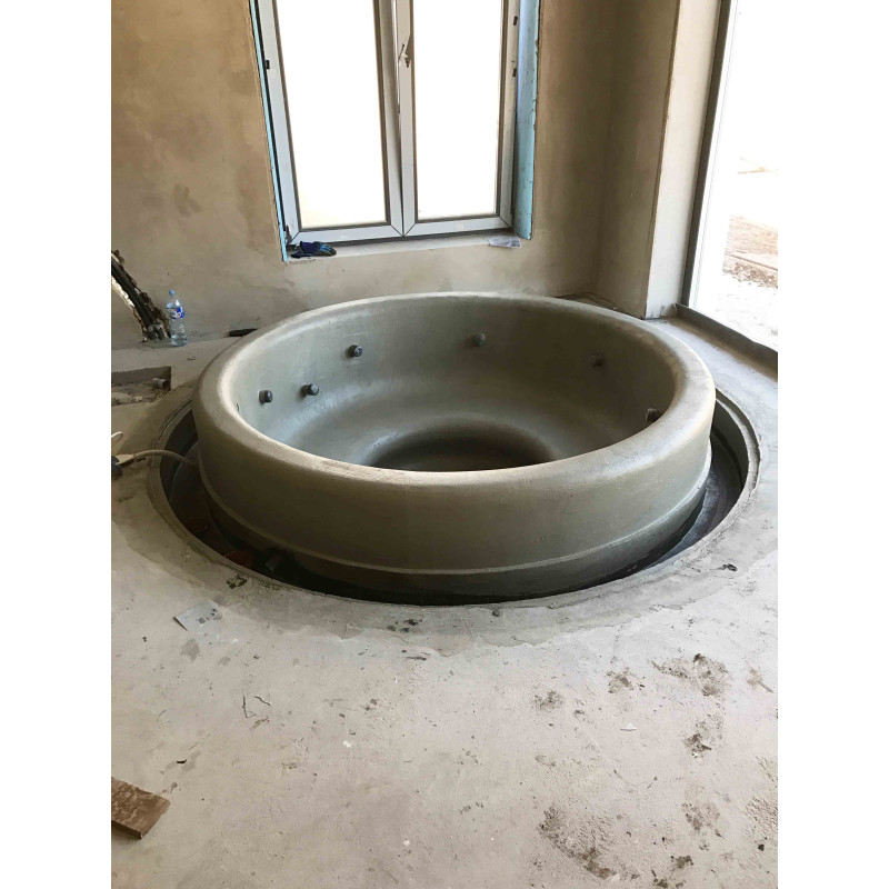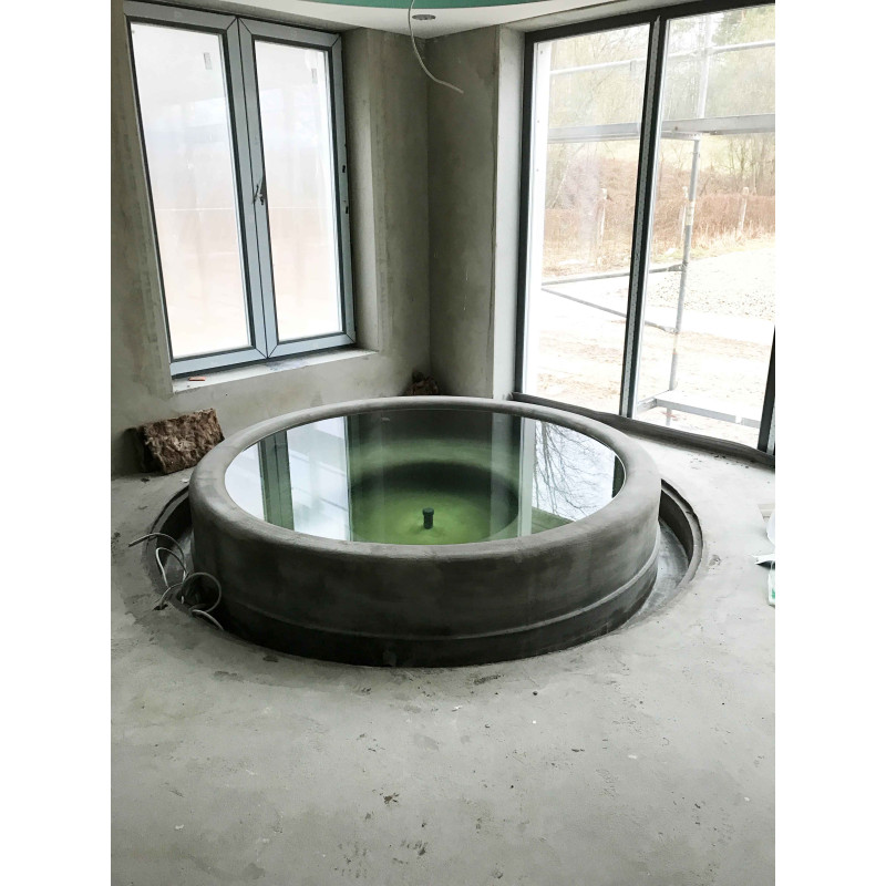Bazen je okrogle oblike, s sedeži okoli celotnega bazena. Notranje površine bazena so bile oblikovane z neprekinjenim rezanjem polistirena XPS 300. Je izredno močan material, odporen na vlago in pritisk.
