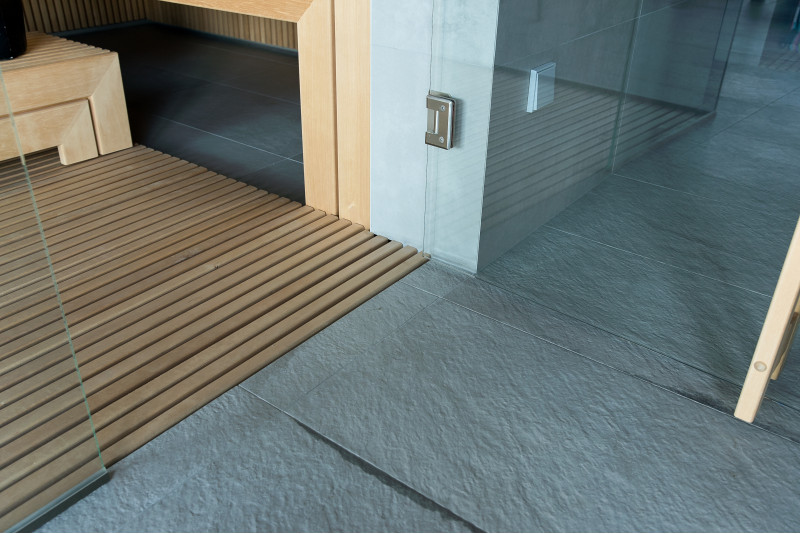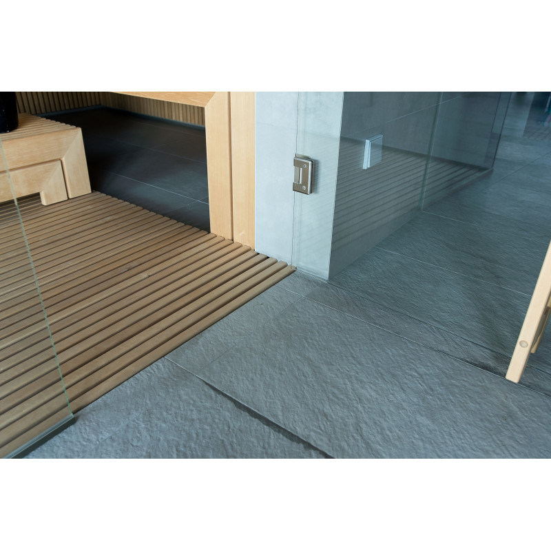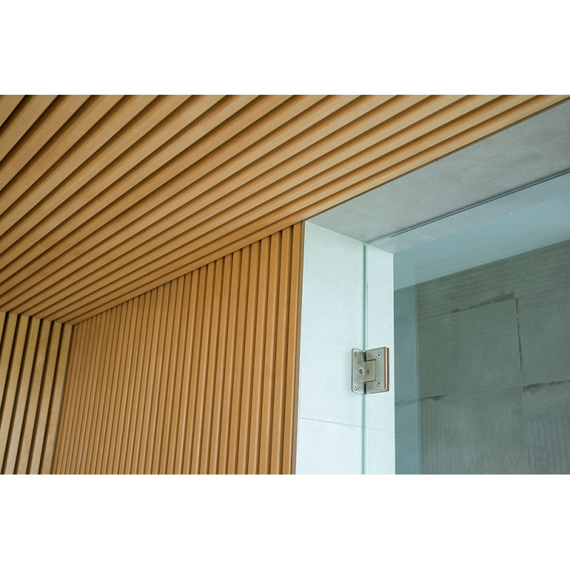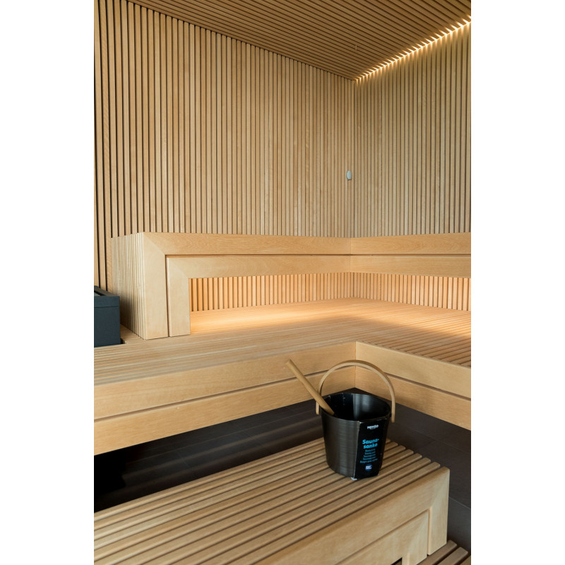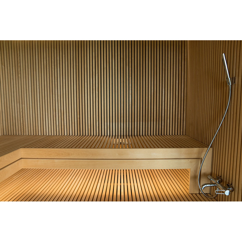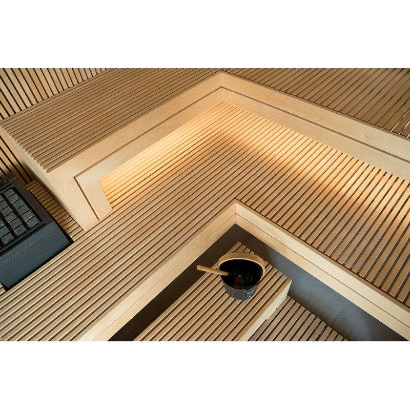 Izbrani zelo svetel les je abachi. Mehka in nizka toplota. Ta pozitivna lastnost vam omogoča udobno uživanje v užitkih savne. Osvetlitev z optičnimi vlakni poudarja strukturo lesa. Opremljena razsvetljava pod ležalniki in stropom se vije vodoravno čez celotno steno in udobno osvetljuje odprte lesene trakove.