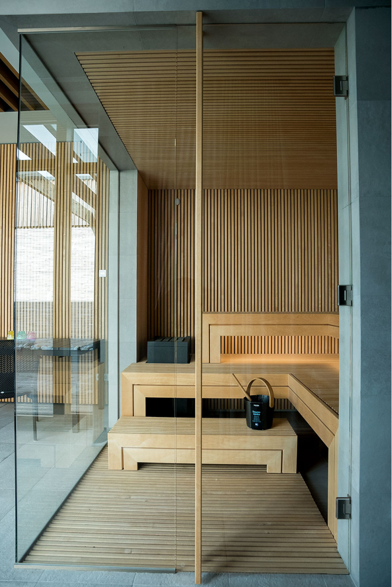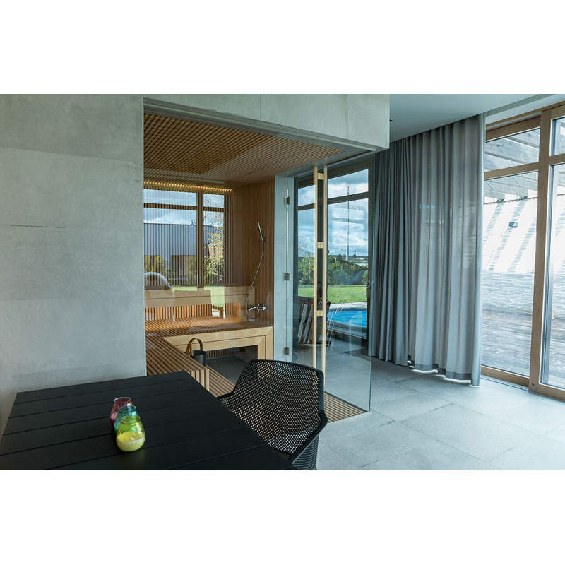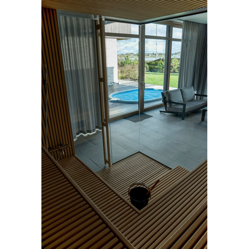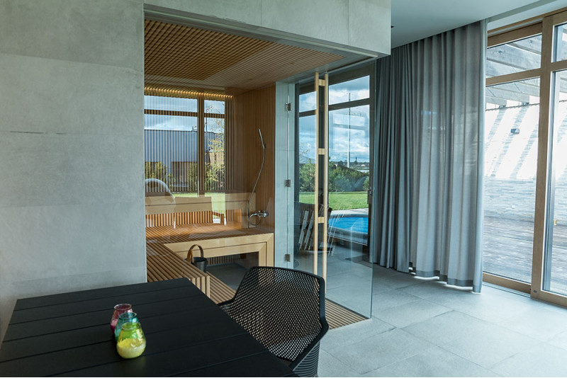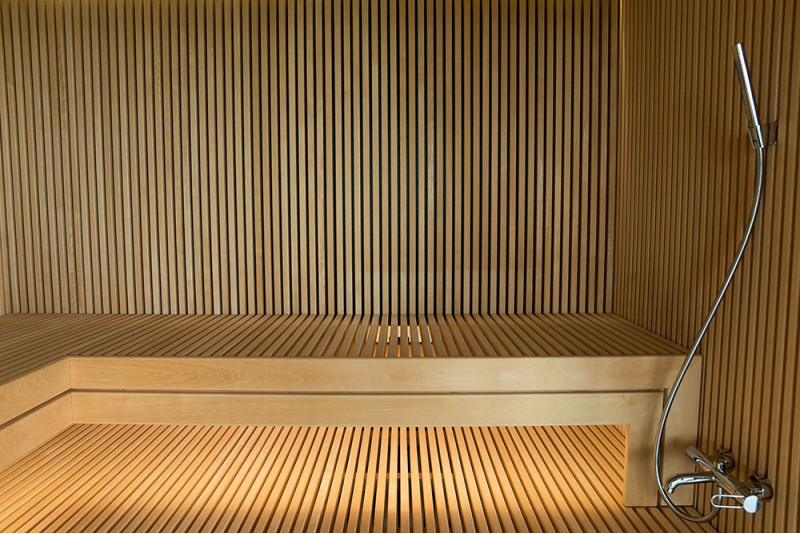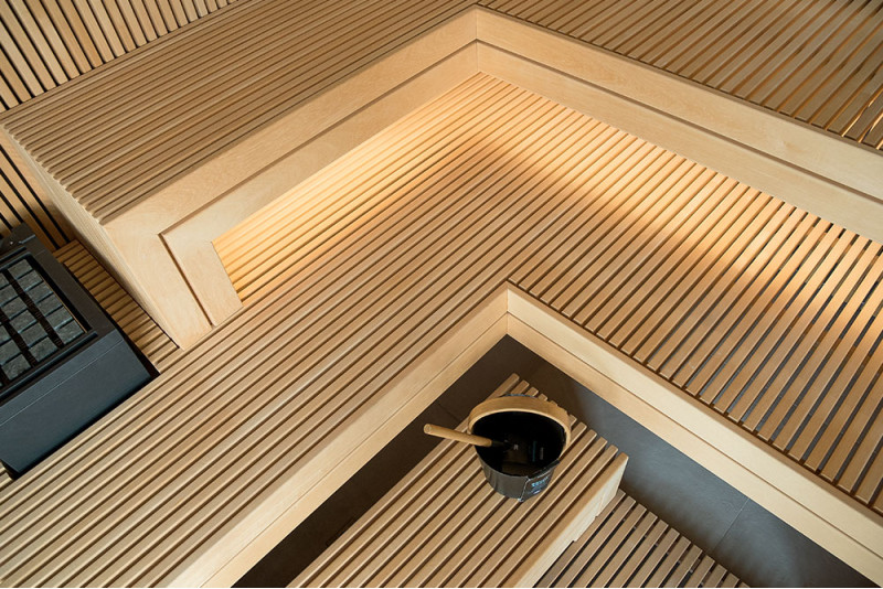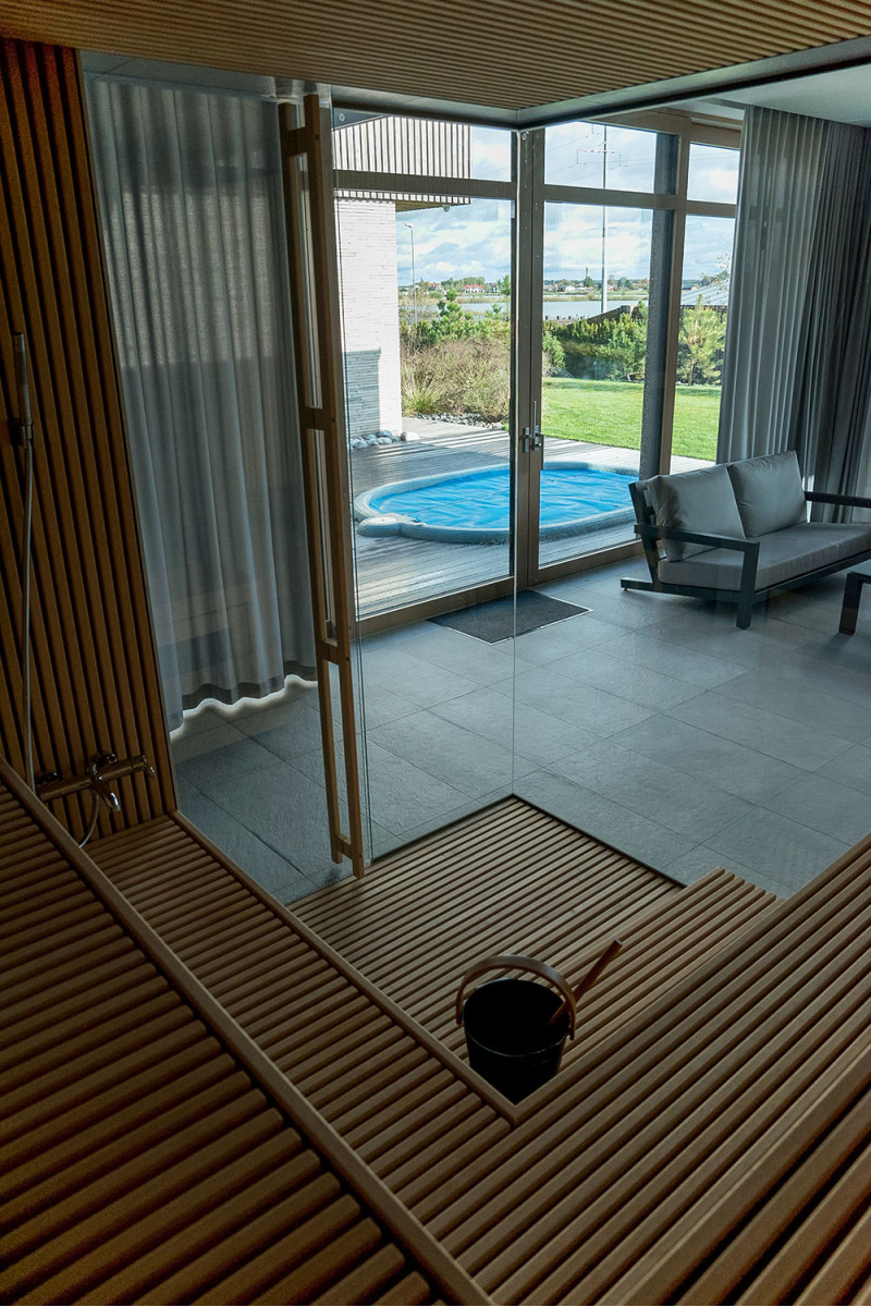 Ekskluzivni dizajn te savne je ustvarjen z dekoracijo z odprtimi lesenimi brusili. V savni so bili uporabljeni tudi ponavljajoči se leseni motivi. Nastal je čist in harmoničen prostor, ki ga ne deli steklena vitrina savne, ampak ravno nasprotno – širi in odpira pogled na čudovito naravo.