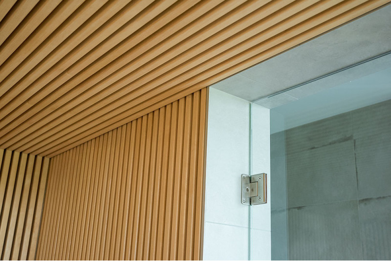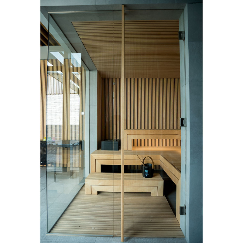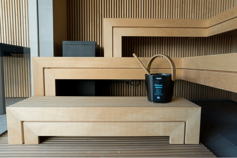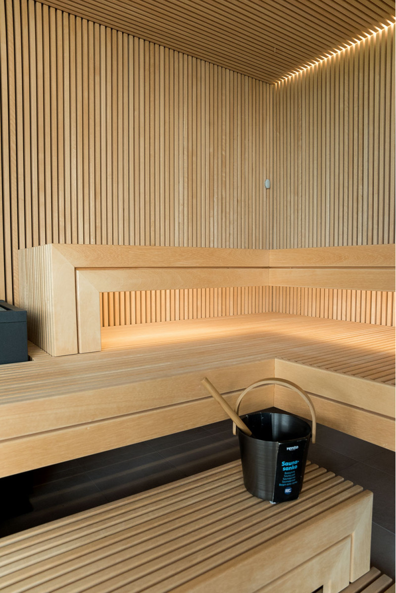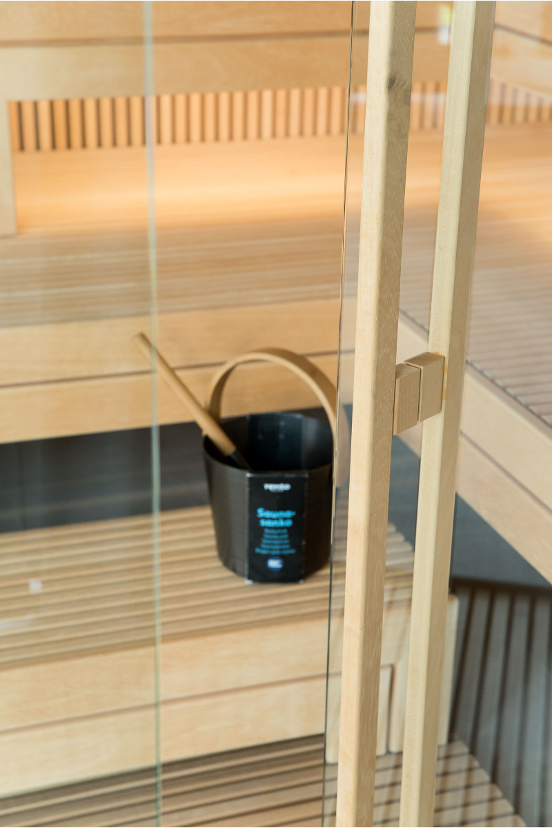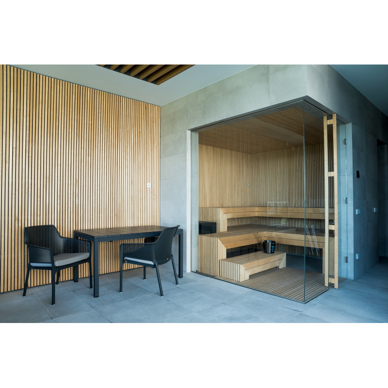 Ekskluzivni dizajn te savne je ustvarjen z dekoracijo z odprtimi lesenimi brusili. V savni so bili uporabljeni tudi ponavljajoči se leseni motivi. Nastal je čist in harmoničen prostor, ki ga ne deli steklena vitrina savne, ampak ravno nasprotno – širi in odpira pogled na čudovito naravo.