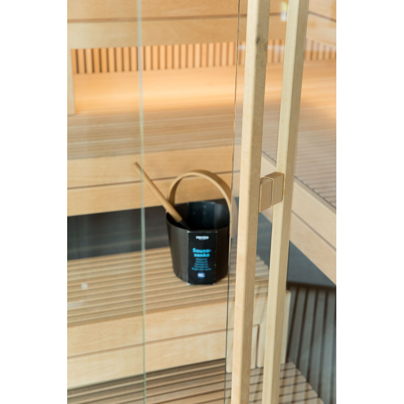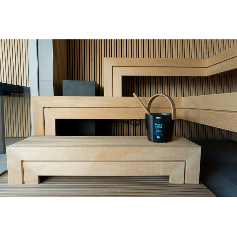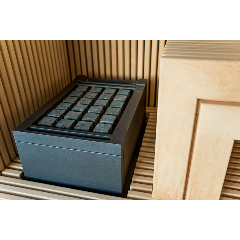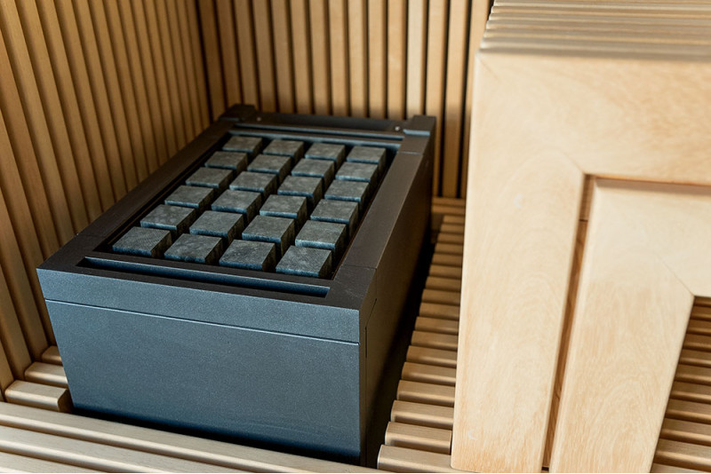 - grelnik ima edinstvene kamne v obliki kocke, dodatno pa je bil opremljen z jadeitnimi kamni (40 kg) - za konstantno vzdrževanje temperature in udobno uživanje v savni