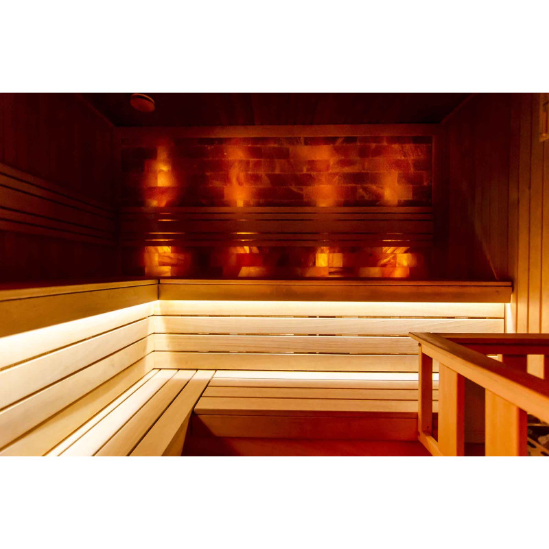 Za užitek ne le telesu, ampak tudi očem, so postavili steno iz gladkih himalajskih solnih opek, osvetljeno z lestenci, nameščenimi pod naslonjalo.