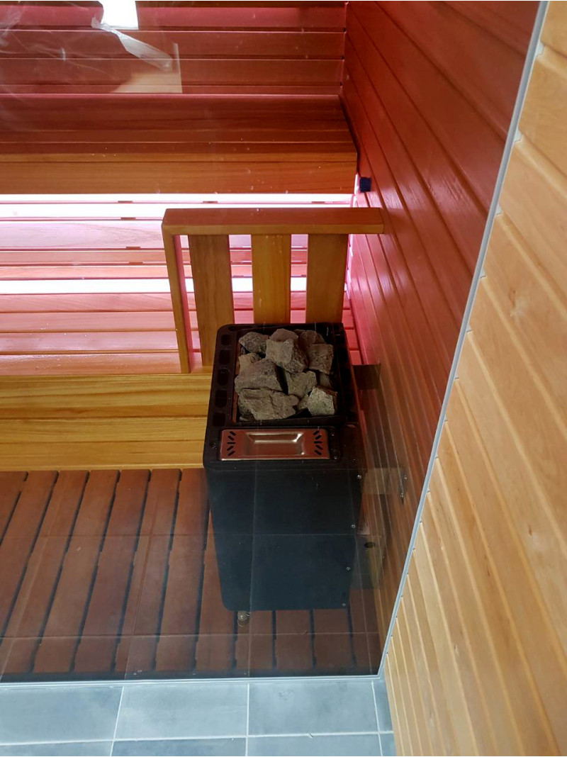 Električni grelec - EOS Bi-O Thermat. Grelec je obešen na steno, s parnim generatorjem. Generator pare z integrirano skodelico za dišave. Z uporabo dišav za savne je mogoče ustvariti želeno vzdušje in razpoloženje v savni.