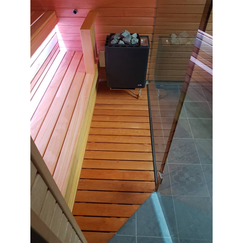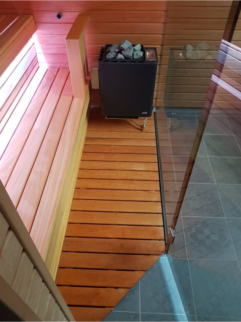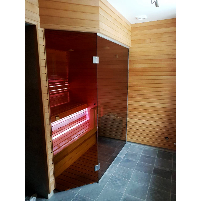 Namesto tradicionalnih vrat in sten ima ta kombinirana savna moderno videti vitrino iz kaljenega zatemnjenega stekla. Takšna vitrina je moderna in daje občutek prostora.