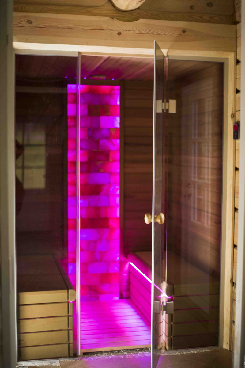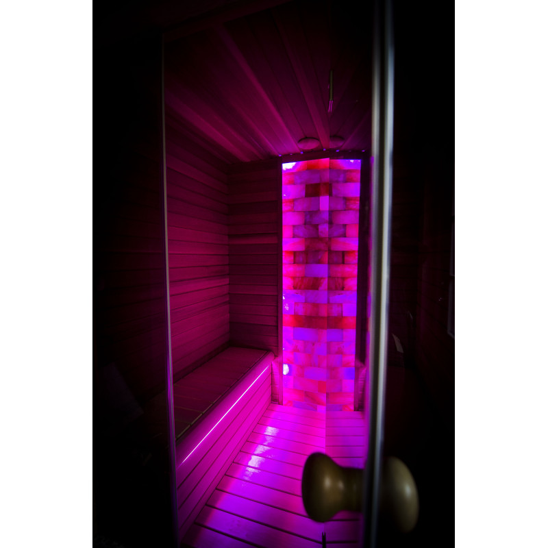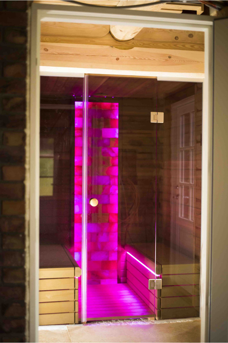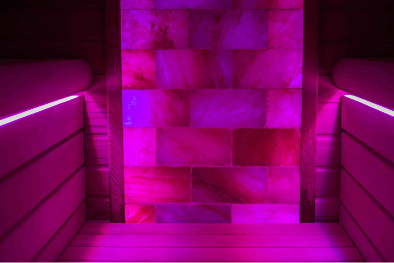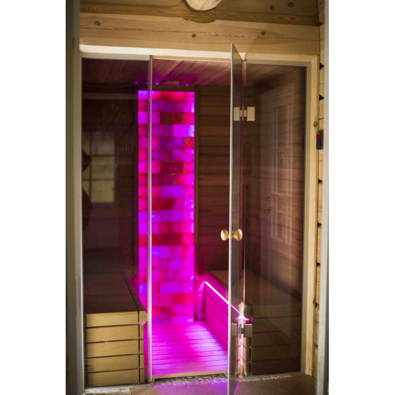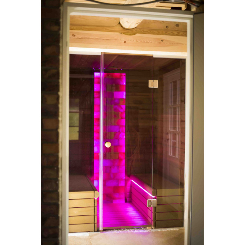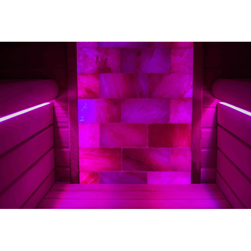 Himalajska solna opečna stena, izbrana za dekoracijo savne z vgrajeno barvno RGB osvetlitvijo, ki jo upravlja brezžični menjalnik barv, ustvarja prijetno okolje in dodatno krepi učinek savne.