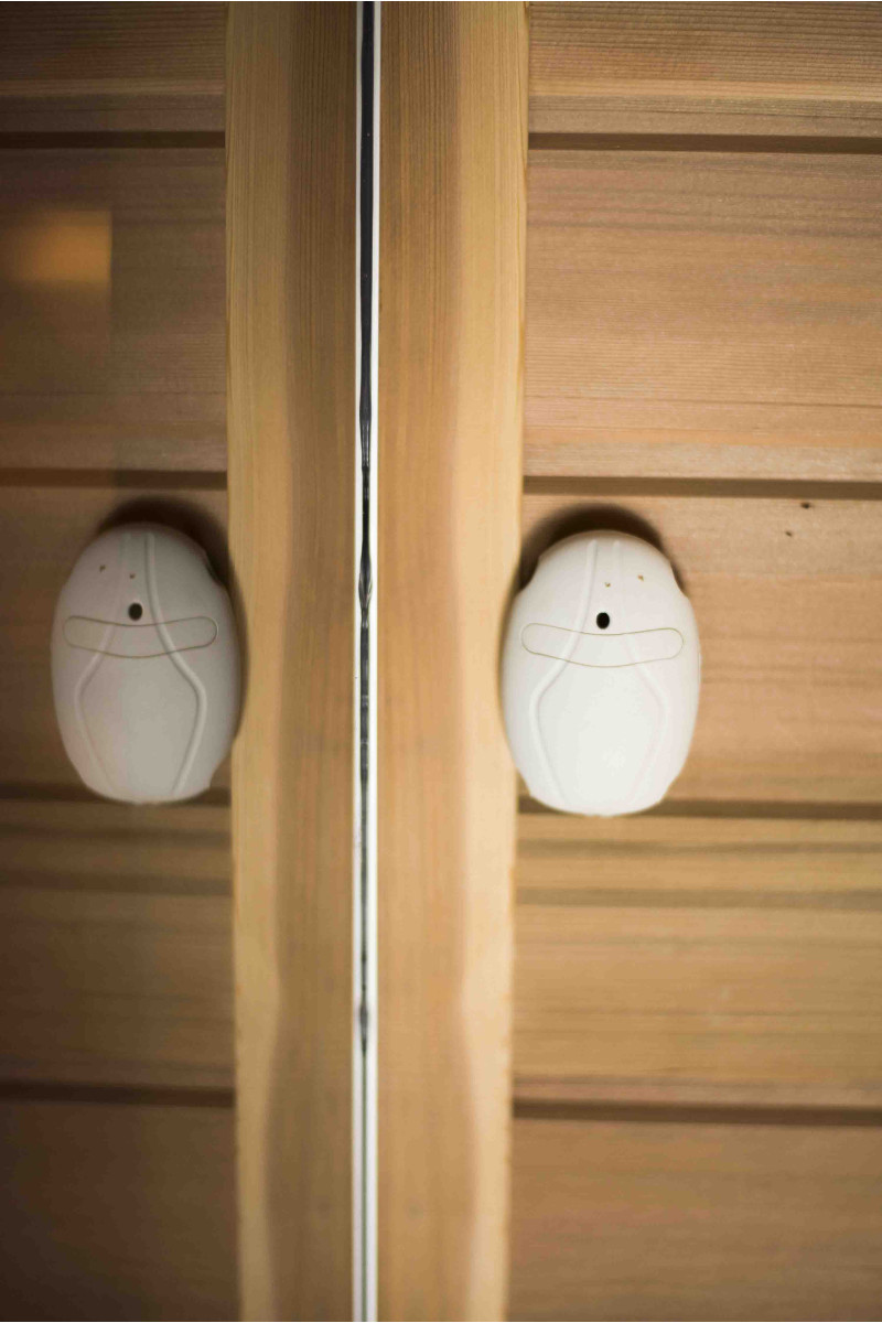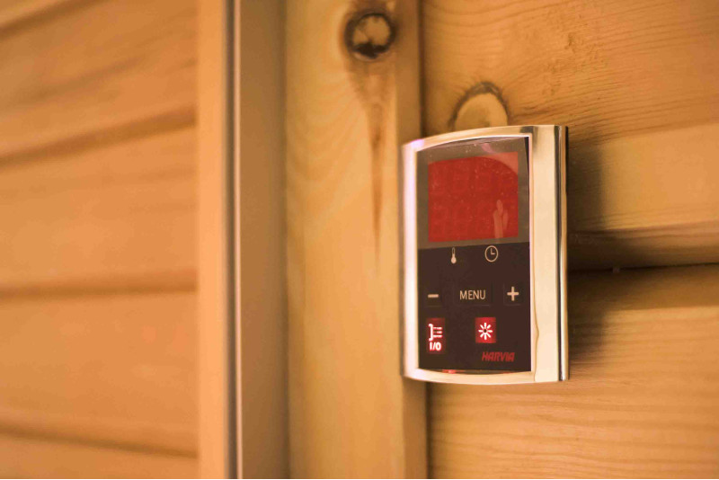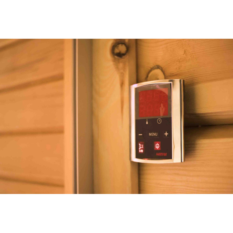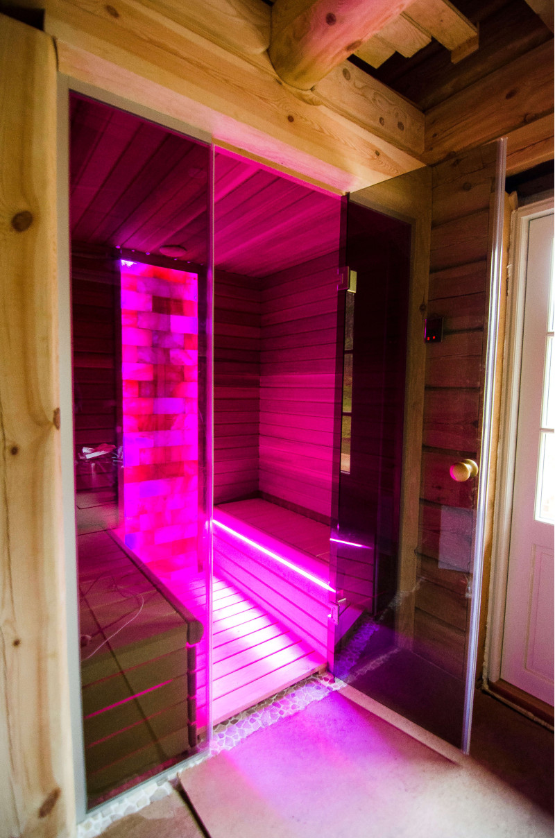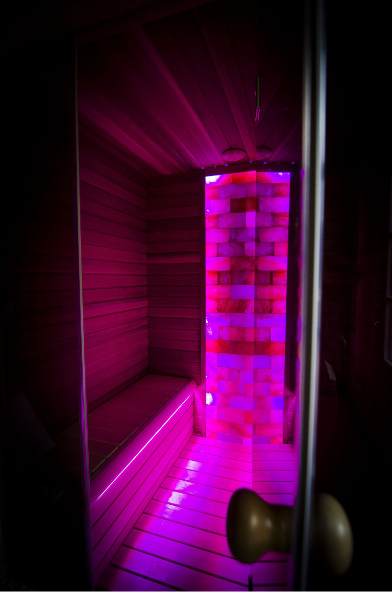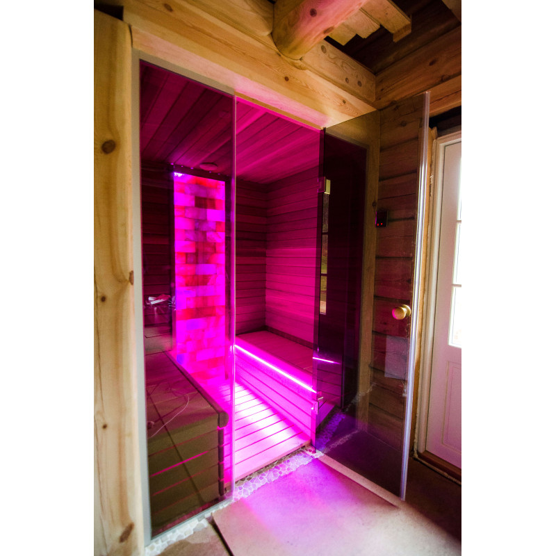 Himalajska solna opečna stena, izbrana za dekoracijo savne z vgrajeno barvno RGB osvetlitvijo, ki jo upravlja brezžični menjalnik barv, ustvarja prijetno okolje in dodatno krepi učinek savne.