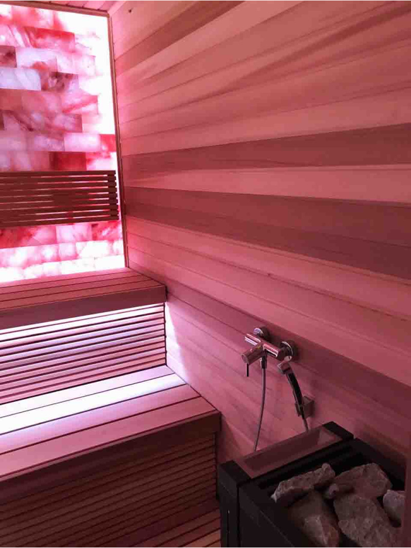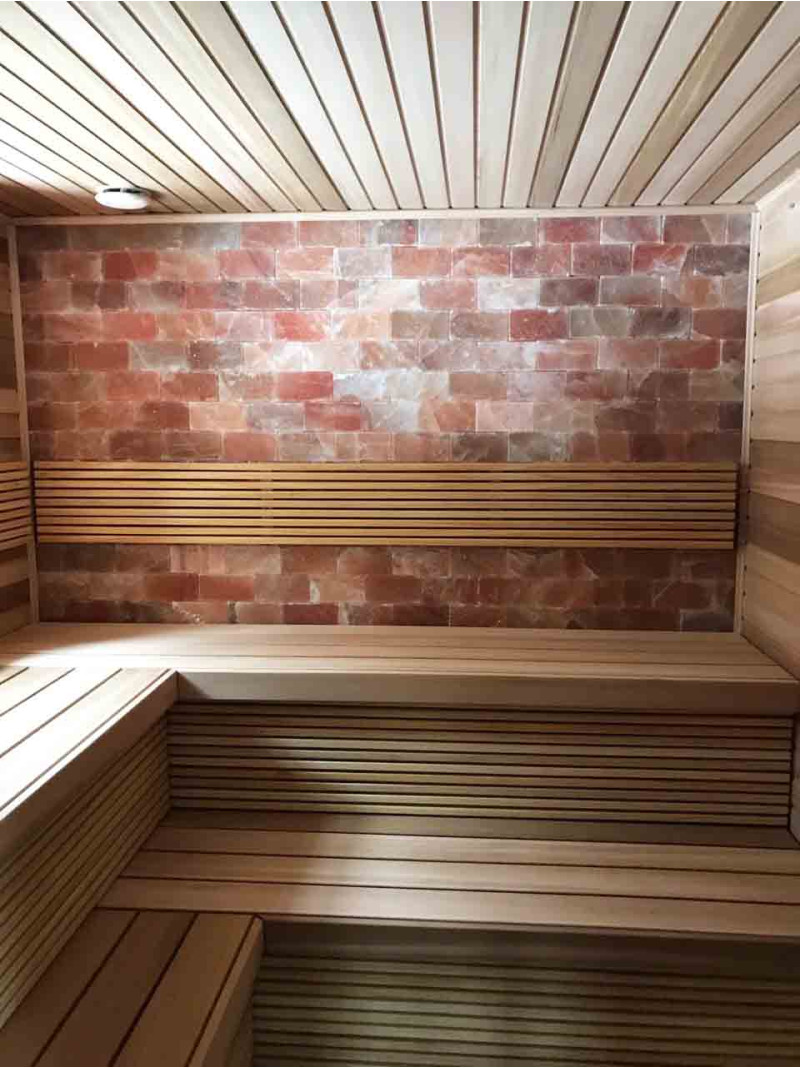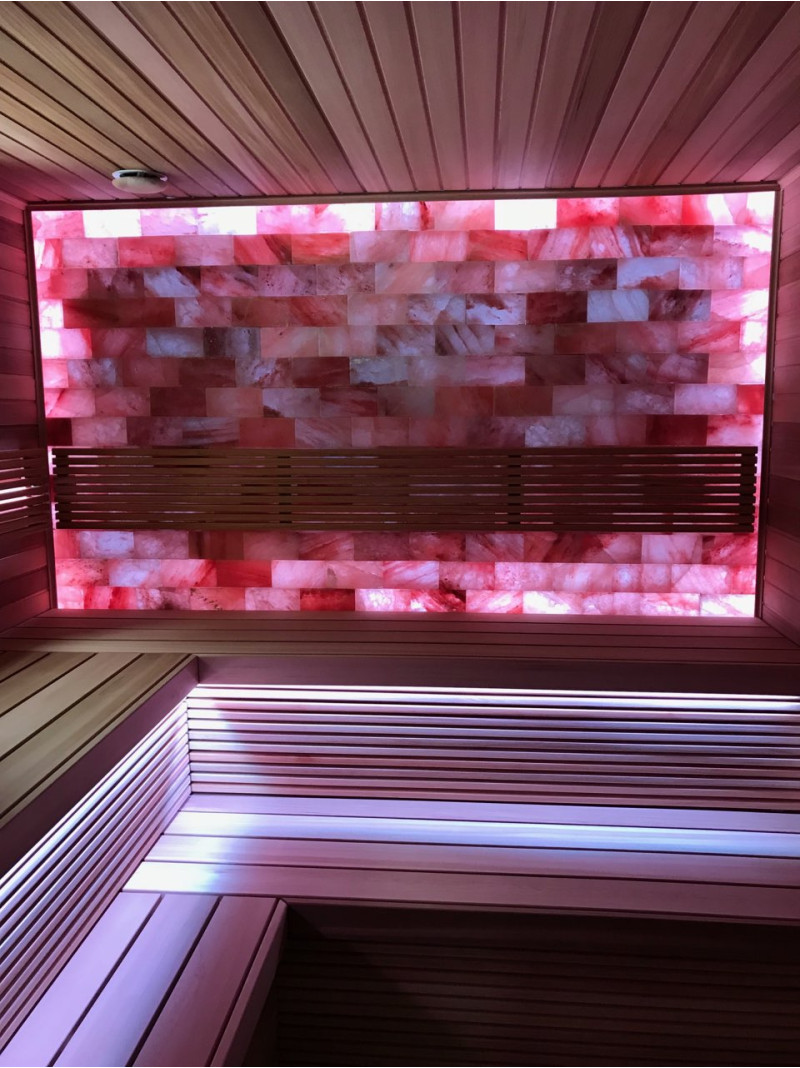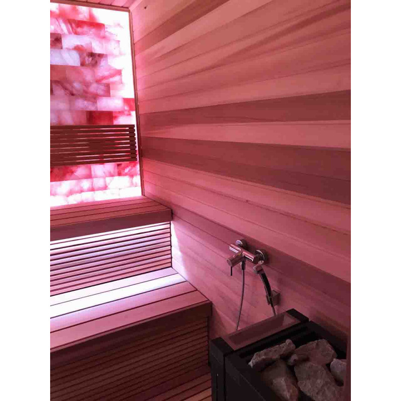 Kakovost zraka in občutke savne močno povečuje velika stena himalajskih soli. Izpuščeni negativni ioni krepijo zdravje, pomagajo pri premagovanju številnih bolezni, kot so: bronhialna astma, pljučna in bronhialna obolenja, postinfarkt, hipertenzija, čir na prebavilih, gastritis, bolezni ščitnice, dermatitis, različne alergije, živčne bolezni, pomaga pri premagovanju stresa. Prednosti izvajanja postopkov v takšni savni so dvojne.