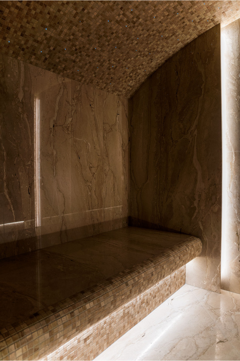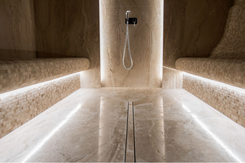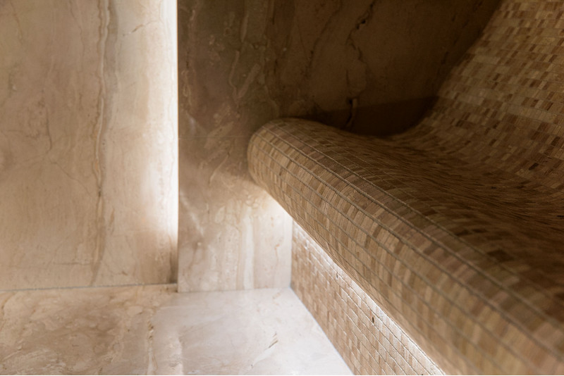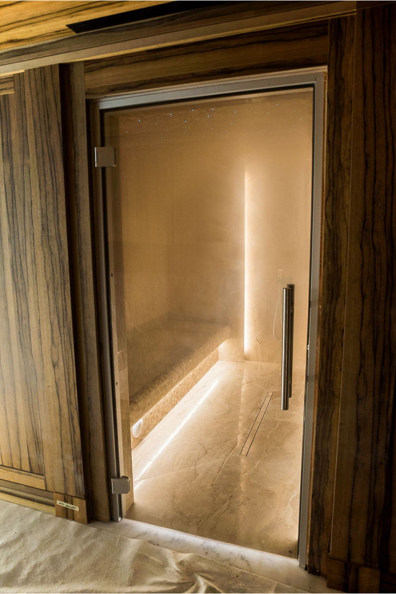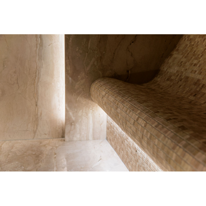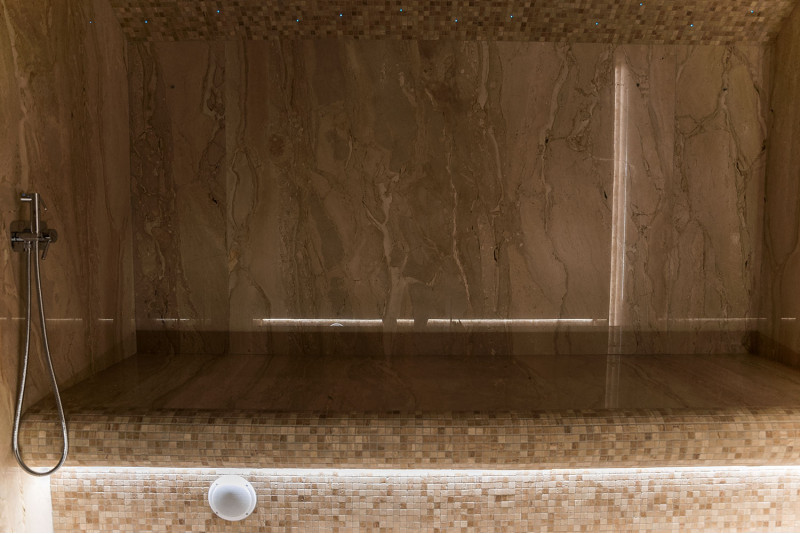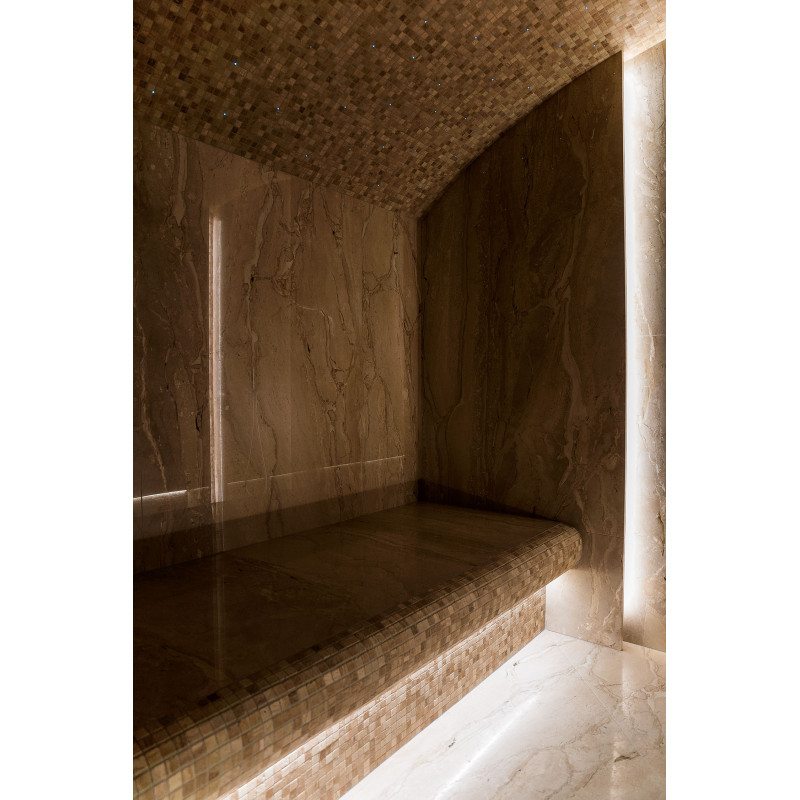 Stene parne kopeli so obložene z marmornatimi ploščami, postelje in stropi so narejeni iz marmornatih mozaičnih ploščic. Ena postelja, širša, je zasnovana tako, da se nanjo lahko uleže, druga pa z oblikovano ergonomsko krivuljo - za sedenje. Savno ogreva 9kW parni generator Pego, ki ga krmili krmilna enota Fasel, občutljiva na dotik. LED osvetlitev v savni je pod posteljami in na stenah "Žvaigždėtas dangus" sistem je vgrajen v strop. Dišavna črpalka v savni oddaja prijeten vonj in svežino.