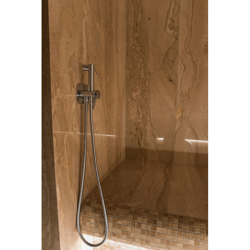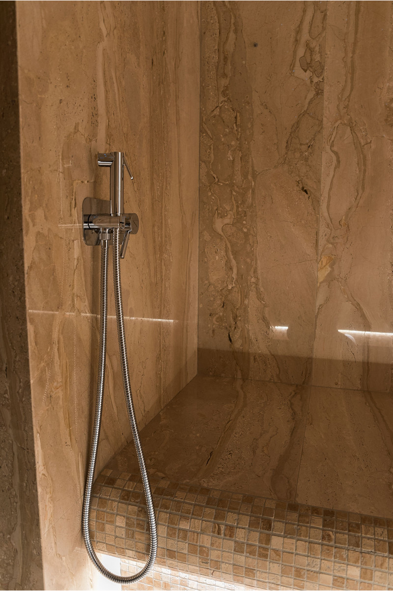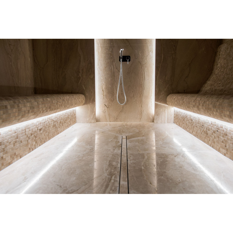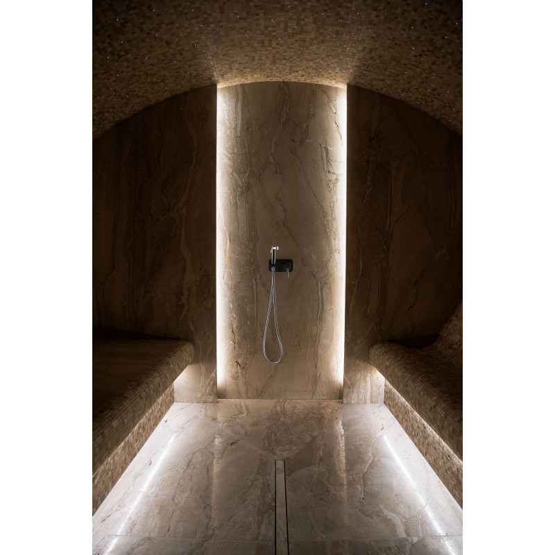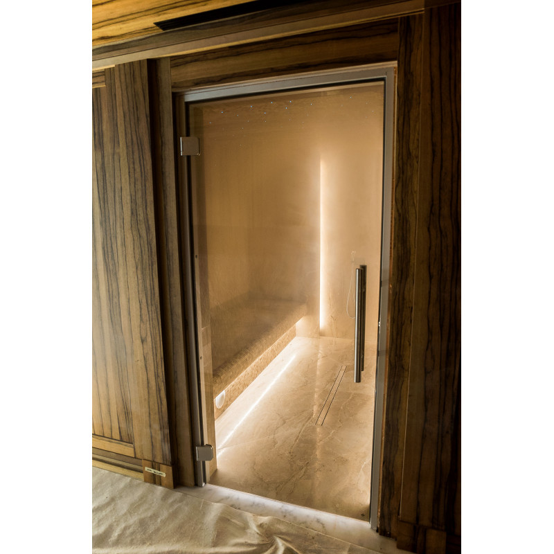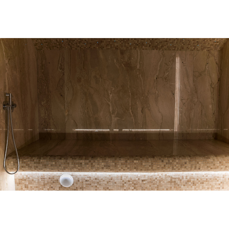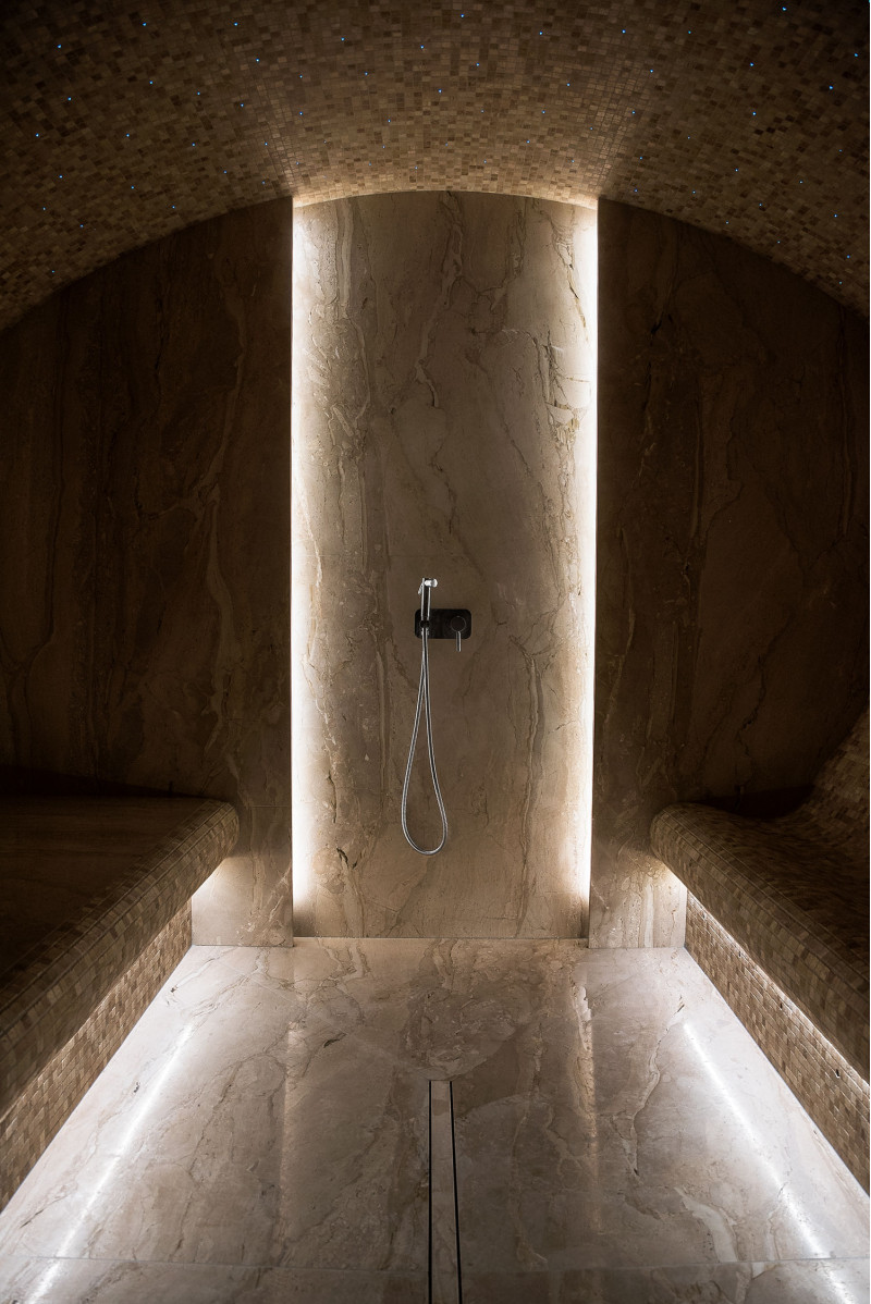 Stene parne kopeli so obložene z marmornatimi ploščami, postelje in stropi so narejeni iz marmornatih mozaičnih ploščic. Ena postelja, širša, je zasnovana tako, da se nanjo lahko uleže, druga pa z oblikovano ergonomsko krivuljo - za sedenje. Savno ogreva 9kW parni generator Pego, ki ga krmili krmilna enota Fasel, občutljiva na dotik. LED osvetlitev v savni je pod posteljami in na stenah "Žvaigždėtas dangus" sistem je vgrajen v strop. Dišavna črpalka v savni oddaja prijeten vonj in svežino.
