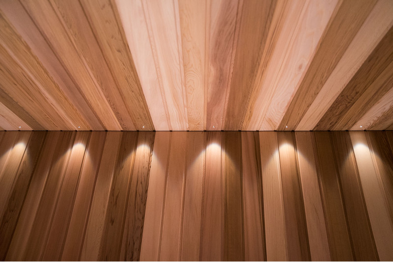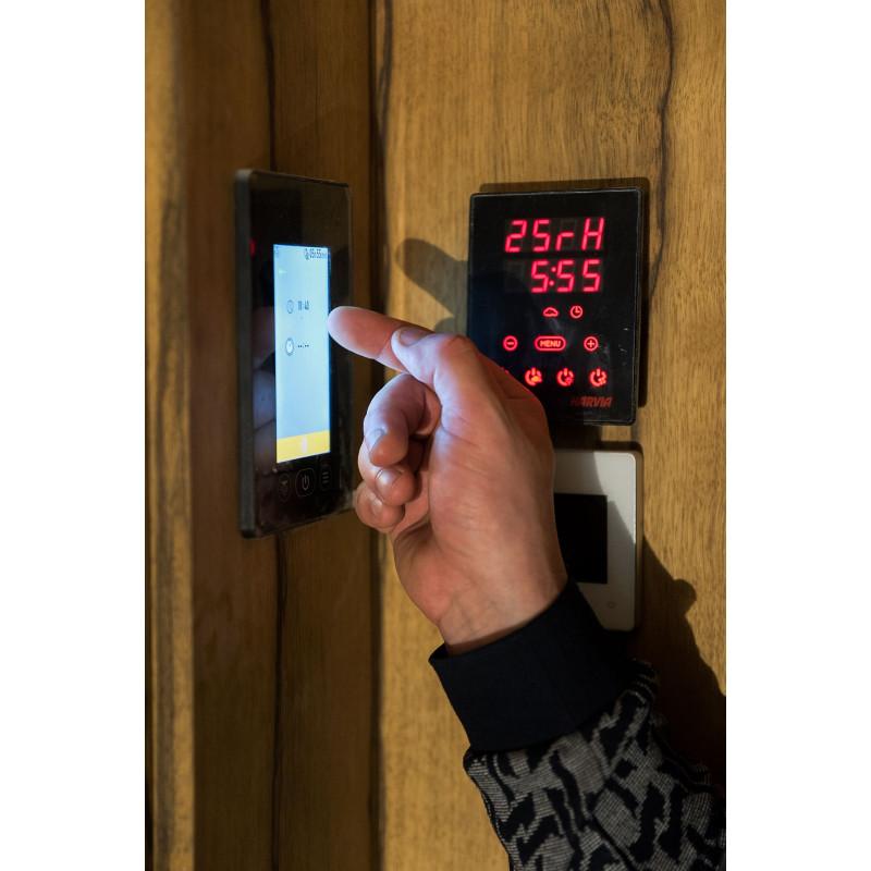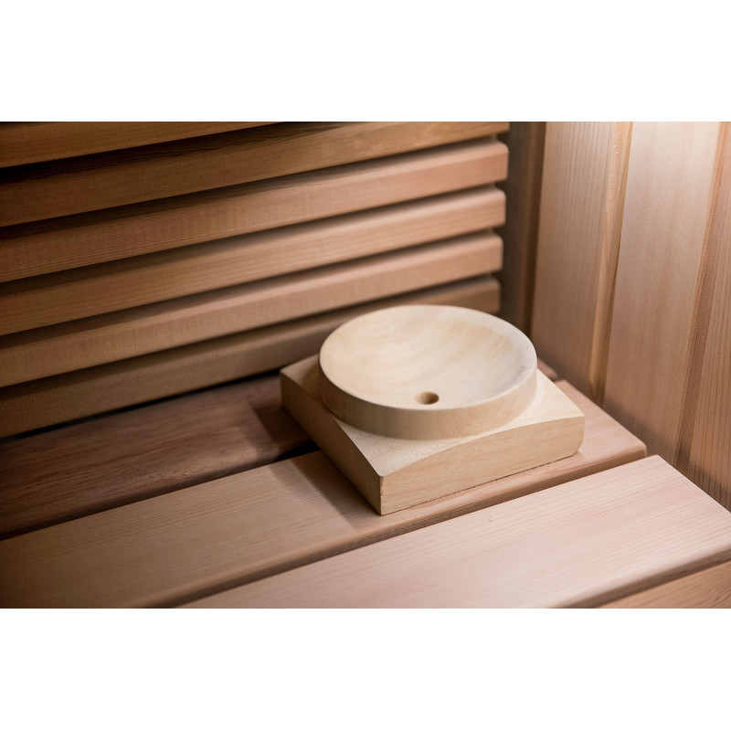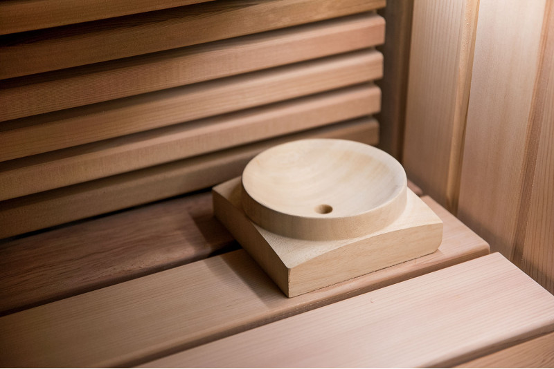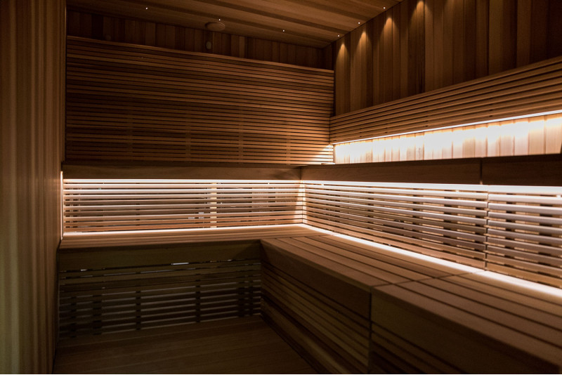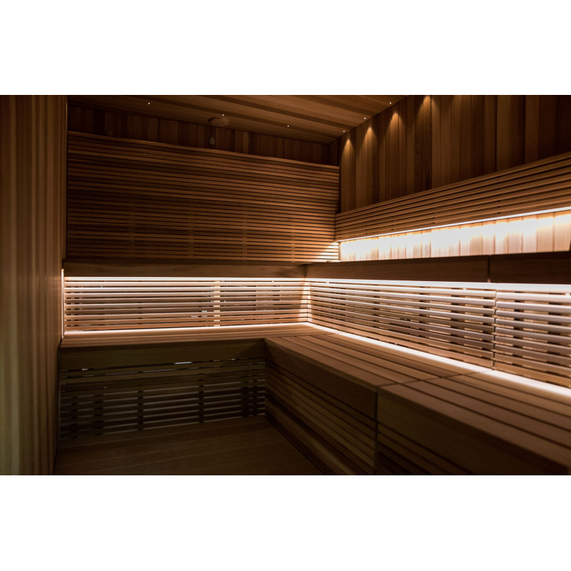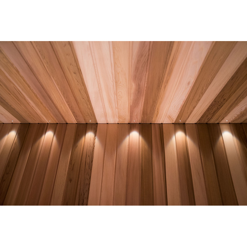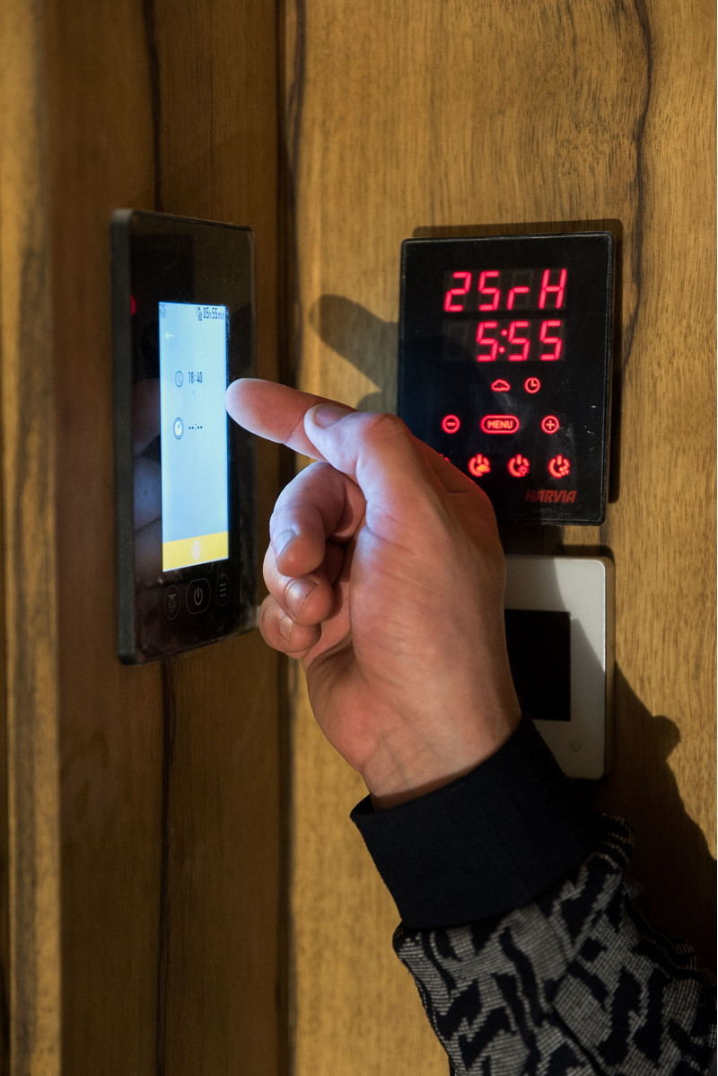 Za savno je bil izbran izredno lep les - rdeča kanadska cedra. Dekorativni leseni bloki so osvetljeni z LED sistemom, v strop je vgrajen komplet za osvetlitev optičnih vlaken Cariitti. Pod savnami je nameščen grelec EOS bi-O Mat z vgrajenim uparjalnikom, ki ga krmili krmilna enota Harvia Xenio Combi CX110C.