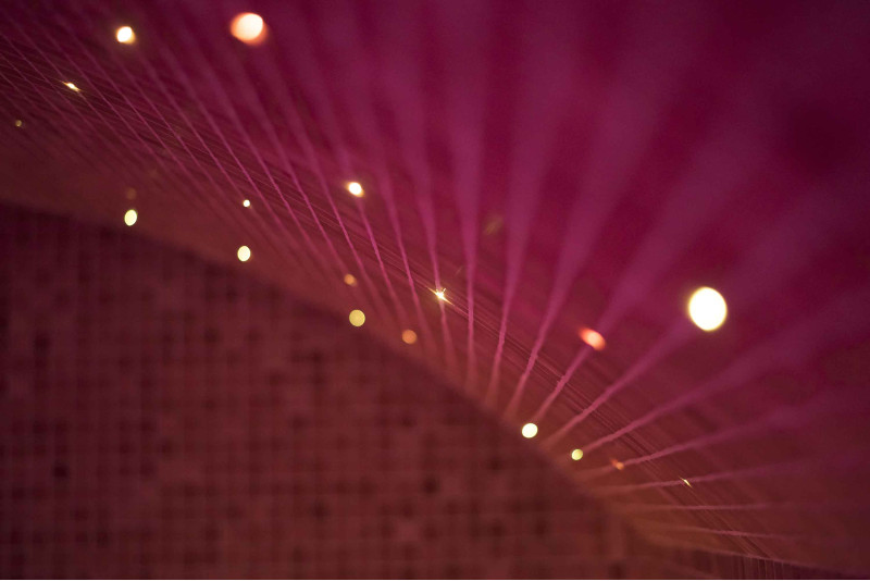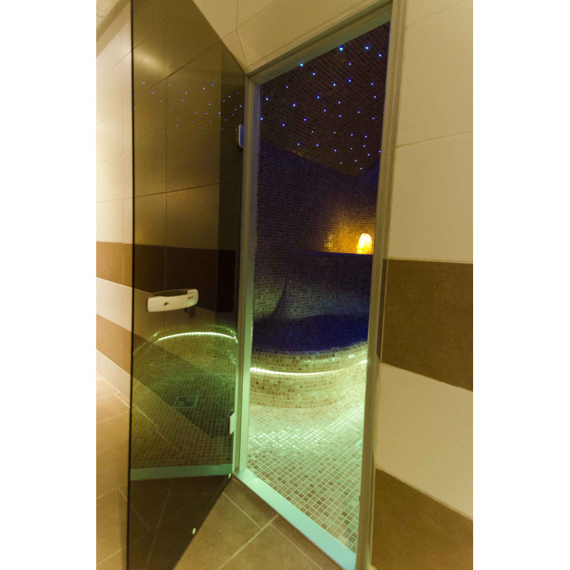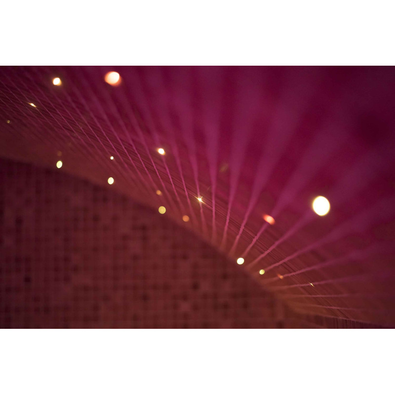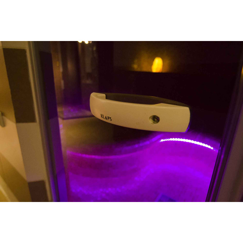 Sistem razsvetljave - strop je osvetljen s svetlobnim sistemom z optičnimi vlakni "Zvezdno nebo". Osvetlitev z optičnimi vlakni je dolgotrajna, vsestranska, ekonomična in preprosta rešitev. Zahvaljujoč temu lahko izluščite najbolj impresivne možnosti osvetlitve. "Zvezdno nebo" ustvarja prijetno okolje in odlično dopolnjuje izkušnjo ogrevanja v savni. Pod klopmi je barvna razsvetljava za osvetlitev tal. Barve se lahko spreminjajo.