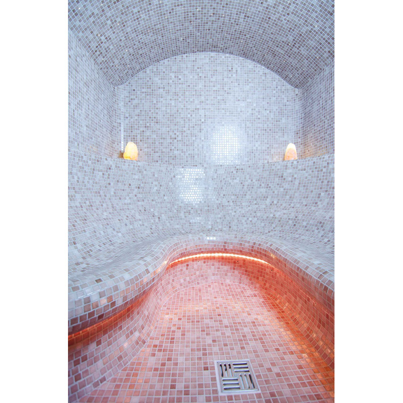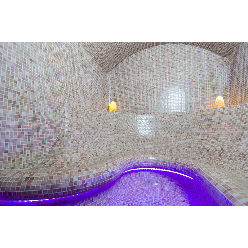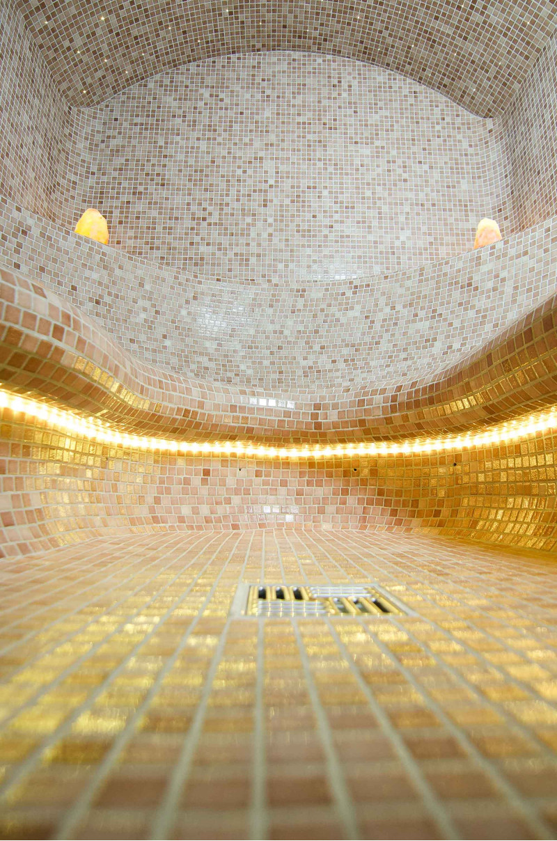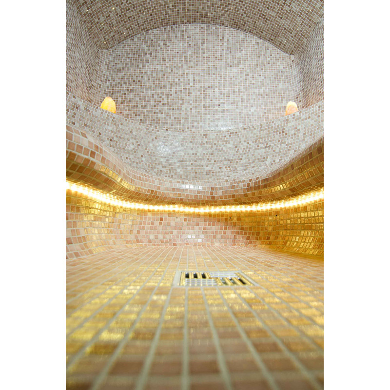 Končna obdelava - tla, stene, stropi in klopi savn so okrašeni z majhnimi drobljenimi steklenimi mozaičnimi ploščicami.