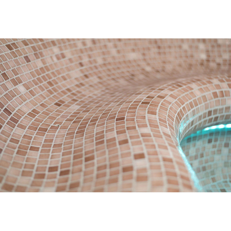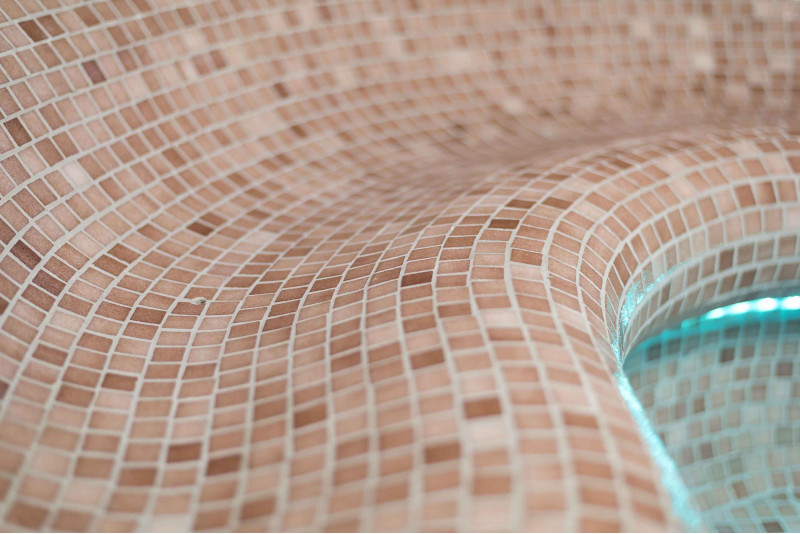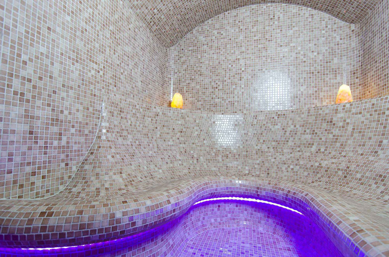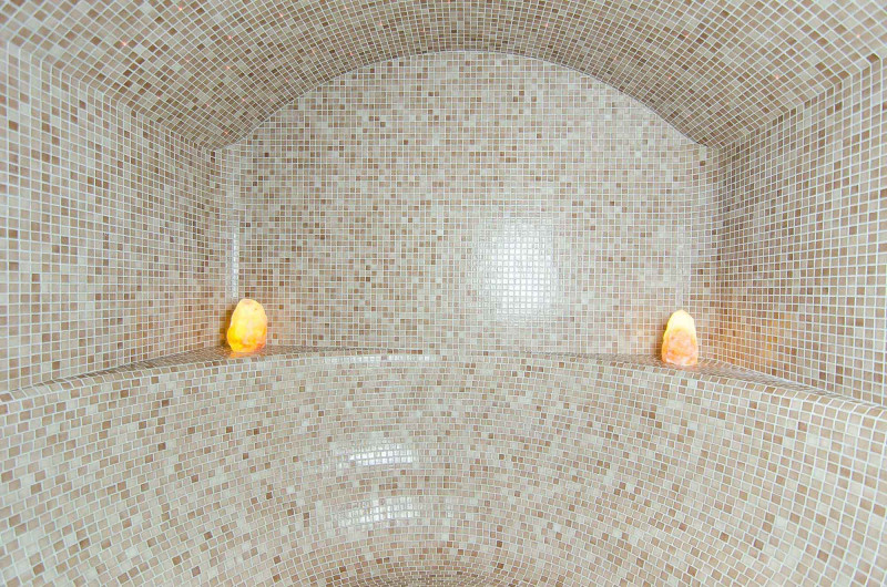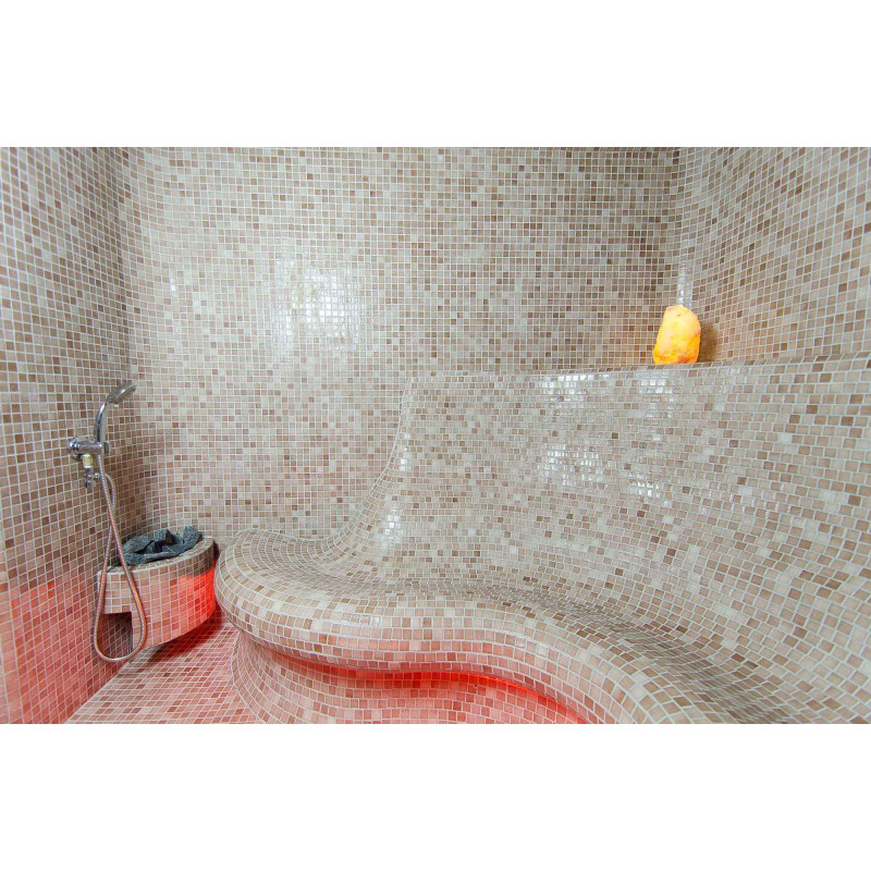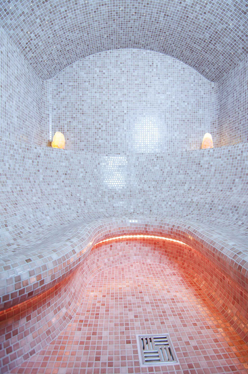 Končna obdelava - tla, stene, stropi in klopi savn so okrašeni z majhnimi drobljenimi steklenimi mozaičnimi ploščicami.