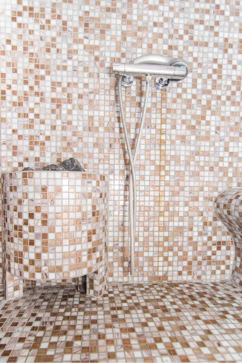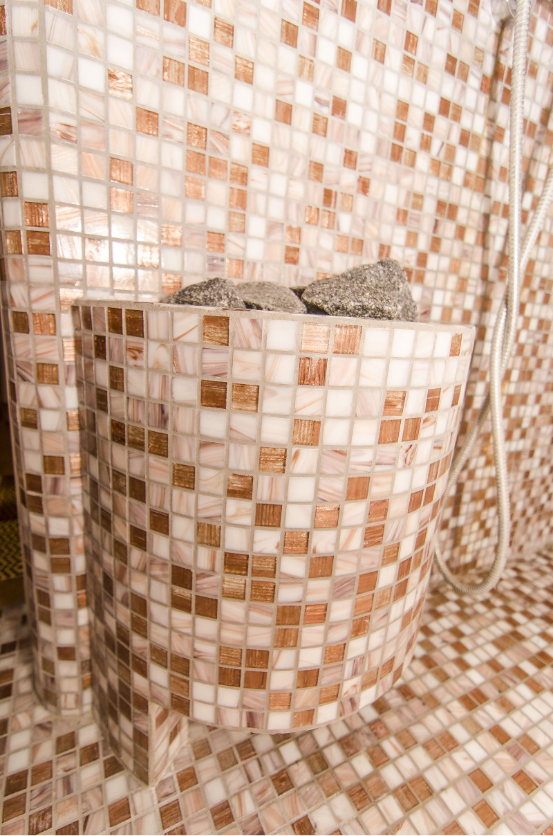 Parna vaza opravlja funkcijo parne zaščitne cevi, skozi katero vstopa para v savno, okrašeno z olivin diabaznimi kamni.