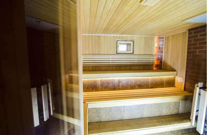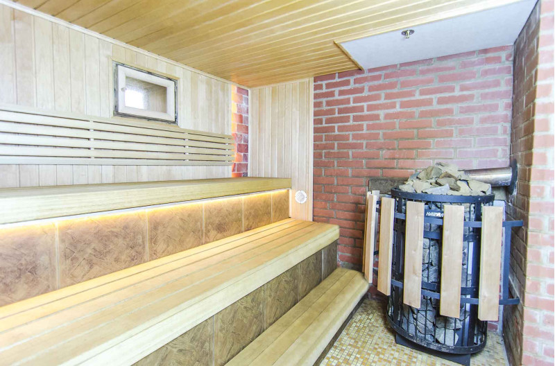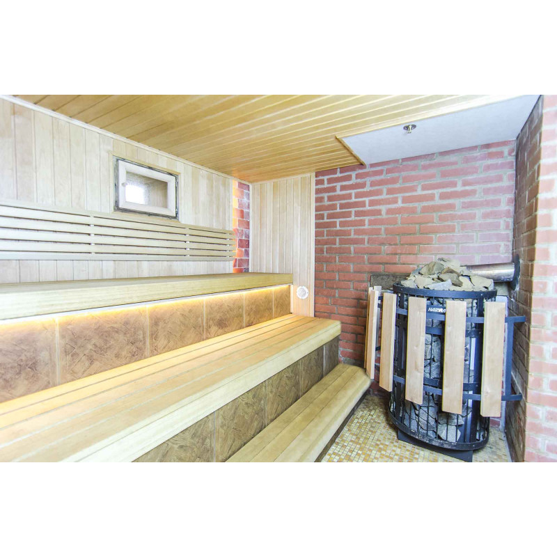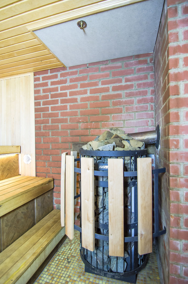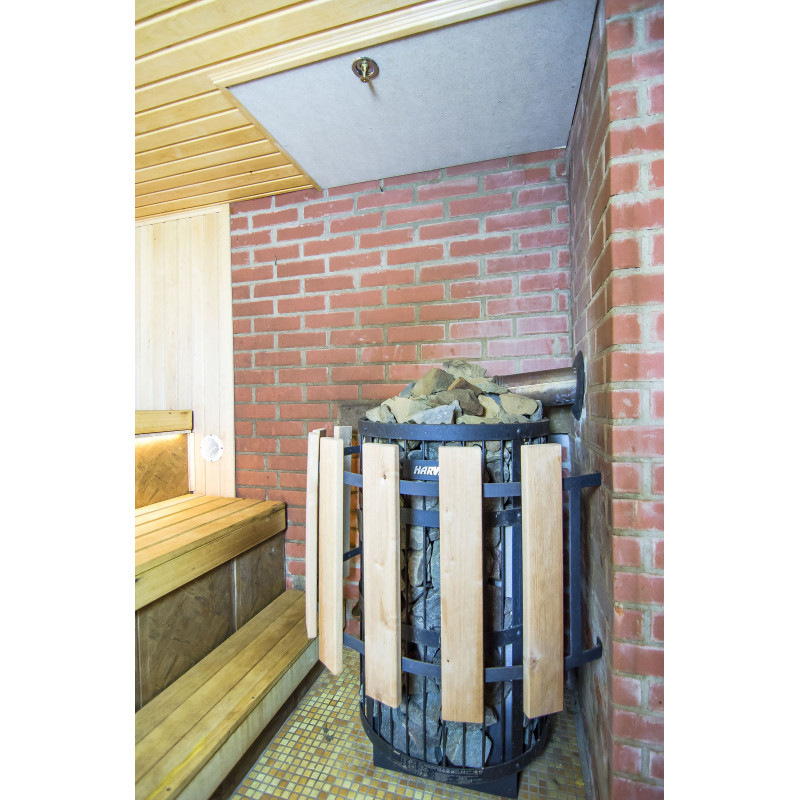 Spremenjena je bila oprema za ogrevanje savne. Ročno izdelan grelec je bil preoblikovan v Harvia Legend 300 Duo na drva z zunanjim kuriščem, ki vsebuje veliko količino kamnov, kar vam omogoča, da uživate v toploti, ki jo oddajajo tudi v odsotnosti visokih temperatur. Strop je opremljen s protipožarnim sistemom - plošča Minerit Savna, brizgalna. Okoli grelnika je nameščen zaščitni rob iz lesa in kovine.