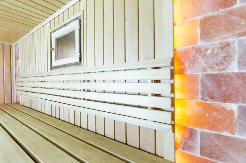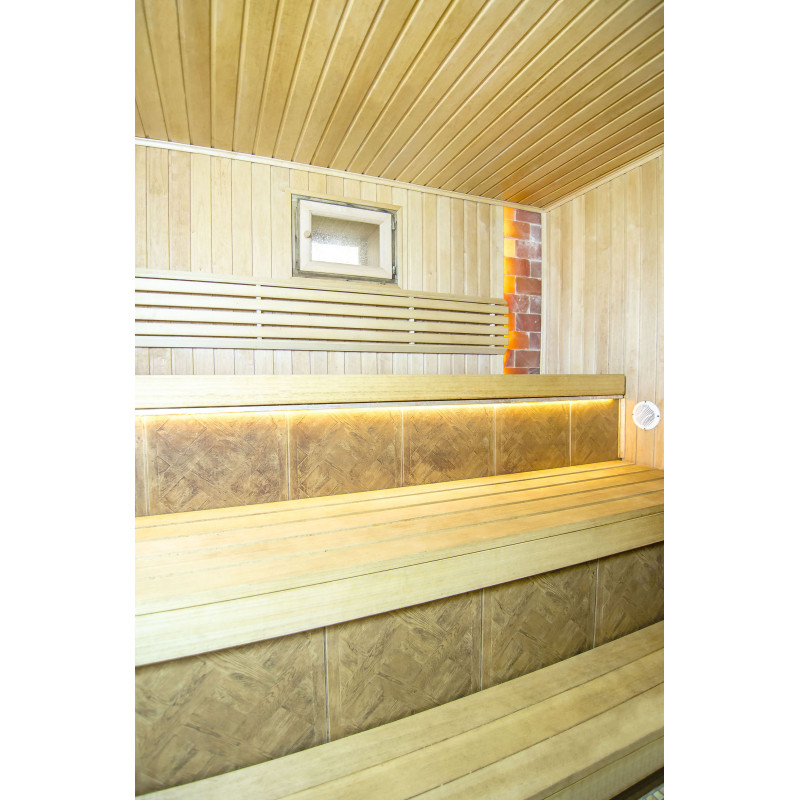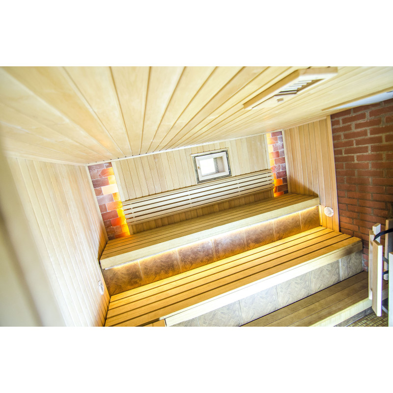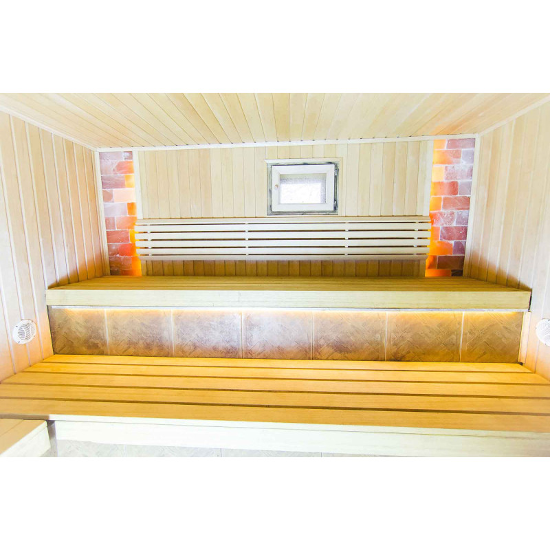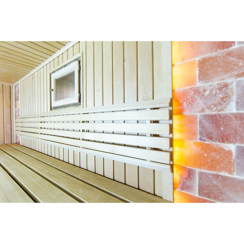 Za dekoracijo savne je bil izbran odličen dekorativni element - bloki himalajske soli. Himalajska sol ne le izgleda odlično, ampak tudi izboljšuje kakovost zraka v zaprtih prostorih, zmanjšuje simptome alergij in astme, dviguje razpoloženje in daje energijo, nevtralizira elektromagnetno sevanje, zmanjšuje statično elektriko v zraku. Vgrajena LED osvetlitev za solnimi bloki ustvarja še bolj prijetno okolje v savni in poudari videz blokov himalajske soli.