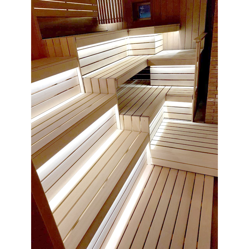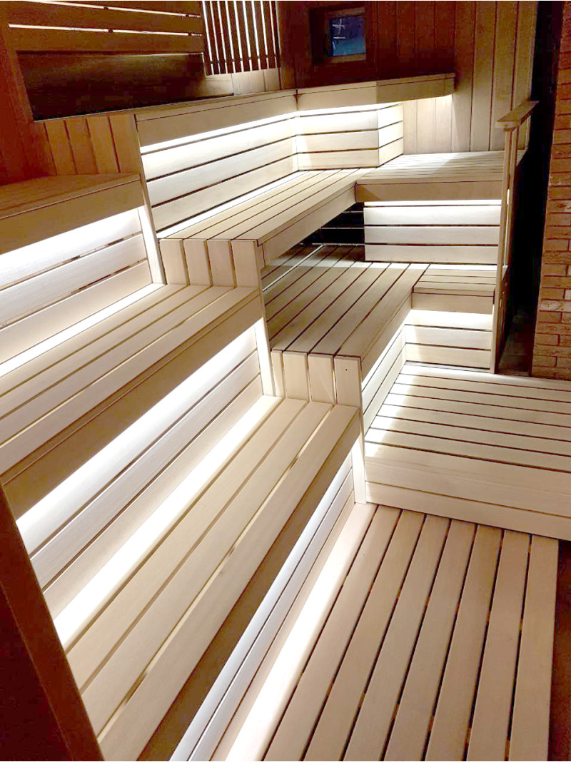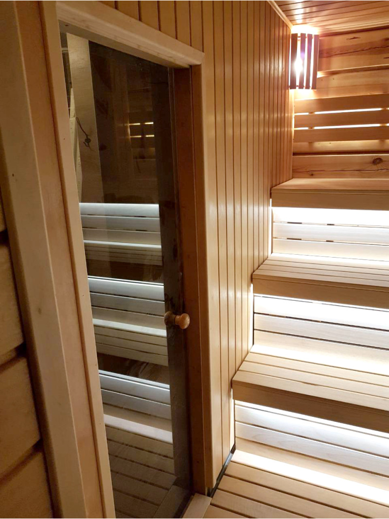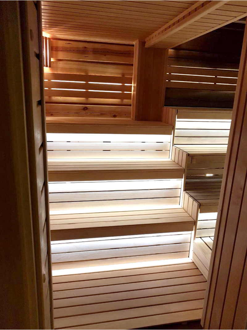 Pod ležalniki je nameščena topla bela LED osvetlitev, ki daje savni občutek prostornosti in udobja. Za stensko razsvetljavo je bila izbrana svetilka z ustreznim lesenim pokrovom.