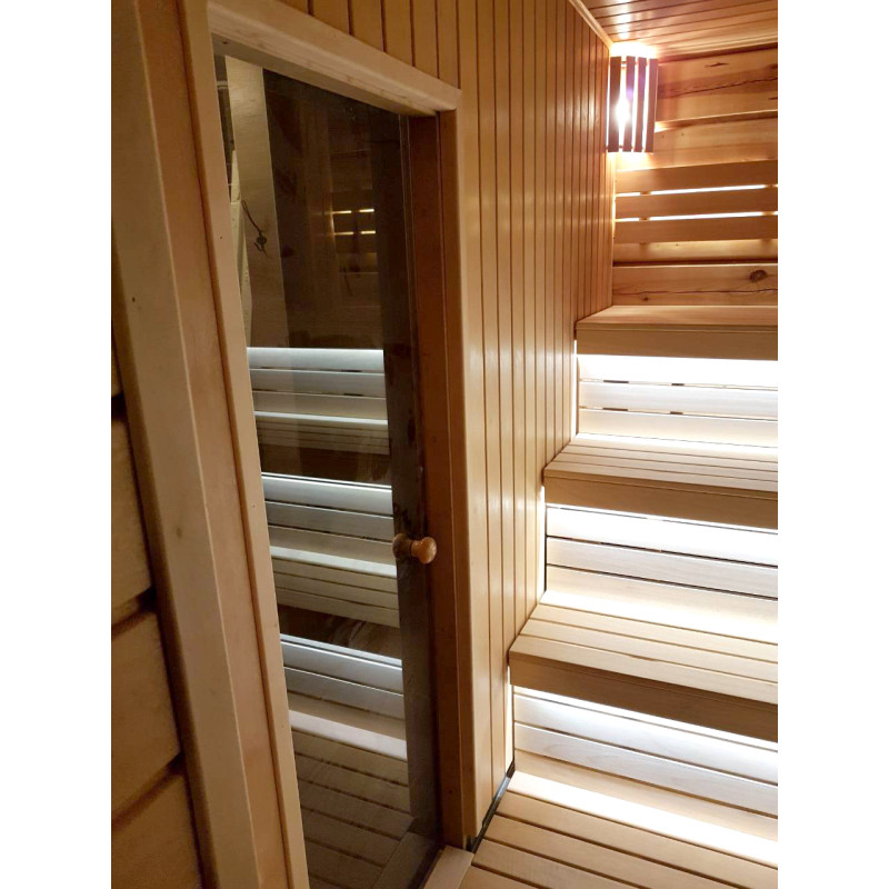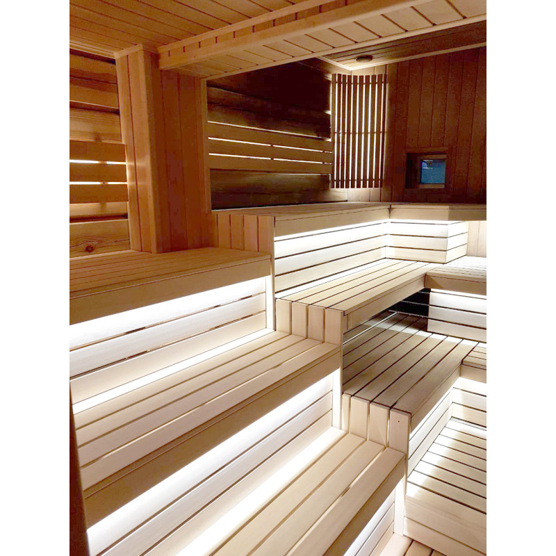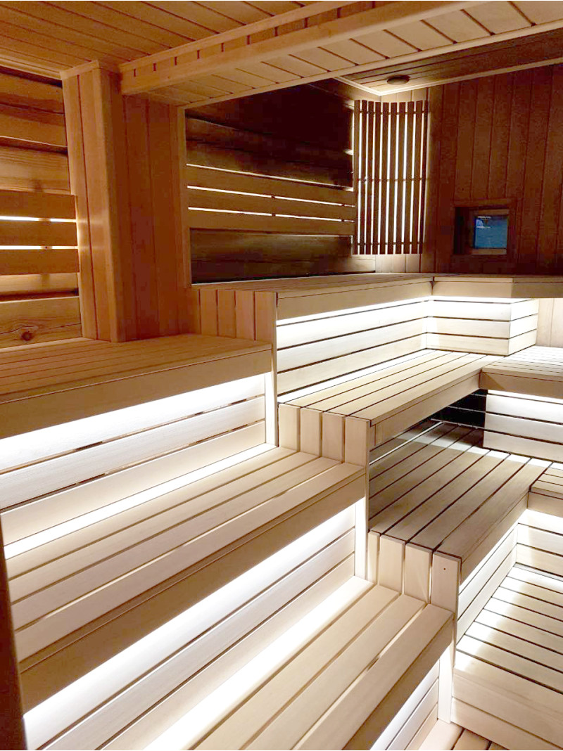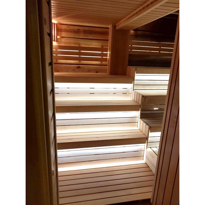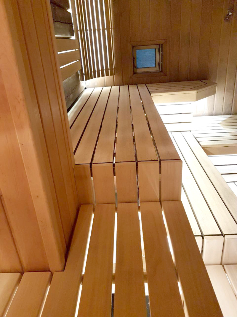 Pod ležalniki je nameščena topla bela LED osvetlitev, ki daje savni občutek prostornosti in udobja. Za stensko razsvetljavo je bila izbrana svetilka z ustreznim lesenim pokrovom.