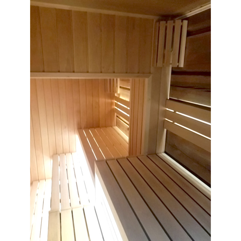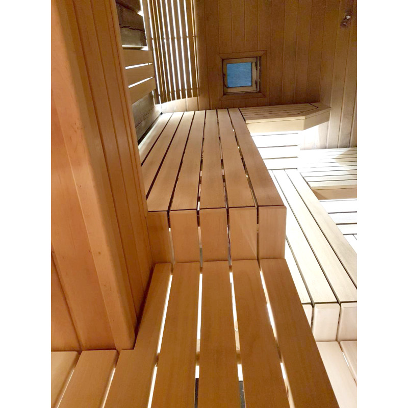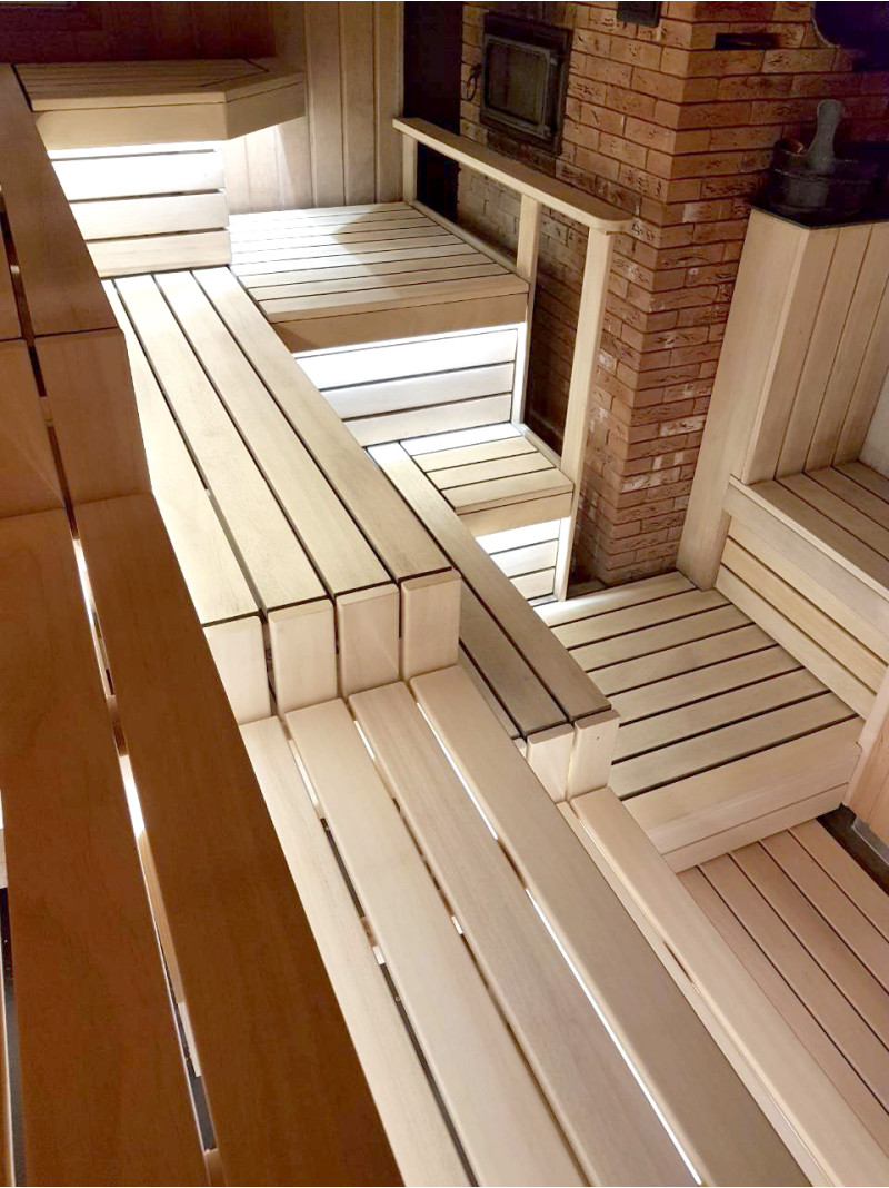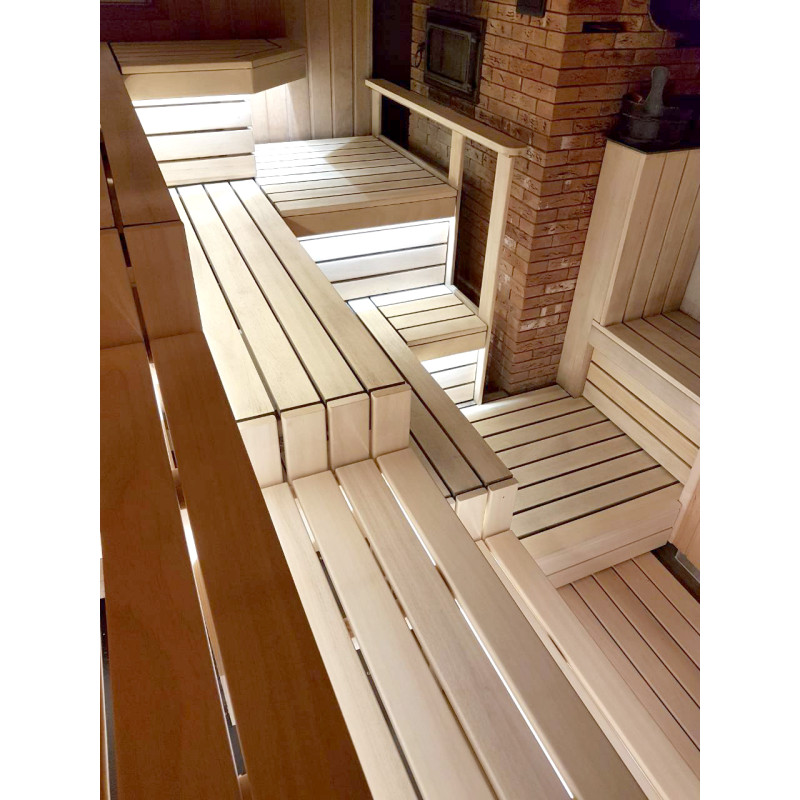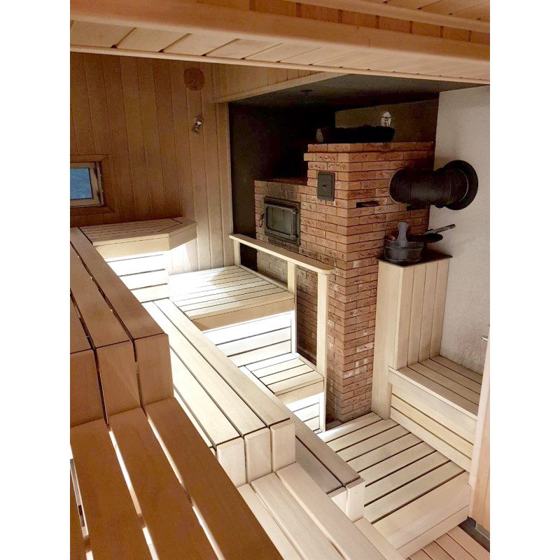 Les je impregniran, zaščiten pred visoko vročino in pripravljen za dolgotrajno uporabo. Klopi in naslonjala so mazani s posebnim oljem za les savne.
