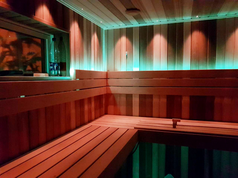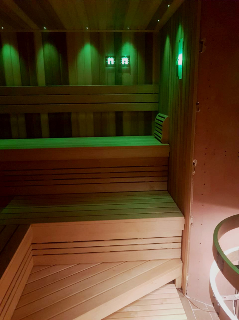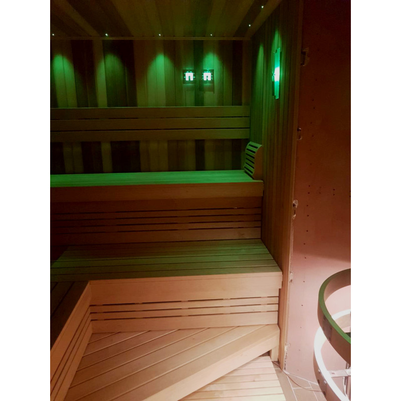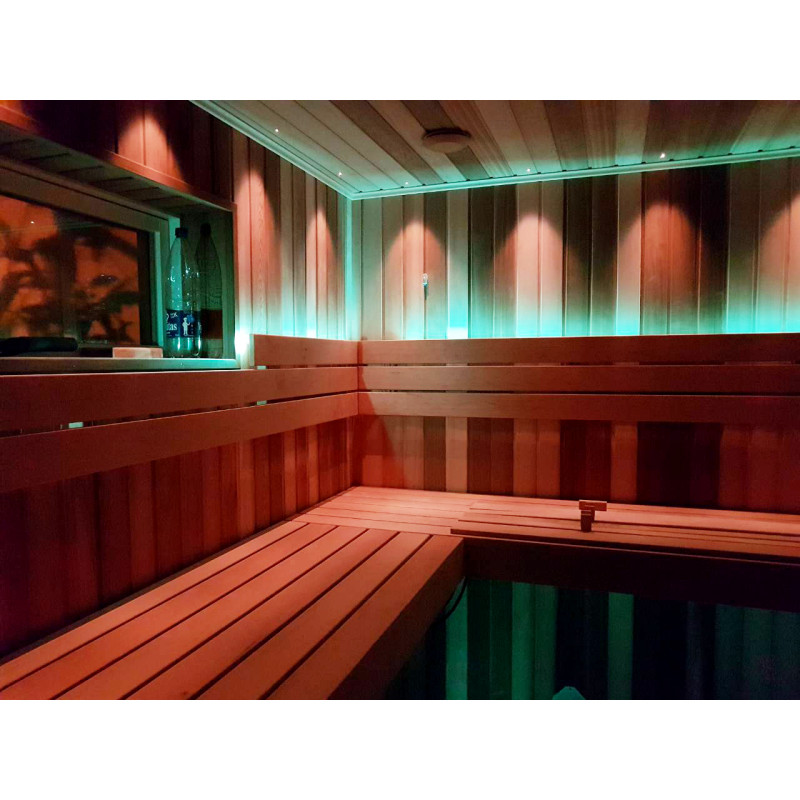 Za elegantno osvetlitev savne: projektor za osvetlitev iz optičnih vlaken Cariitti, svetilke pod naslonjali in klopmi ter osvetljeni termometri. Svetilke lahko spreminjajo barve – odvisno od vaših želja in razpoloženja.