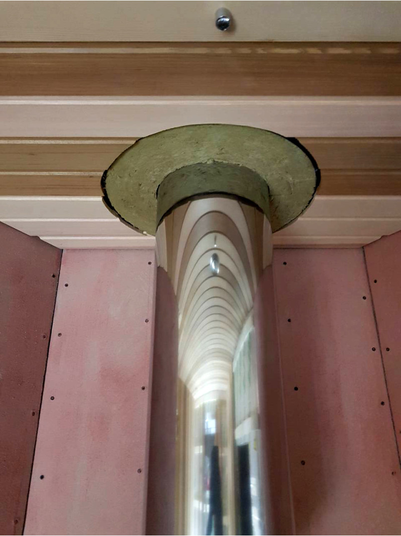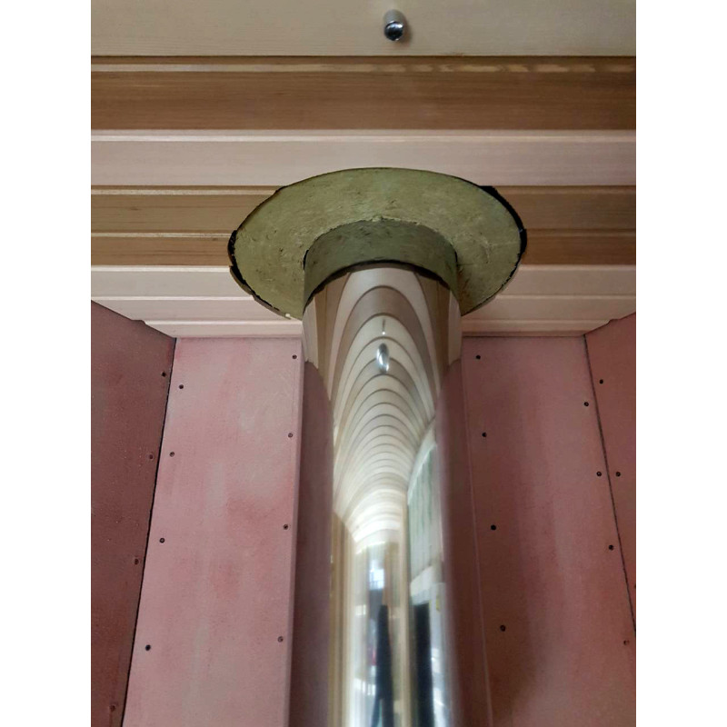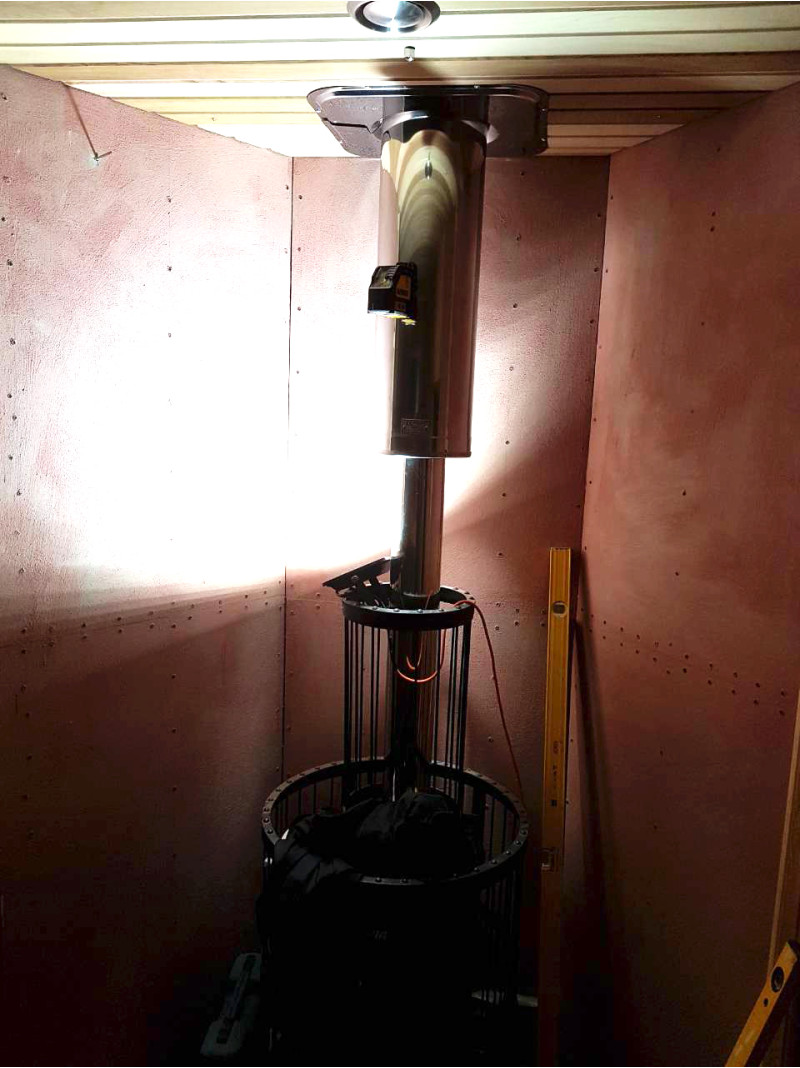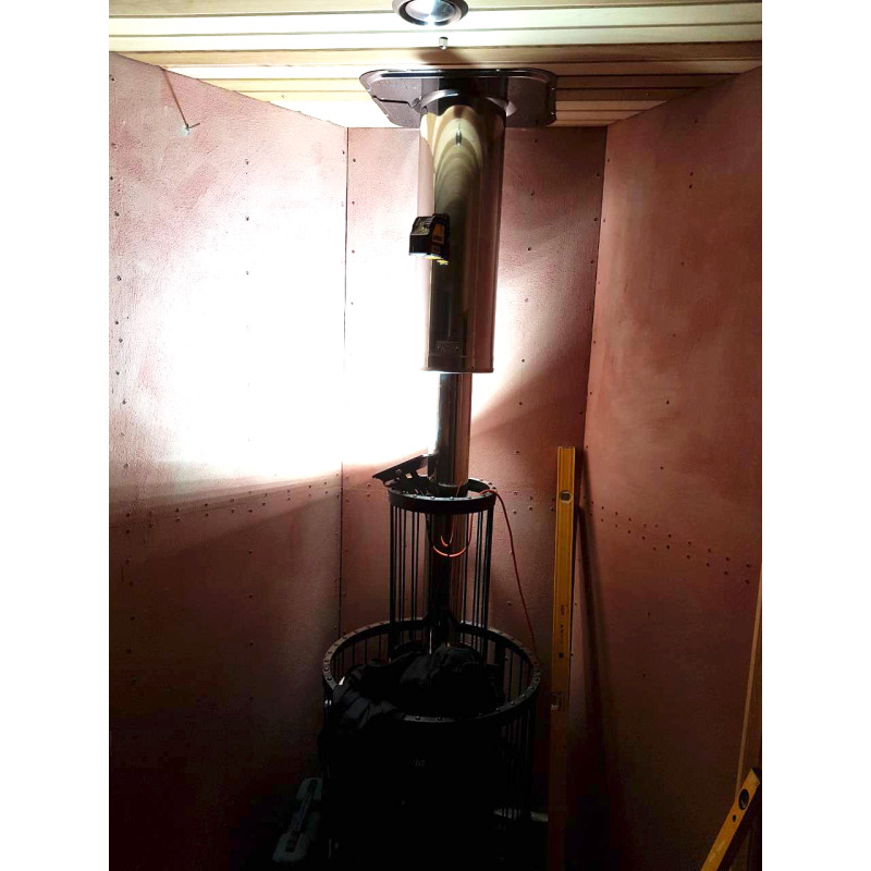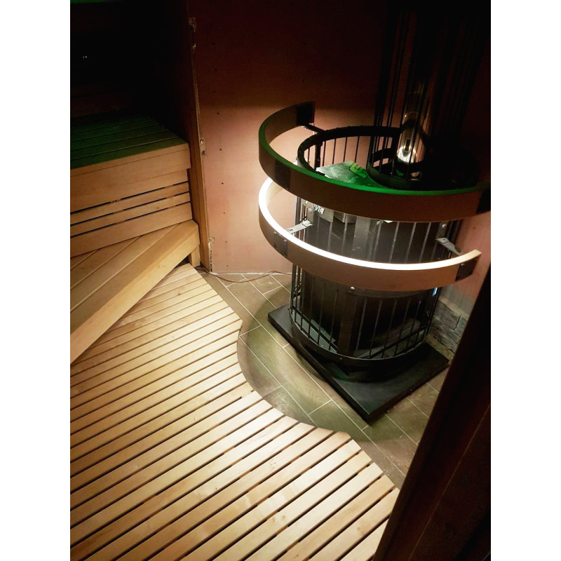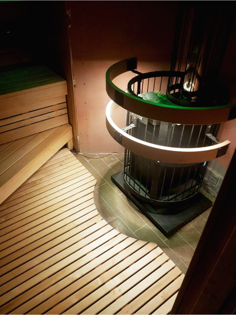 Izbrana je bila peč na drva Harvia Legend 240 DUO z zunanjim kuriščem, litoželeznimi vrati in steklenim oknom, napolnjenim z veliko količino milnice, ki omogoča uživanje v toplini, ki jo izžarevajo tudi ob odsotnosti visokih temperatur. za srednje veliko savno. Ohišja peči - Harvia Legend z osvetlitvijo.