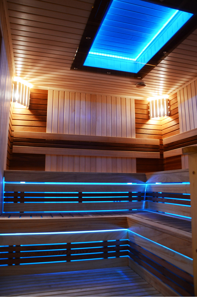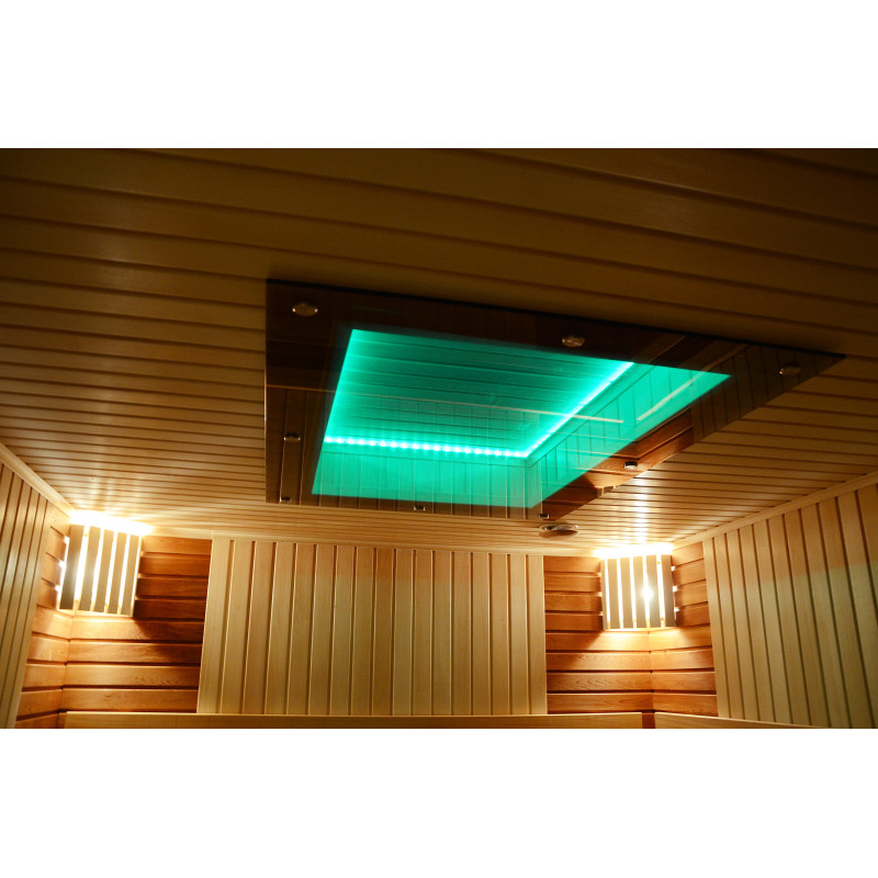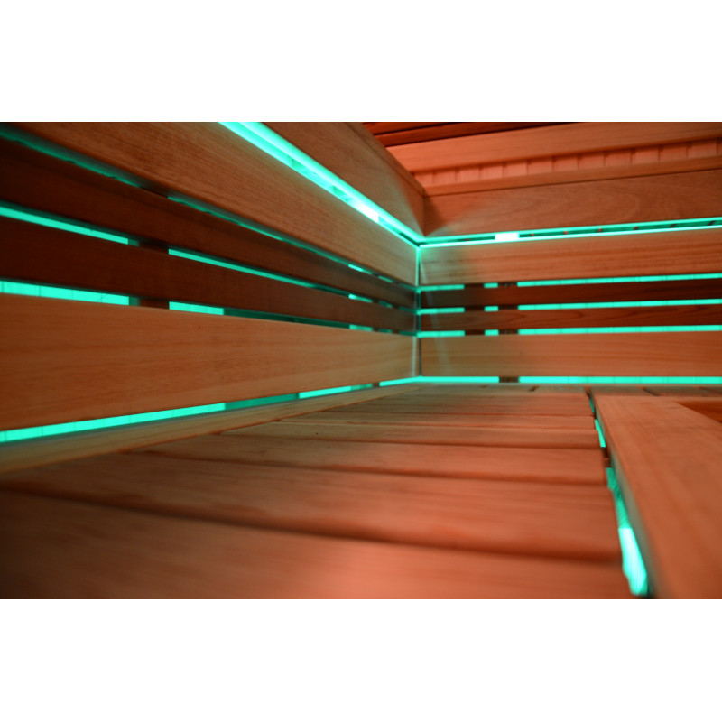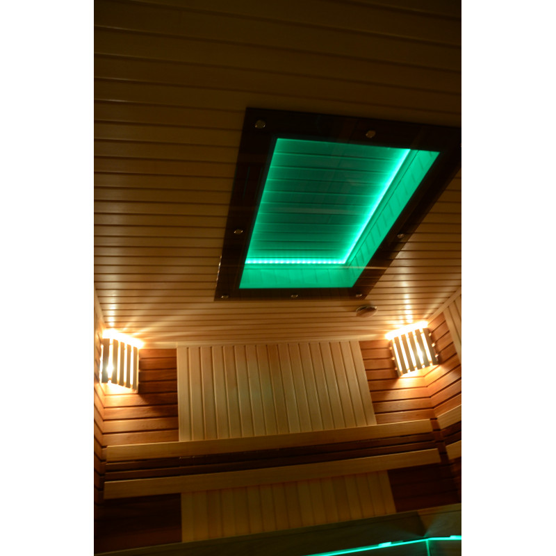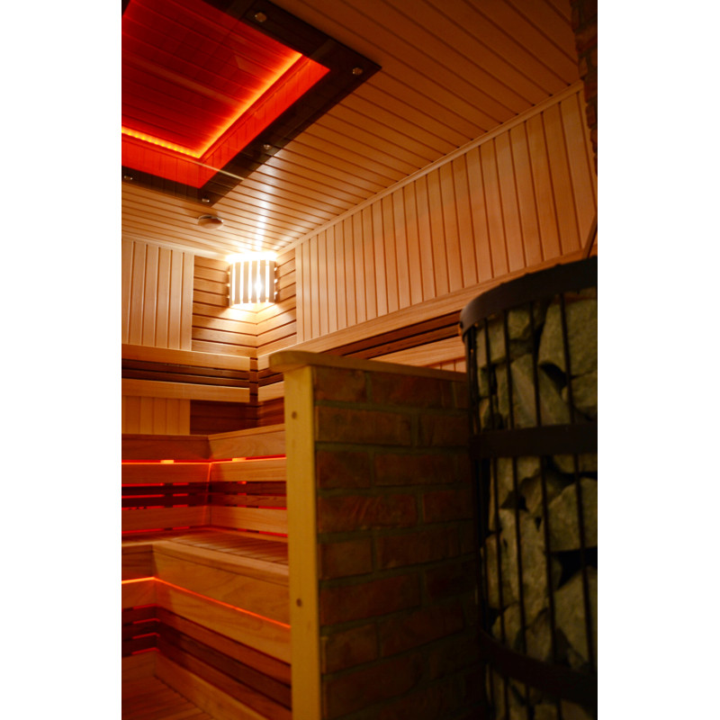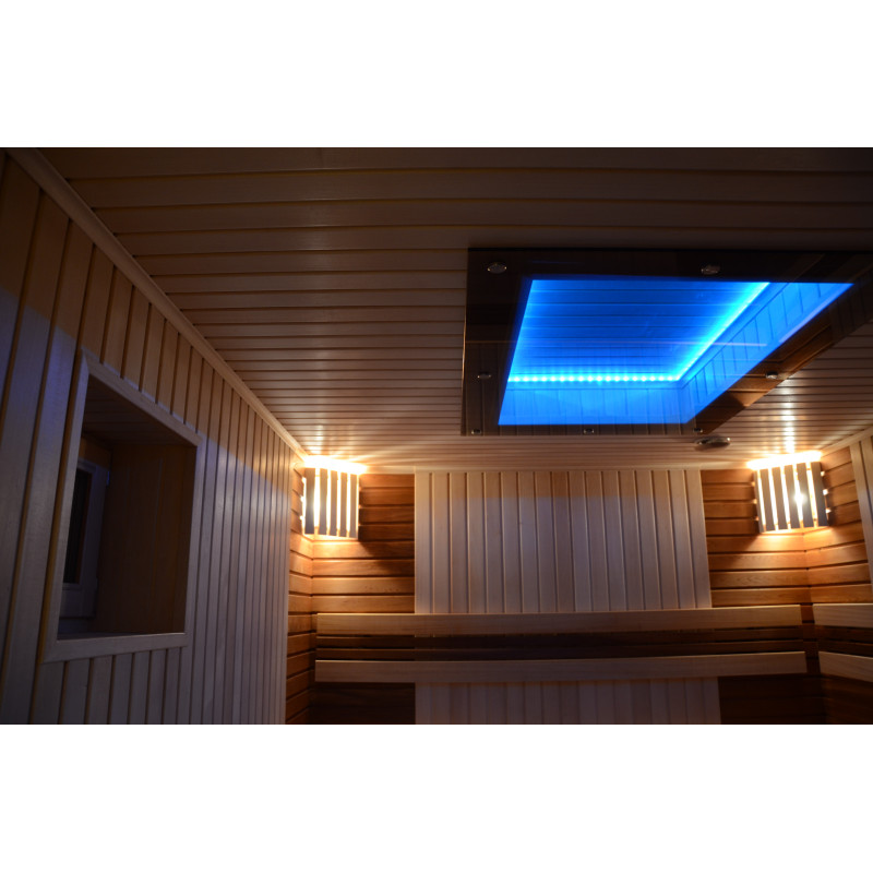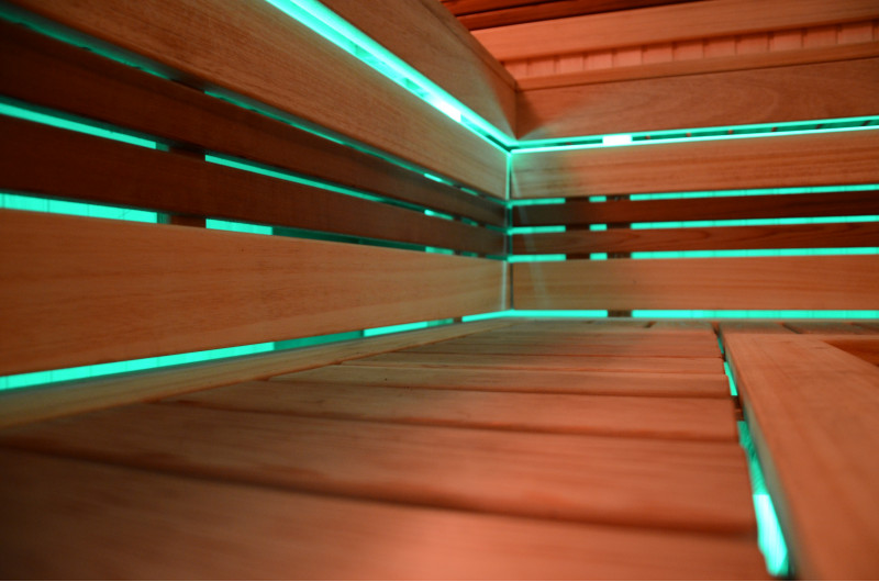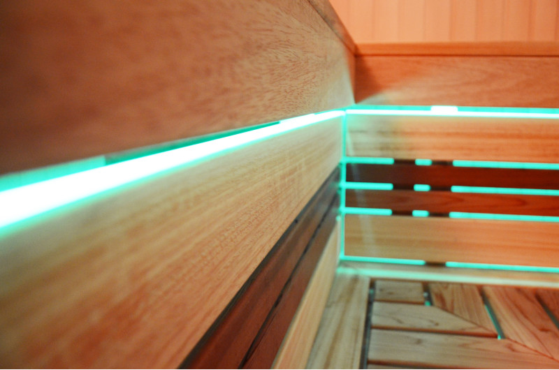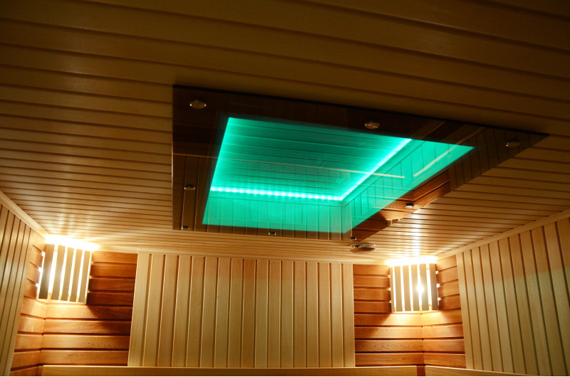 Na stropu in pod klopmi - LED RGB barvna osvetlitev, katere barve je mogoče spreminjati, da ustvarite pravo vzdušje in razpoloženje. Stenska razsvetljava - LED bele svetilke tople barve z lesenimi pokrovi. Prevleke pomagajo pri zatemnitvi svetlobe, dodajo več udobja v savno. Prav tako ščiti svetilke pred vodo, paro in toploto.