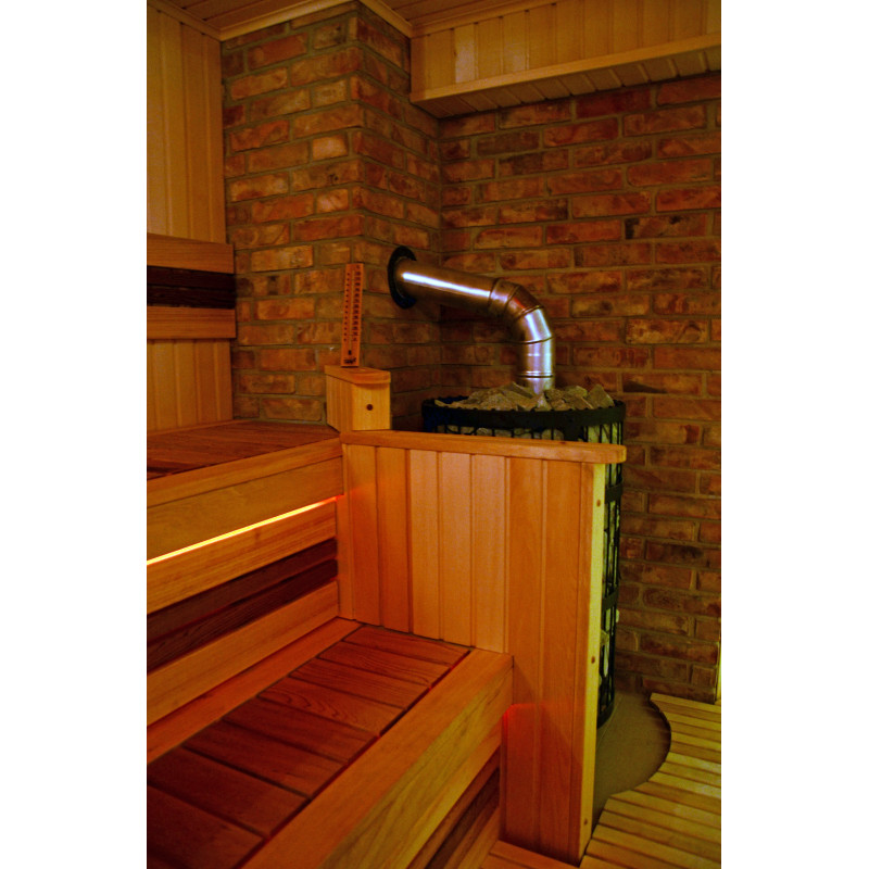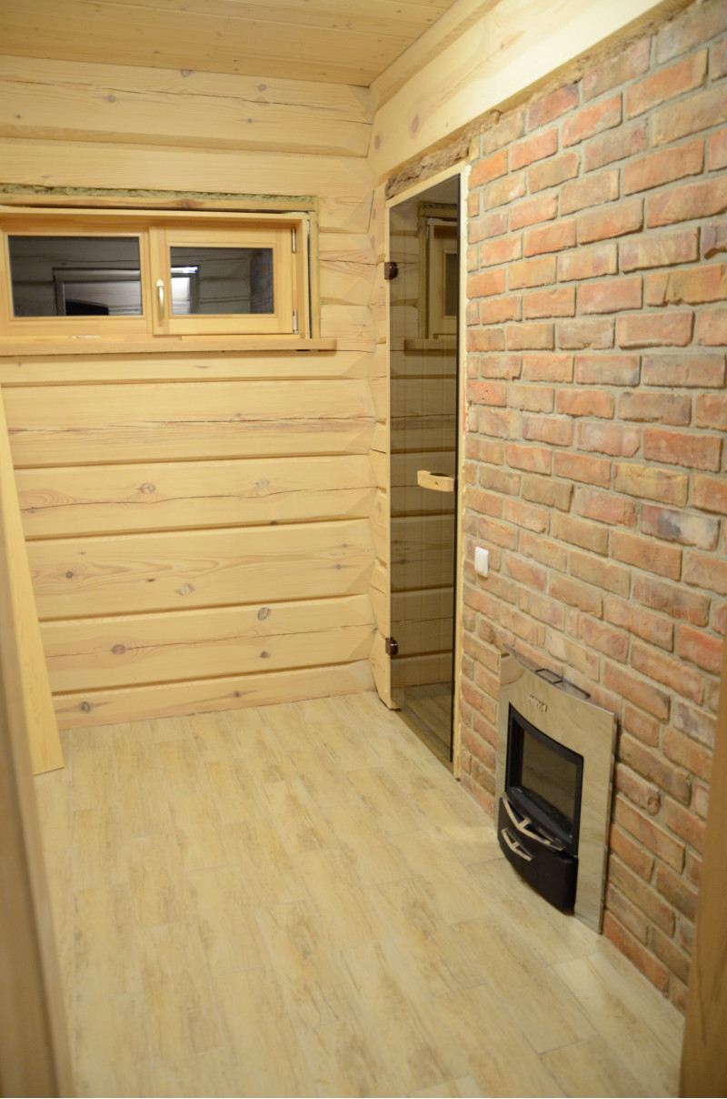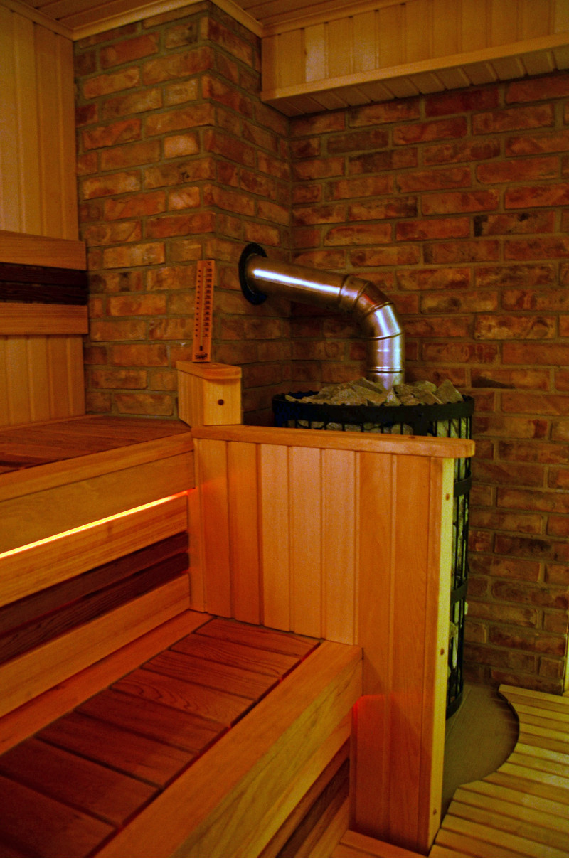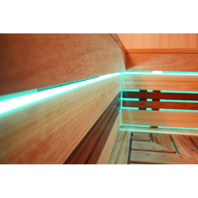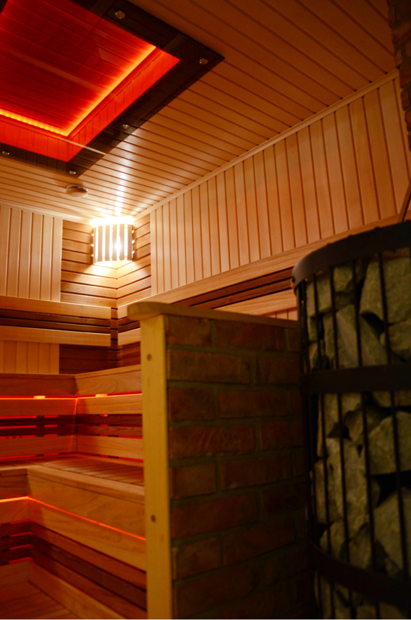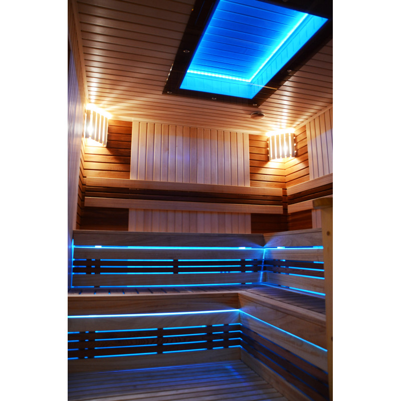 Na stropu in pod klopmi - LED RGB barvna osvetlitev, katere barve je mogoče spreminjati, da ustvarite pravo vzdušje in razpoloženje. Stenska razsvetljava - LED bele svetilke tople barve z lesenimi pokrovi. Prevleke pomagajo pri zatemnitvi svetlobe, dodajo več udobja v savno. Prav tako ščiti svetilke pred vodo, paro in toploto.