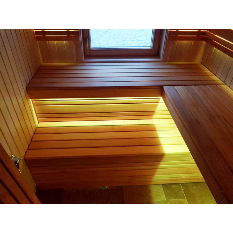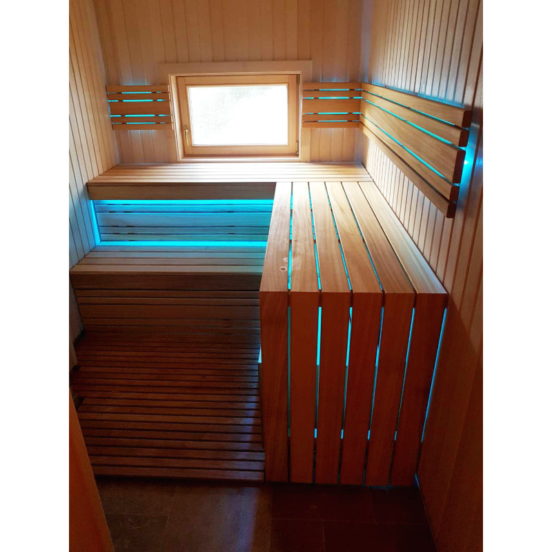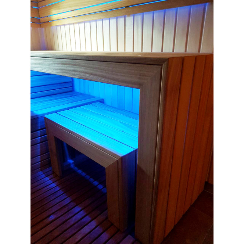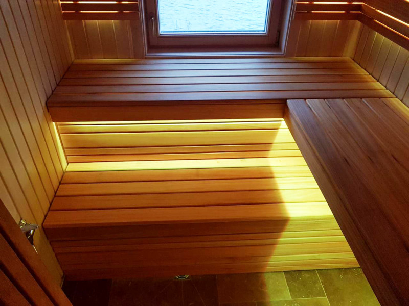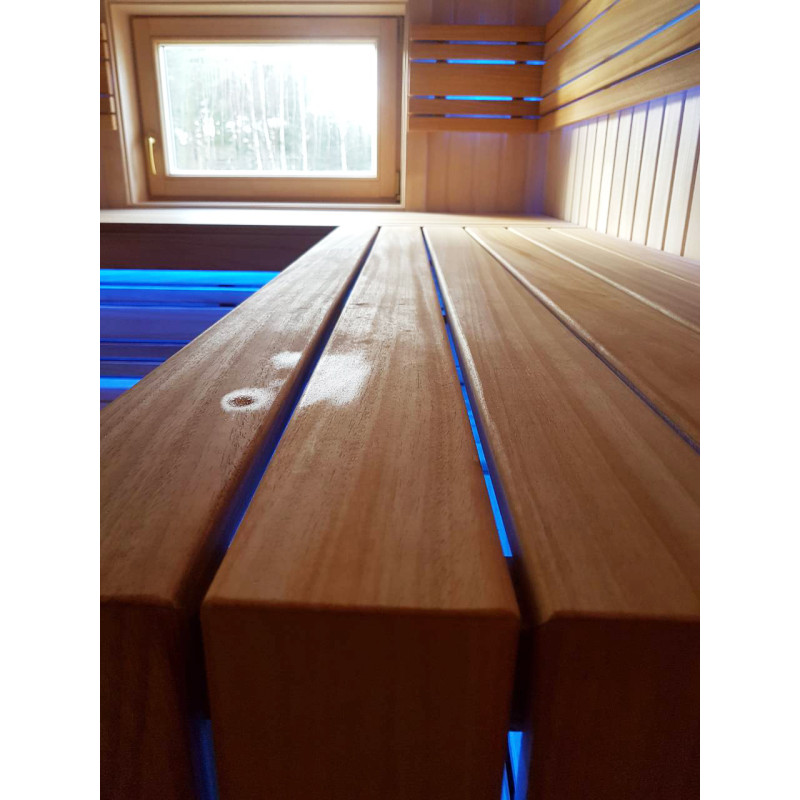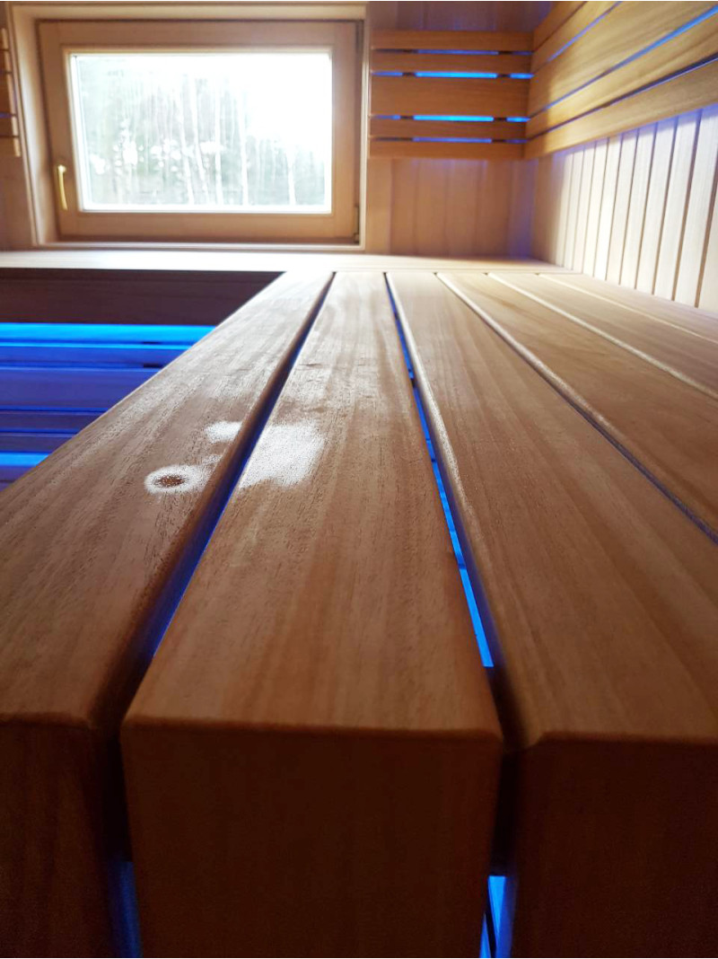 Notranji leseni detajli in klopi savne so iz afriškega lesa abachi. Zaradi svoje strukture je ta les mehak in zelo nizko segreje, zaradi česar je zelo primeren za vgradnjo savn klopi.