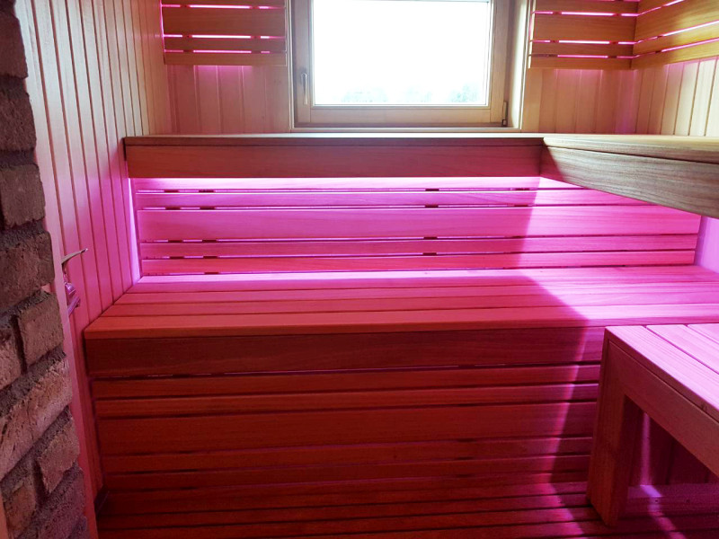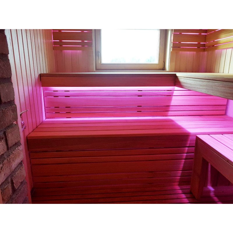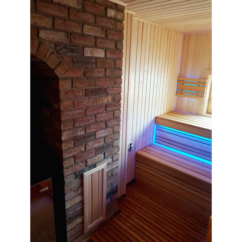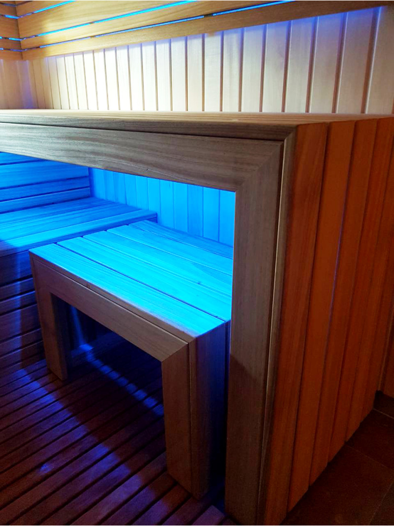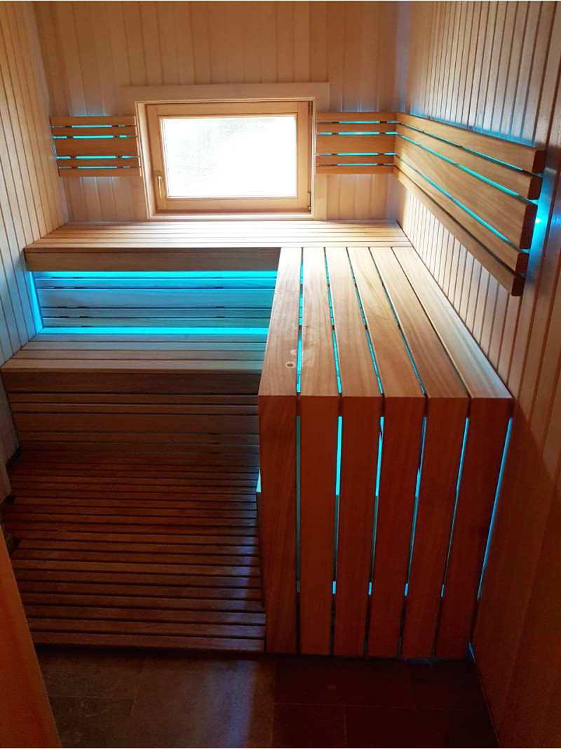 Notranji leseni detajli in klopi savne so iz afriškega lesa abachi. Zaradi svoje strukture je ta les mehak in zelo nizko segreje, zaradi česar je zelo primeren za vgradnjo savn klopi.