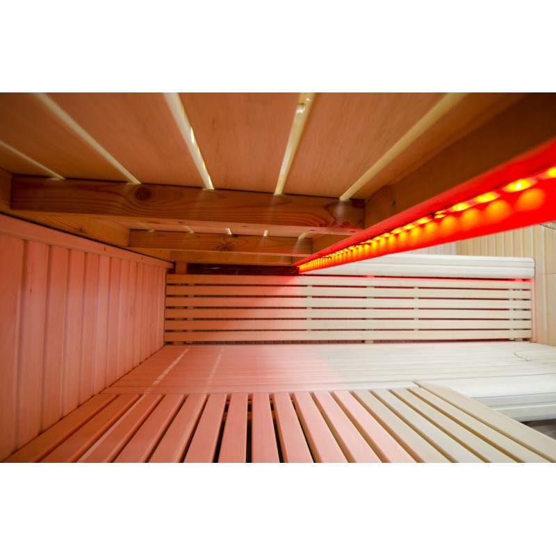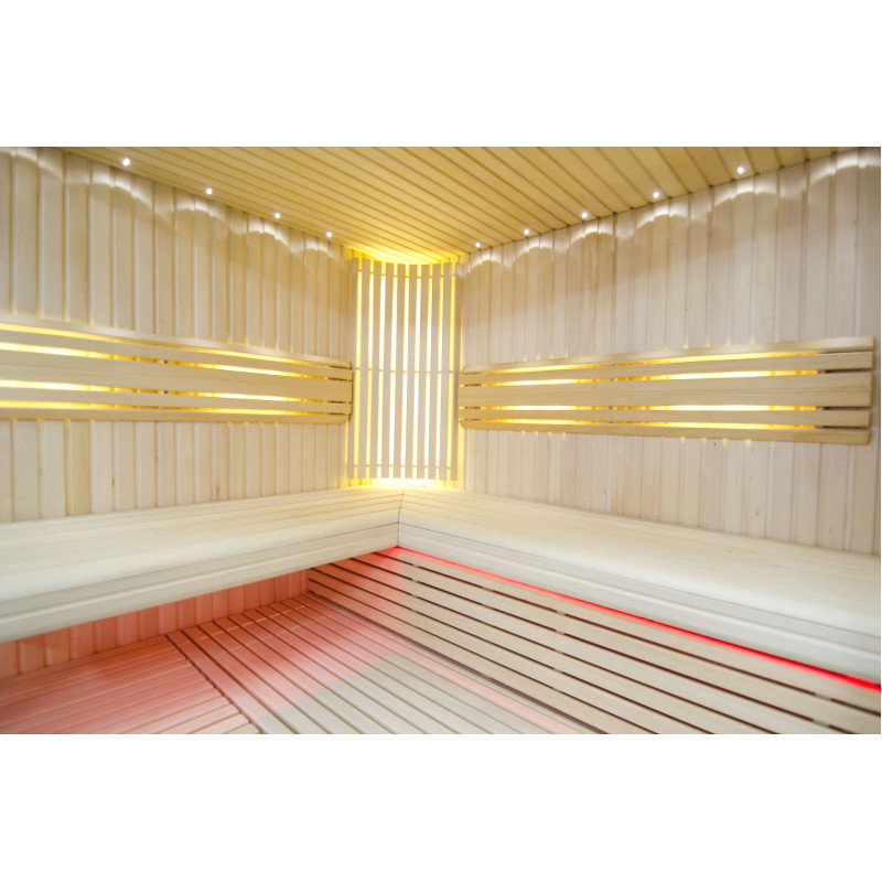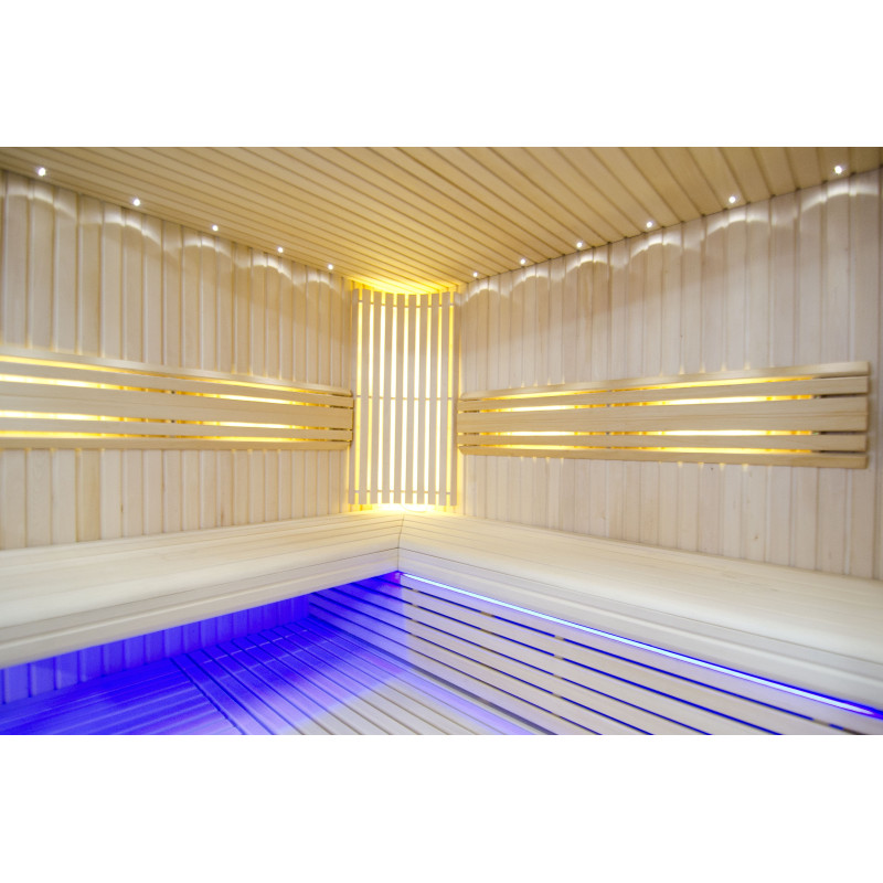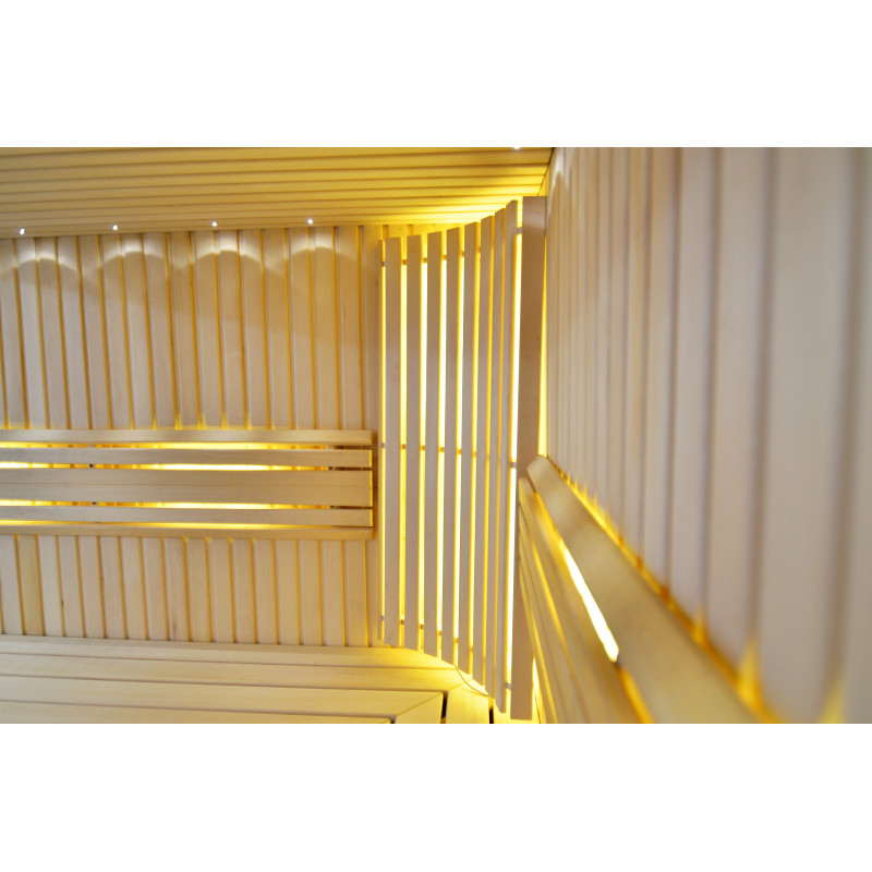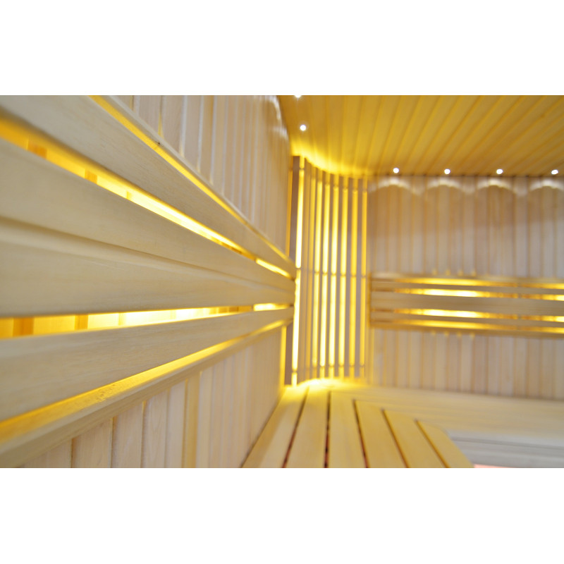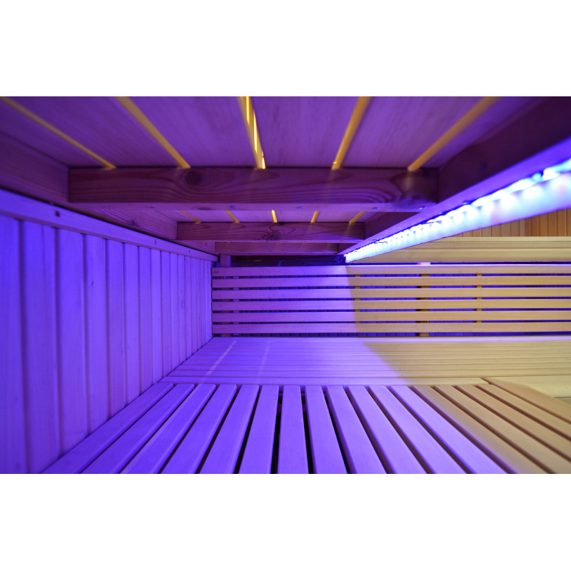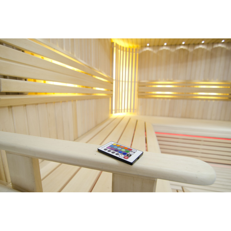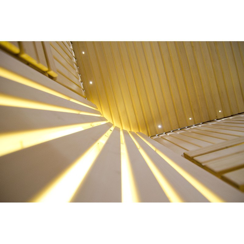 Strop je osvetljen z belo LED osvetlitvijo "luna" - dobra alternativa svetlobi iz optičnih vlaken. Na stenah pod naslonjali - LED bela topla osvetlitev, ki odlično poudari teksturo lesa. Pod klopmi - LED RGB barvna osvetlitev, katere barve lahko enostavno upravljate z daljinskim upravljalnikom za ustvarjanje želenega vzdušja savne.