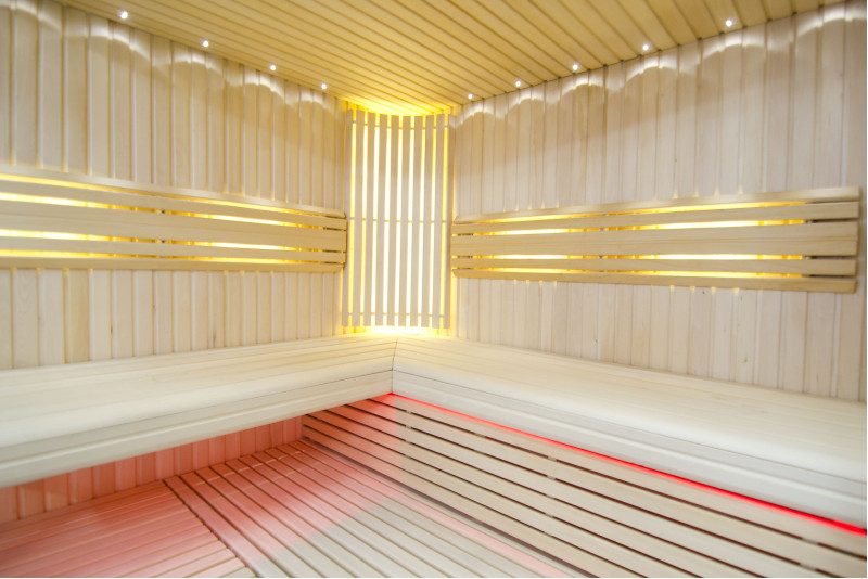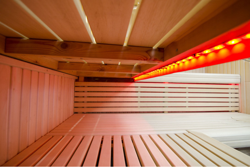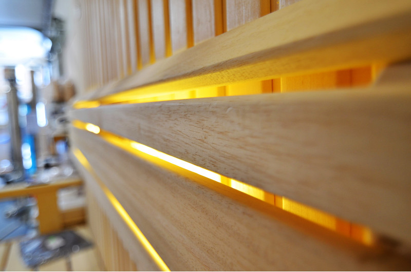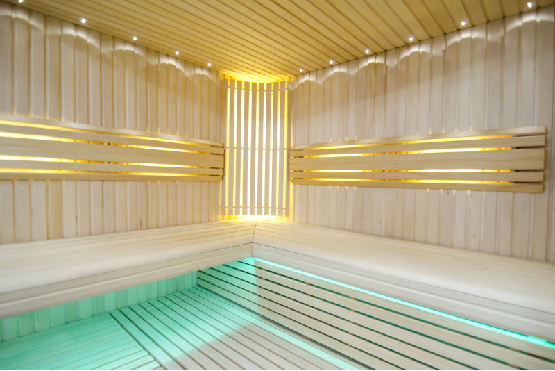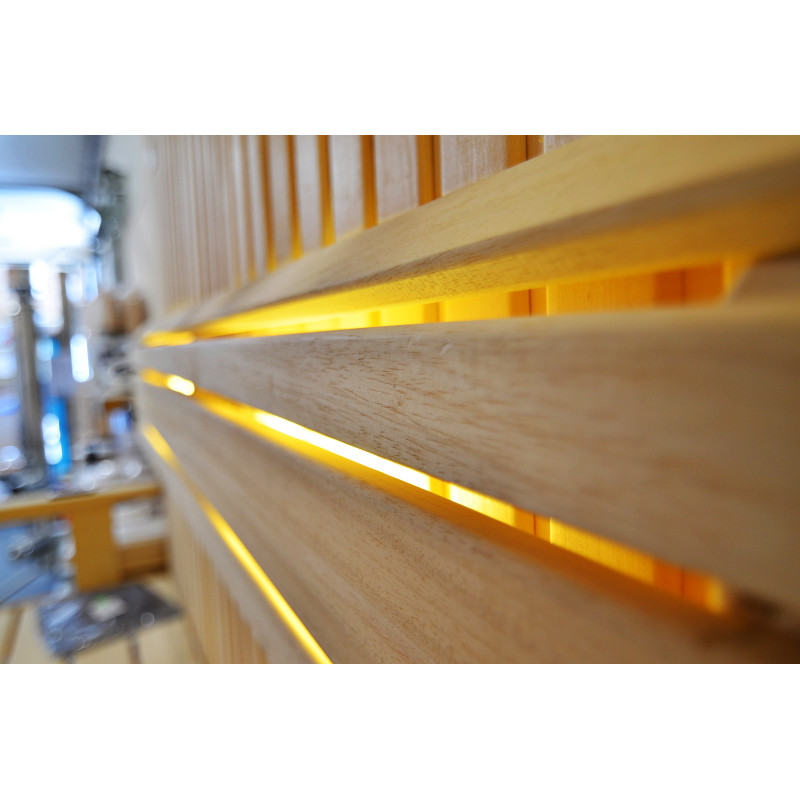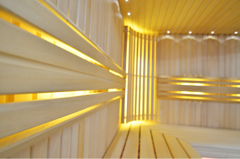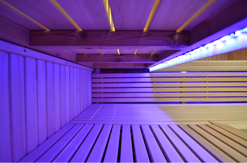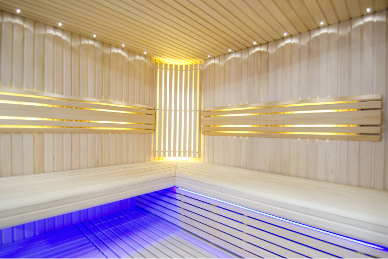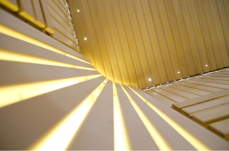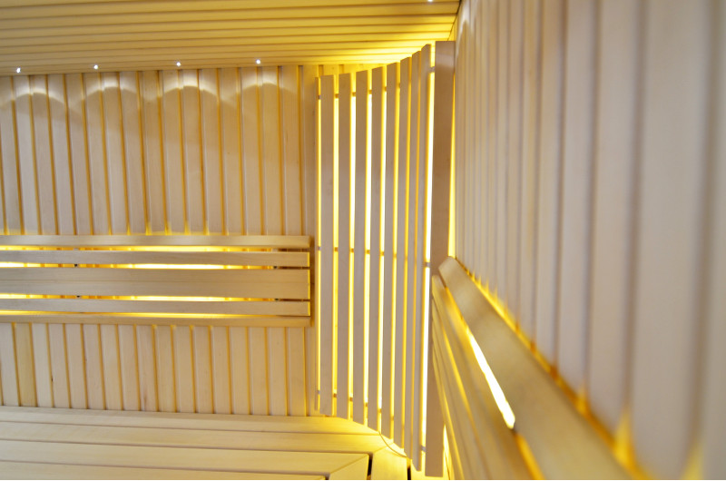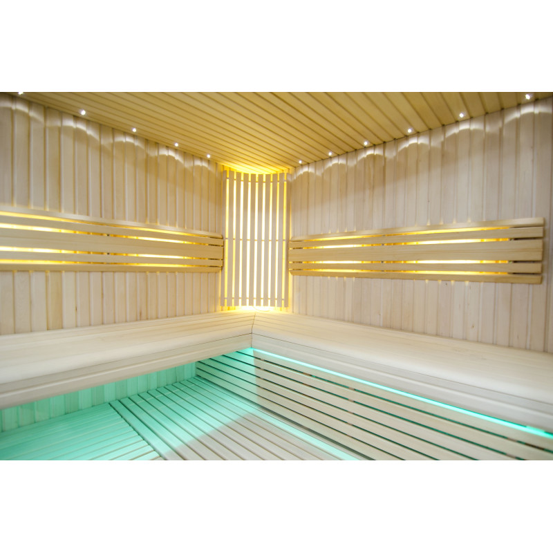 Strop je osvetljen z belo LED osvetlitvijo "luna" - dobra alternativa svetlobi iz optičnih vlaken. Na stenah pod naslonjali - LED bela topla osvetlitev, ki odlično poudari teksturo lesa. Pod klopmi - LED RGB barvna osvetlitev, katere barve lahko enostavno upravljate z daljinskim upravljalnikom za ustvarjanje želenega vzdušja savne.