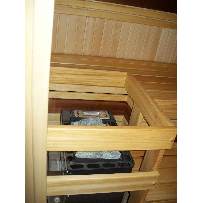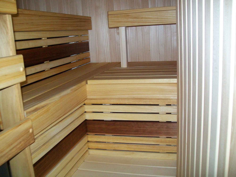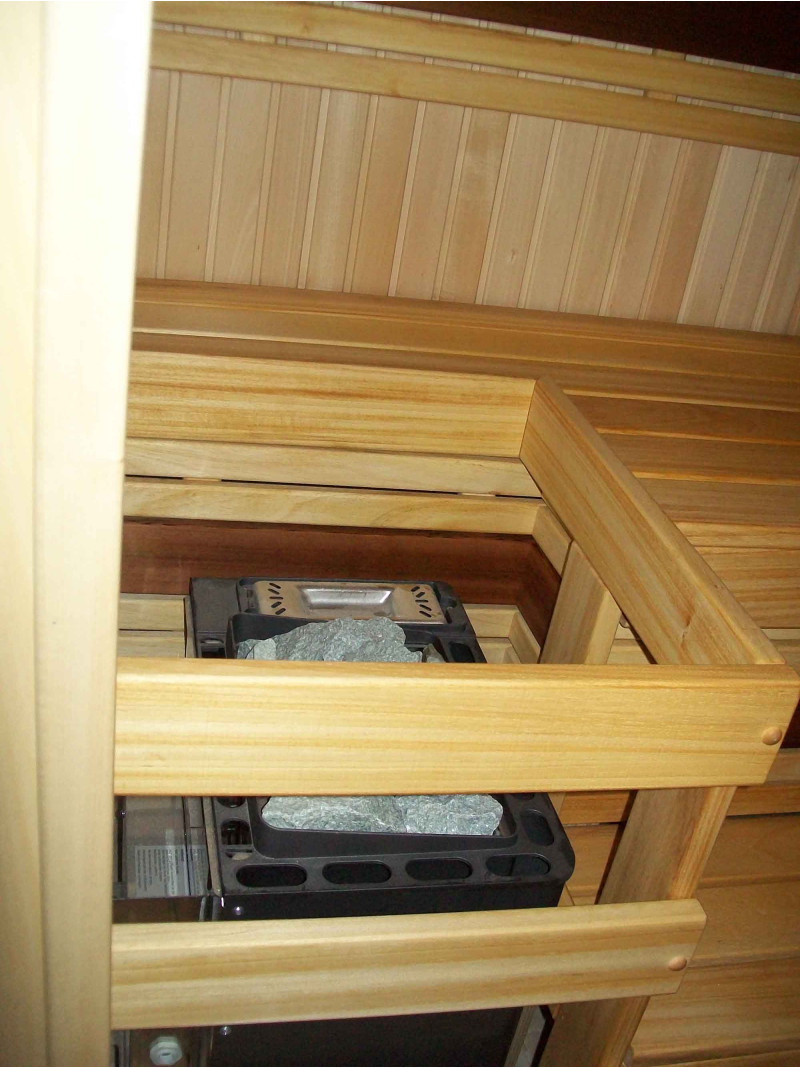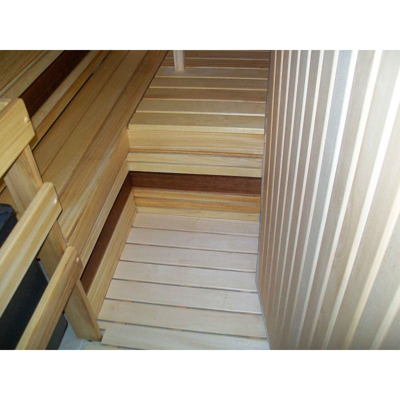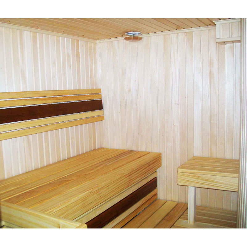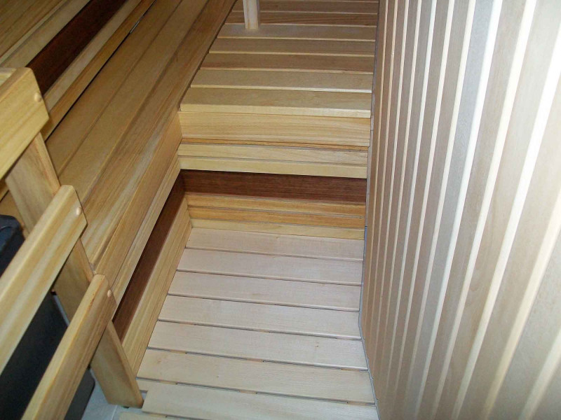 Za montažo stropov in sten savne se uporablja lipa 15 mm - elegantna, lahka in oddaja prijeten vonj po lesu. Za klopi in naslonjala so izbrali najkvalitetnejši les cedre in abachija. Ta les je kakovosten, ne le lepega videza, ampak se tudi najmanj segreje v primerjavi z drugimi vrstami lesa, zato se je takih klopi prijetno in varno dotikati. Talna rešetka - les črne jelše.