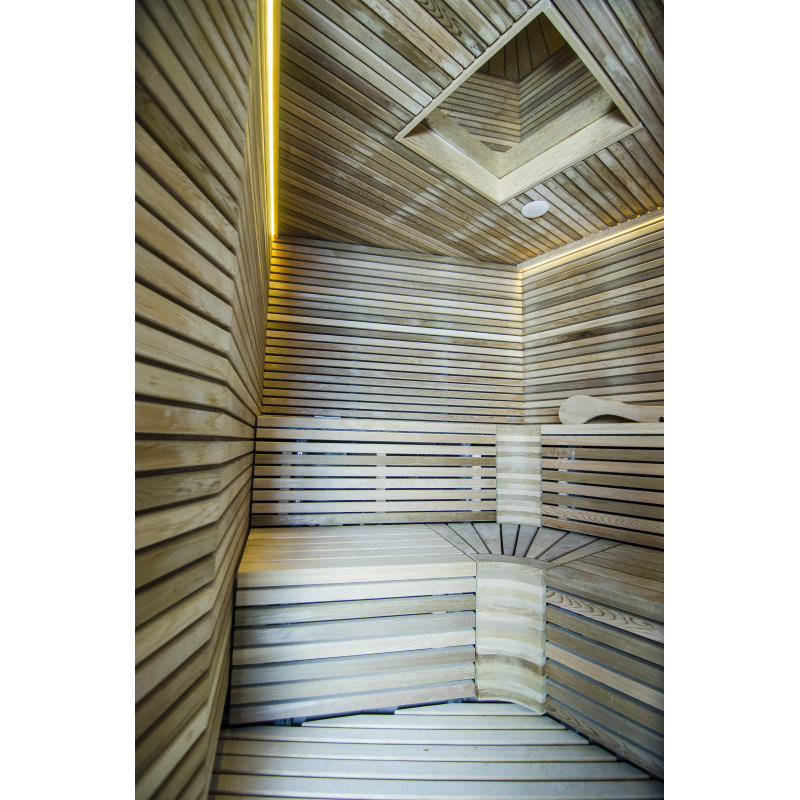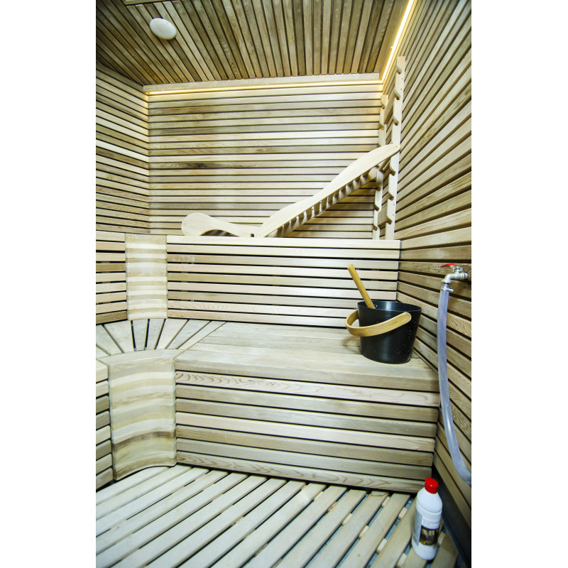 Osvetlitev - toplo bel LED trak. Strop je opremljen s polirano inox pločevino, ki je opremljena s sistemom razsvetljave "Zvezdno nebo". Je idealna rešitev za osvetlitev vaše savne ali druge temne sobe.