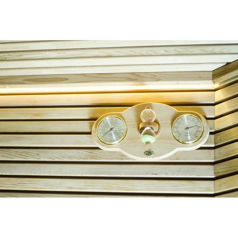 Pripomočki za savno: komplet vedra in zajemalke, leseni termometer z higrometrom in peščena ura.