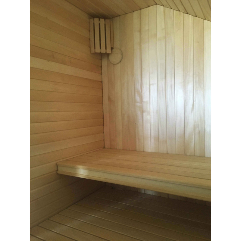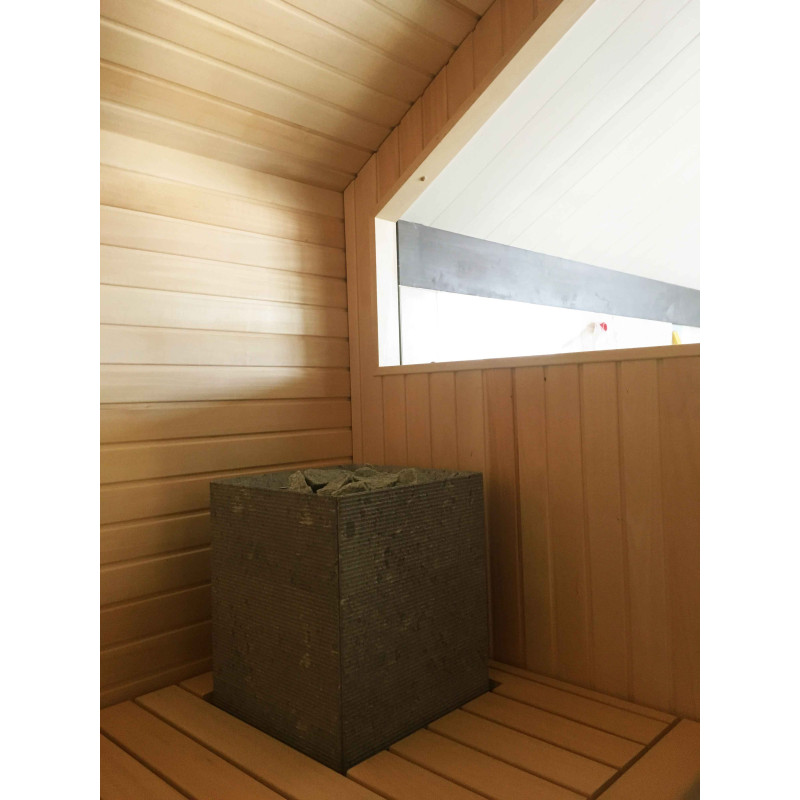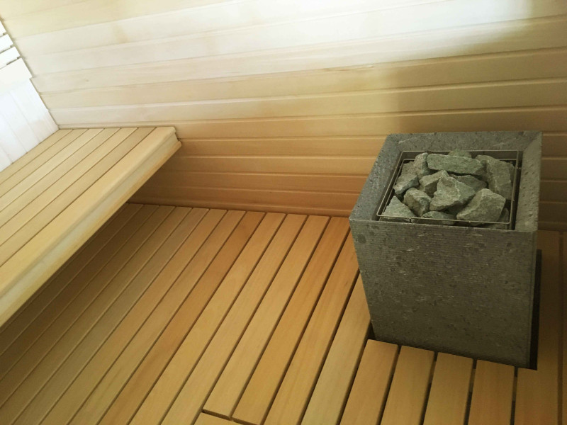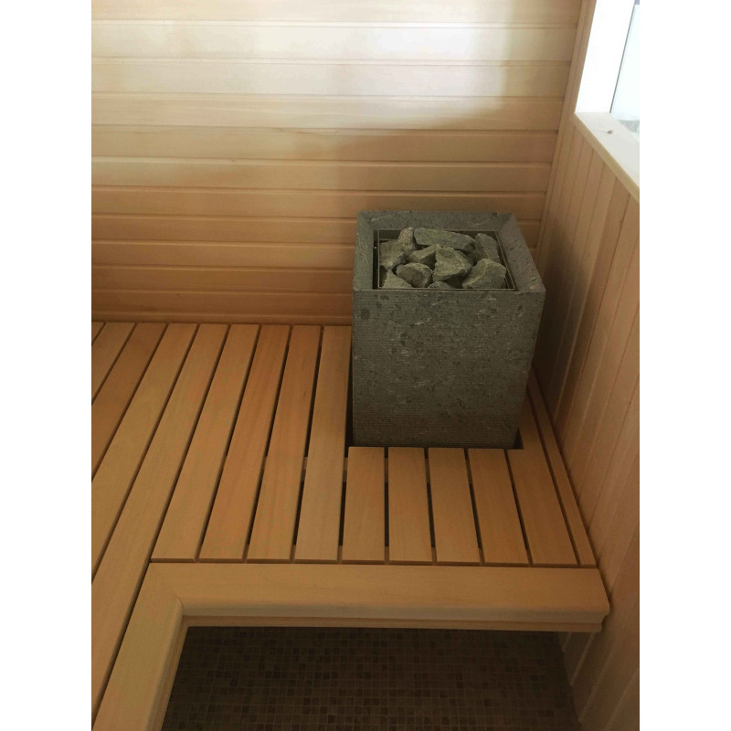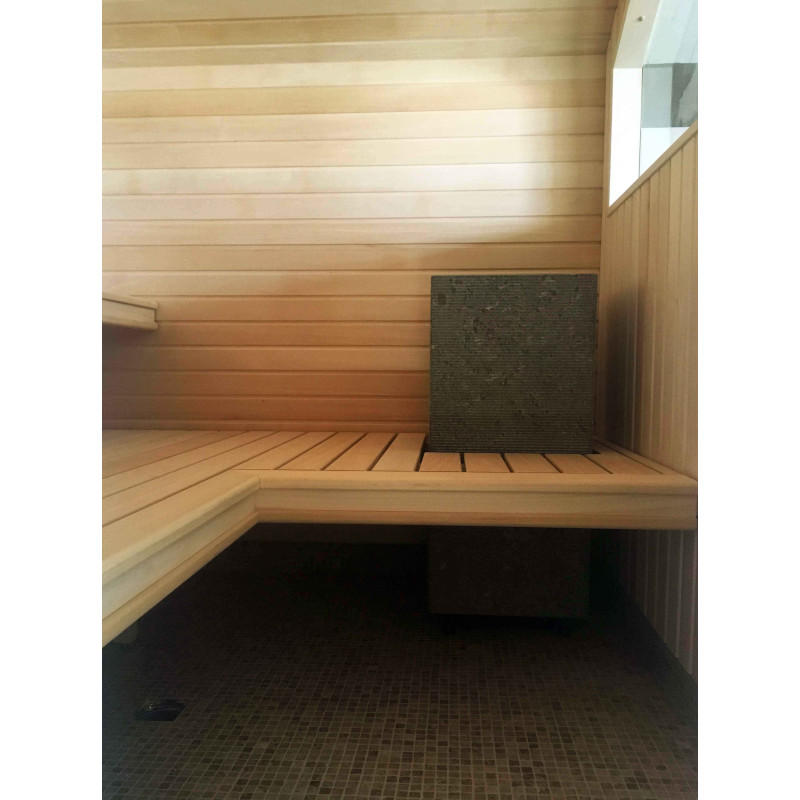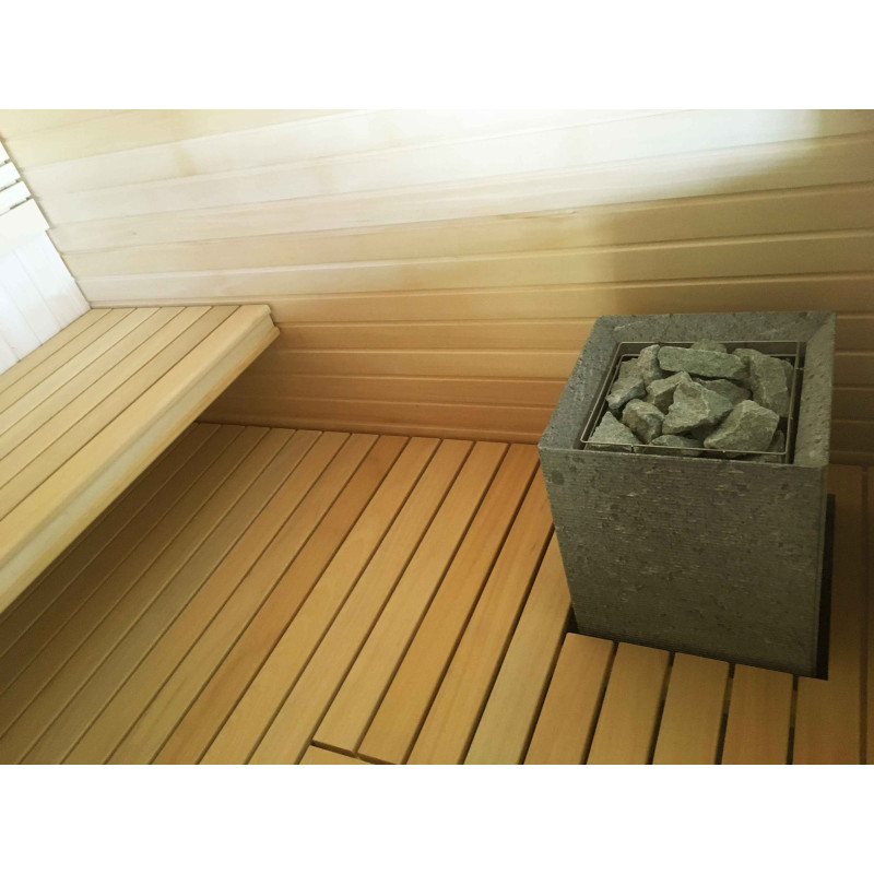 Stene in stropi savne so iz lipovega lesa. Lipova obloga daje savni več svetlobe in oddaja prijeten vonj po lesu. Za klopi, naslonjala in ograjo okoli grelnika smo izbrali visokokakovostne opaže iz abachi lesa. Ta mehak in neogrevan les je odlična izbira za klopi, podpore, kjer se les dotika kože, ne da bi se opekel. To zagotavlja udobje in odličen počitek v savni. Klopi, nosilci in stene so lakirane, v celoti pripravljene za dolgotrajno uporabo.
