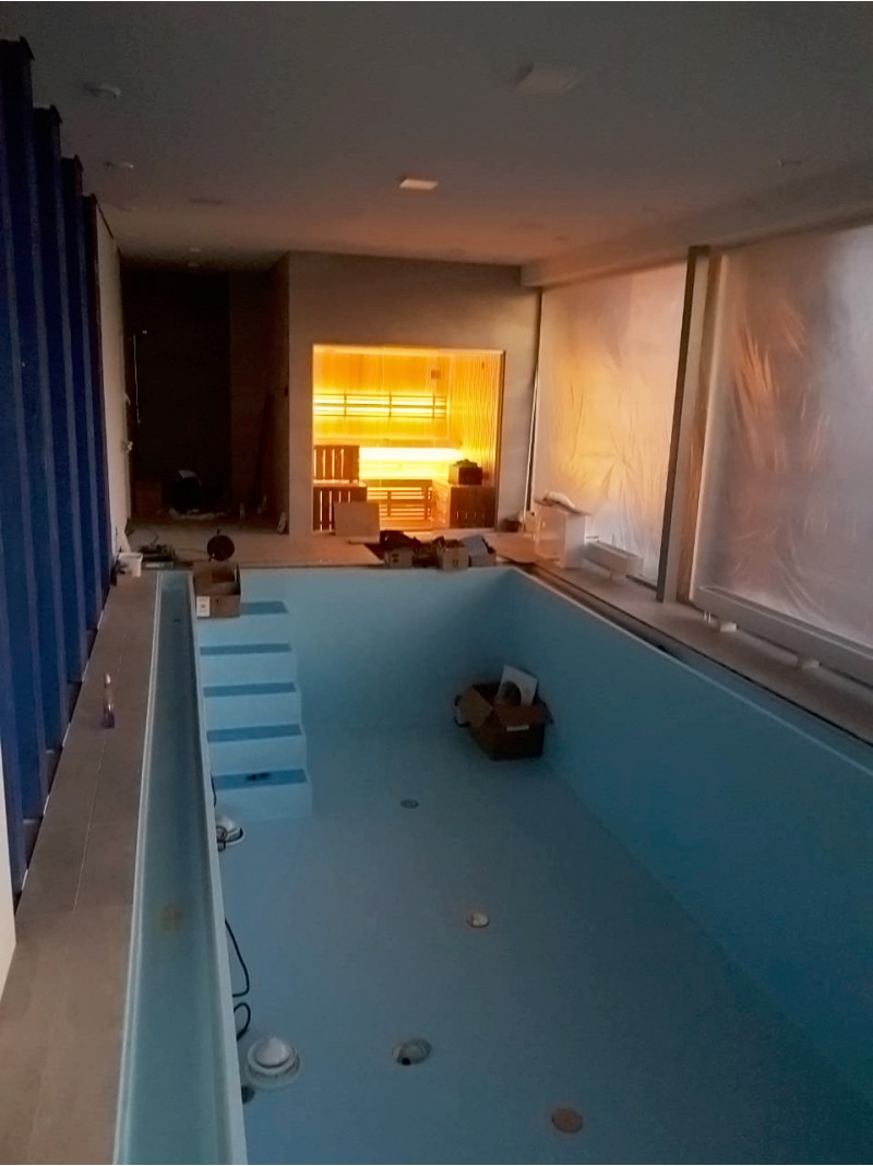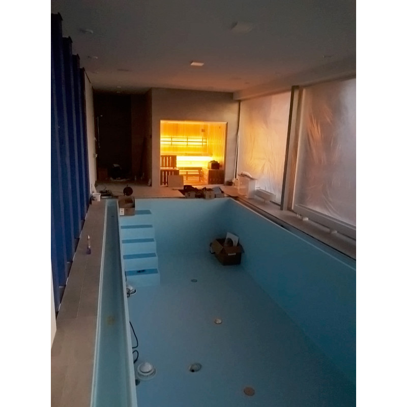 Montaža steklene vitrine - tonirano 8 mm kaljeno steklo v aluminijast okvir. Zahvaljujoč stekleni vitrini se odpre pogled na območje bazena, manjši prostor savne se poveča, savna pa dobi več svetlobe.
