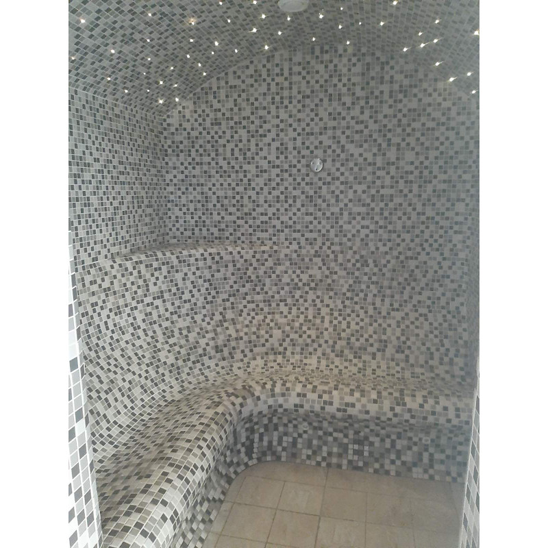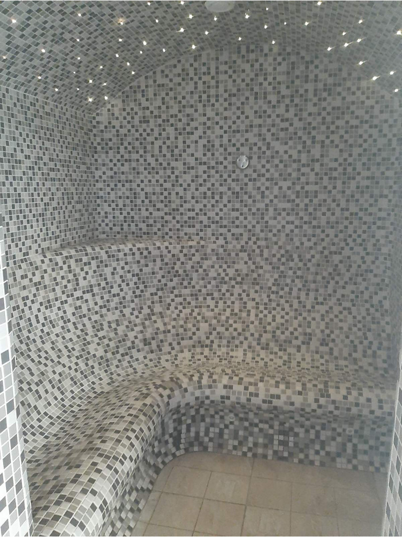 - Parna savna – uporabljeni materiali, ki prenesejo izjemno visoke temperature in zelo visoko vlažnost. Strop je obokastega tipa, tako da parni kondenz ne kaplja na ljudi, ki uživajo v savni. Ploščice so bile izbrane za dekoracijo in razsvetljavo z optičnimi vlakni za strop, ki ustvarja učinek zvezdnega neba. Klopi so še posebej udobne oblike.