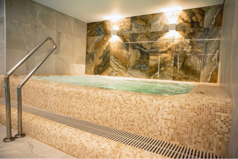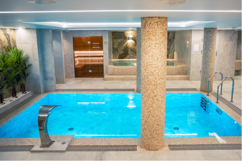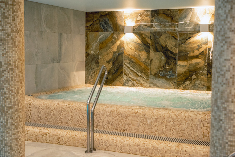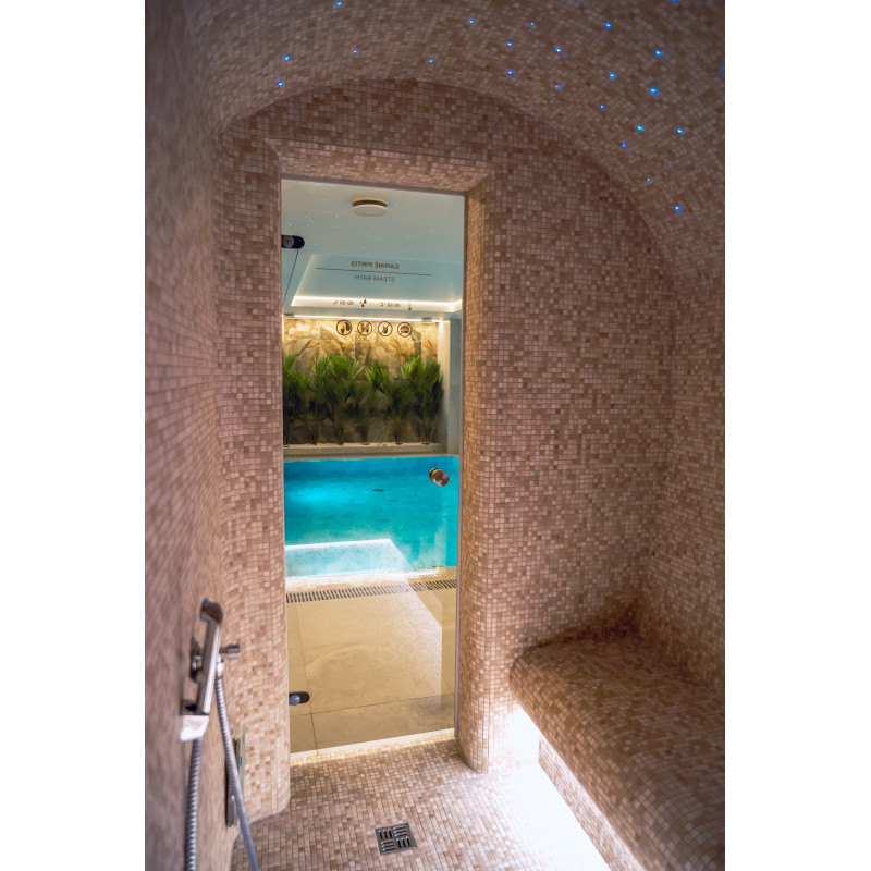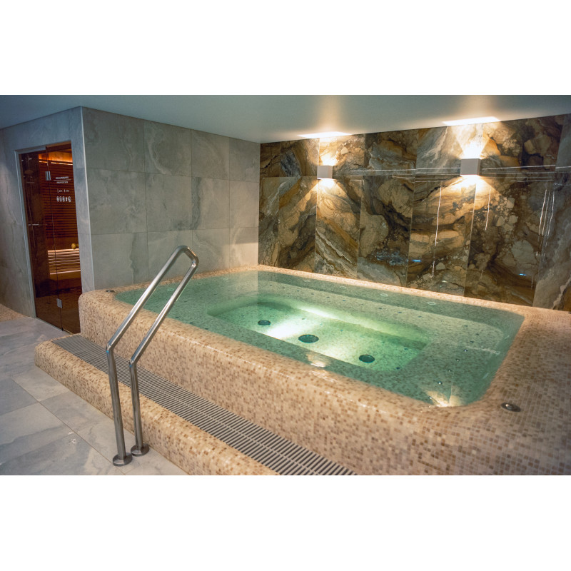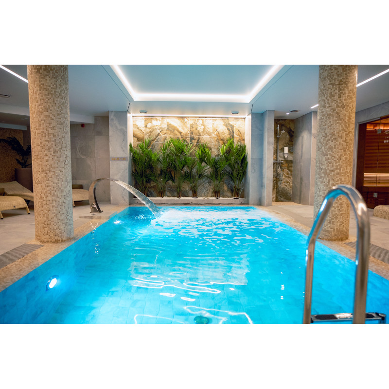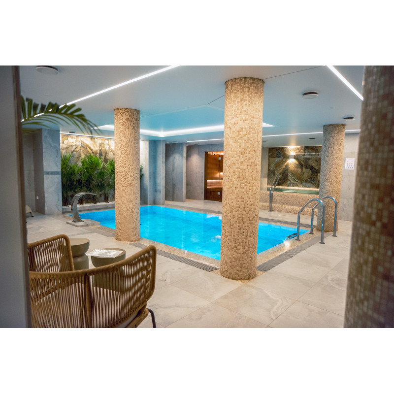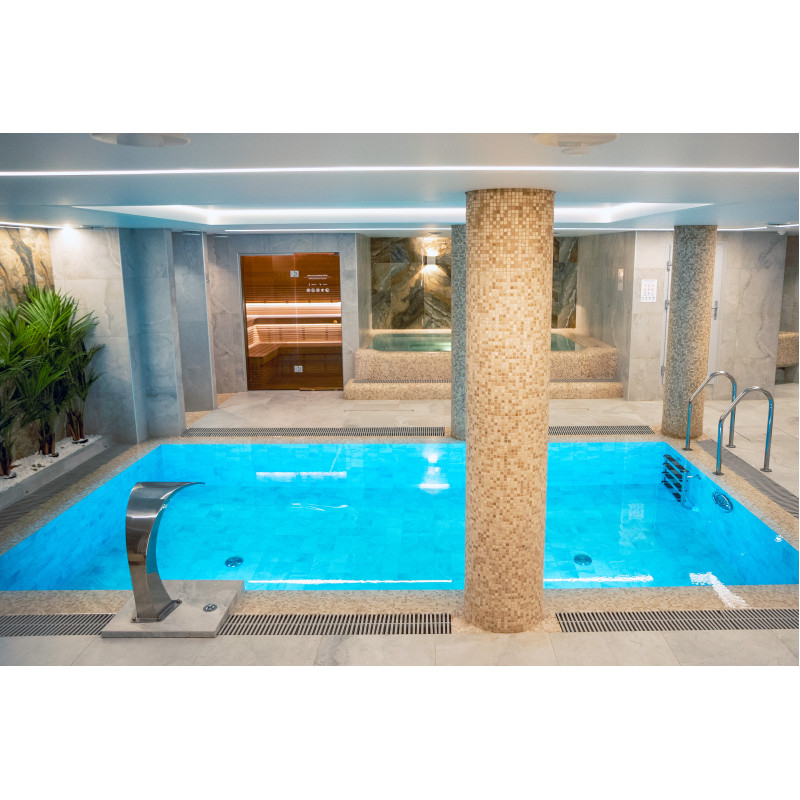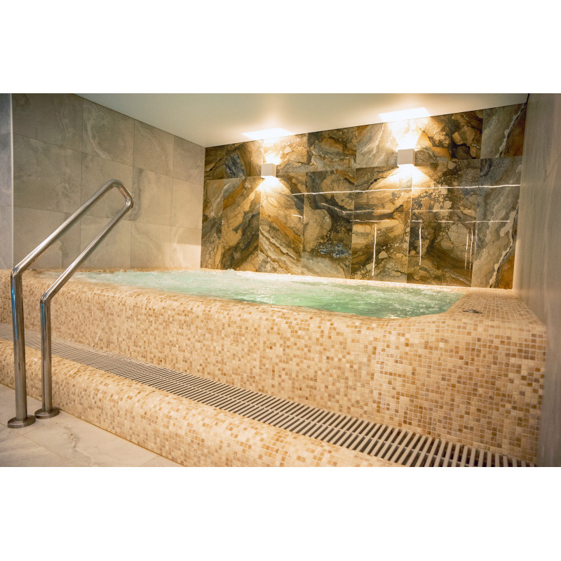 Kompleks vključuje parno sobo, savno, generator ledu in bazen z masažno šobo ter whirlpoolom.