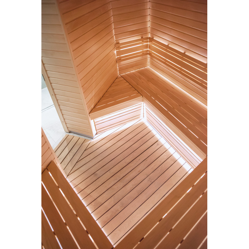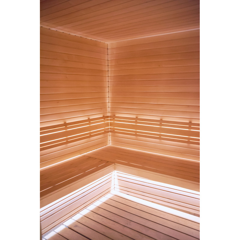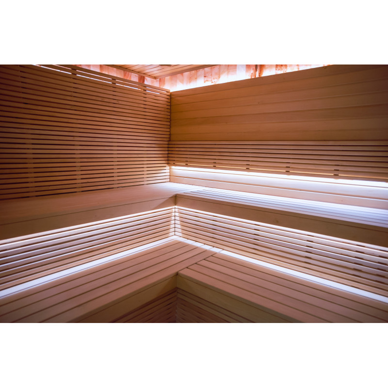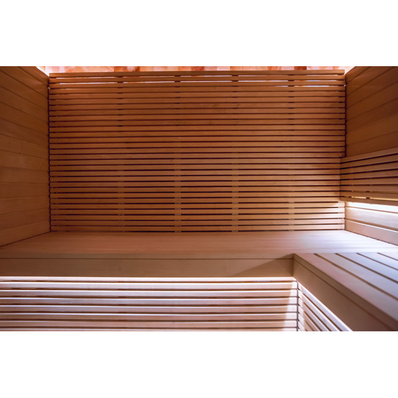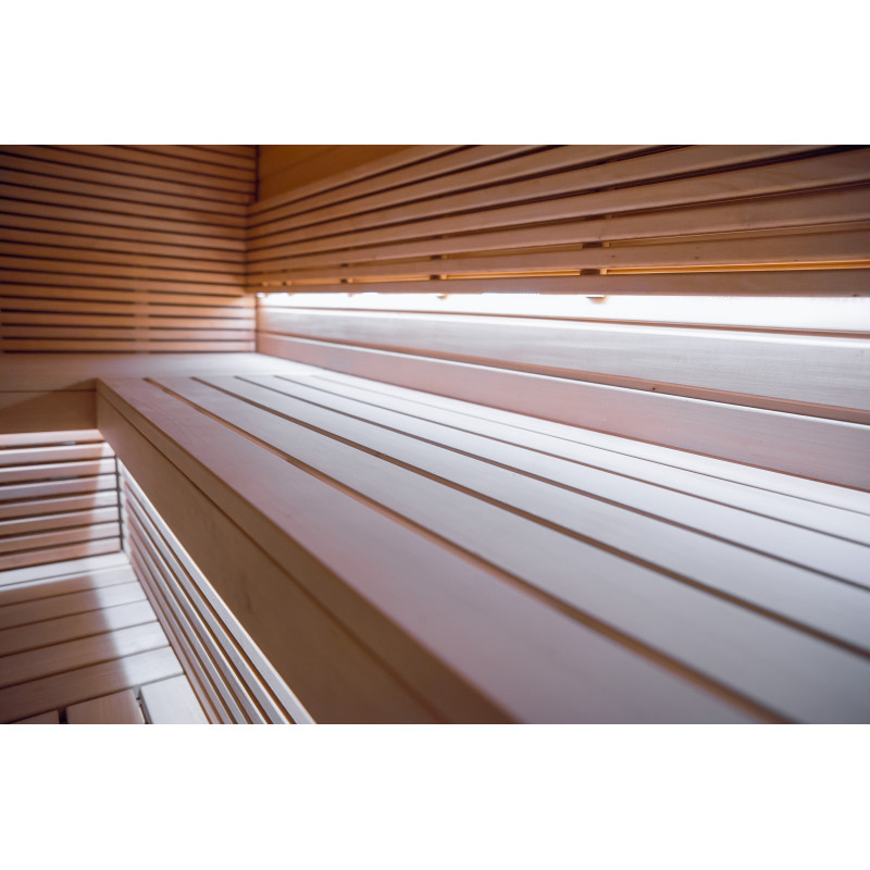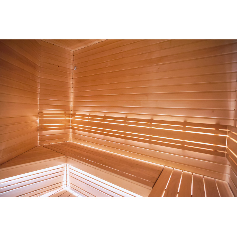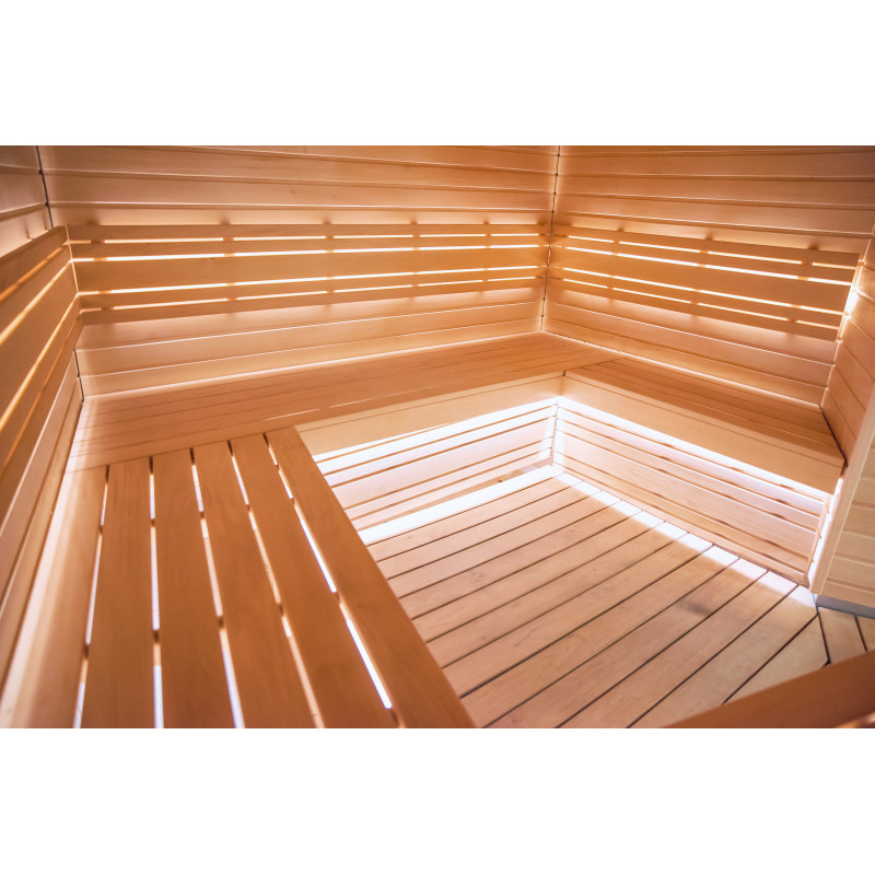 Savna je opremljena s prezračevalno opremo, LED osvetlitvijo pod zgornjimi pogradi in v hrbtnih oporah.