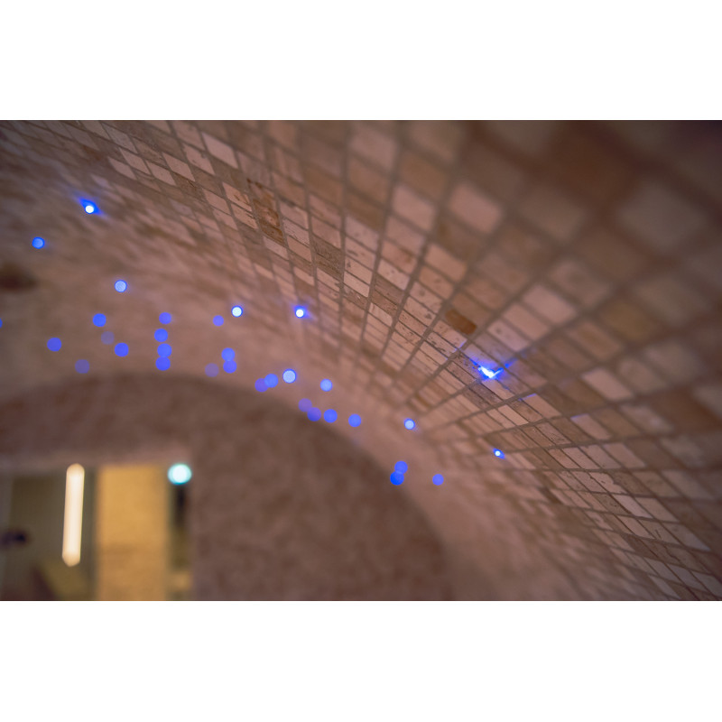 LED osvetlitev je nameščena pod zgornjim pogradom, v naslonjalih in za trakom iz himalajske soli.