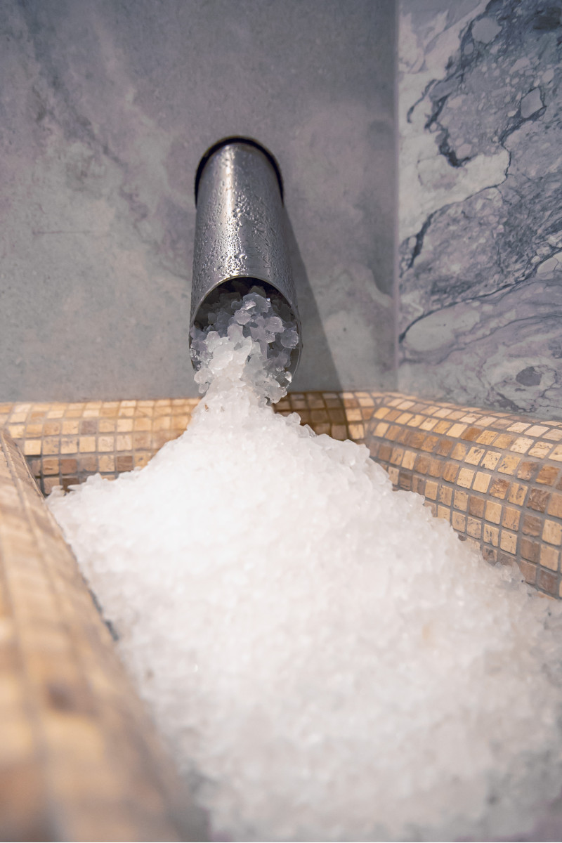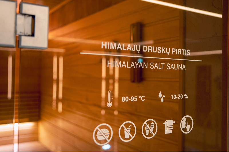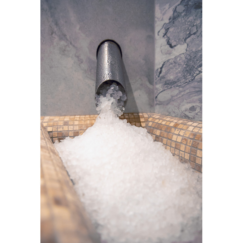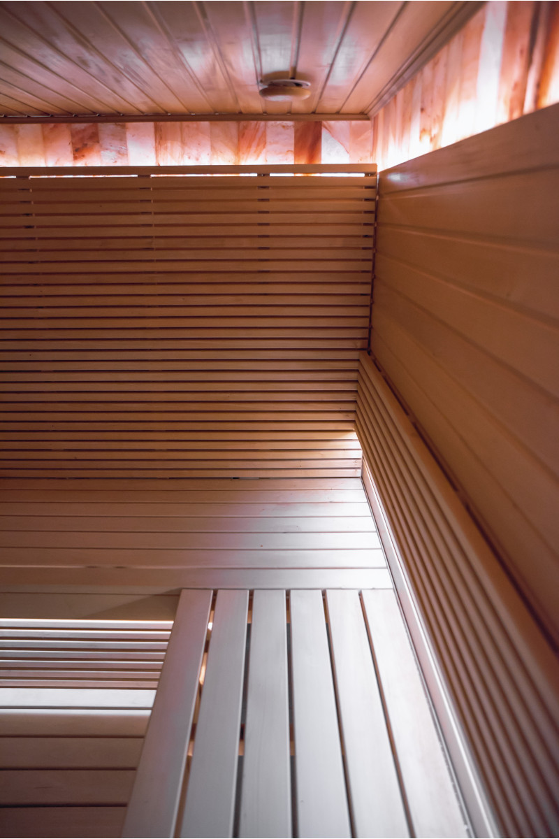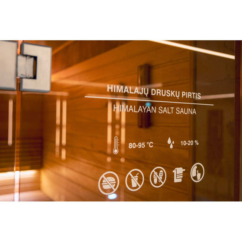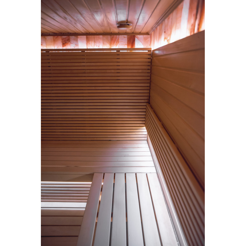 Stena iz himalajske soli v sodobni savni je odlična rešitev tako z estetskega kot zdravstvenega vidika. Na steni tik ob stropu je po celotnem obodu savne oblikovan trak himalajske soli v višini 20 cm. Za solnimi ploščicami je nameščena LED osvetlitev.