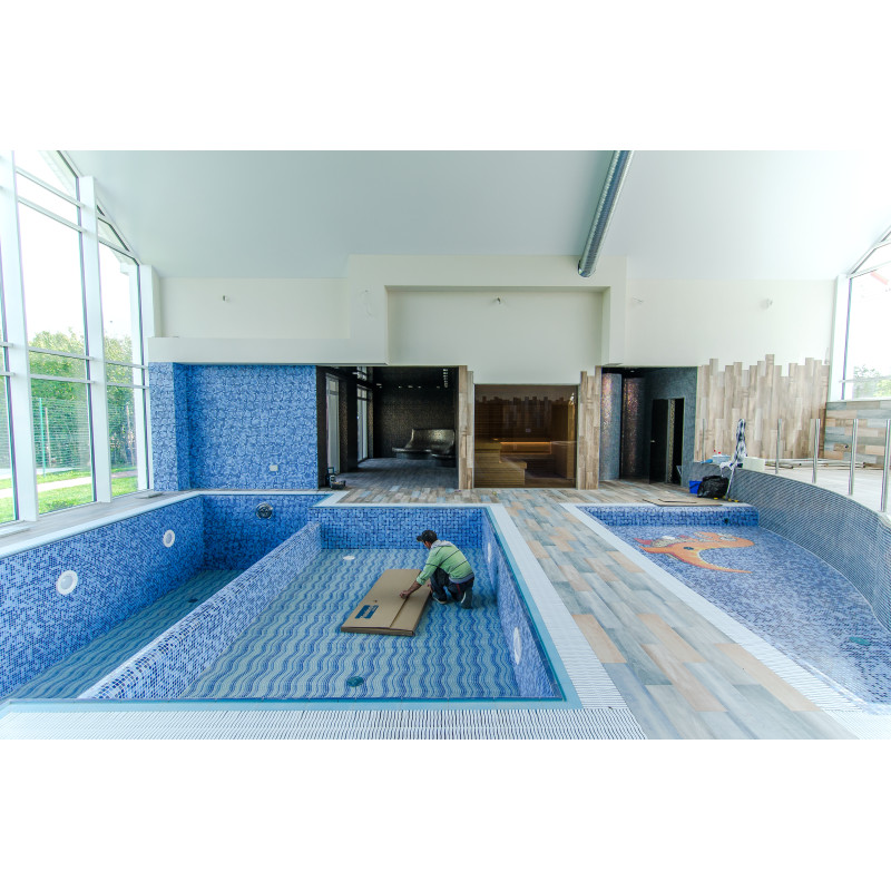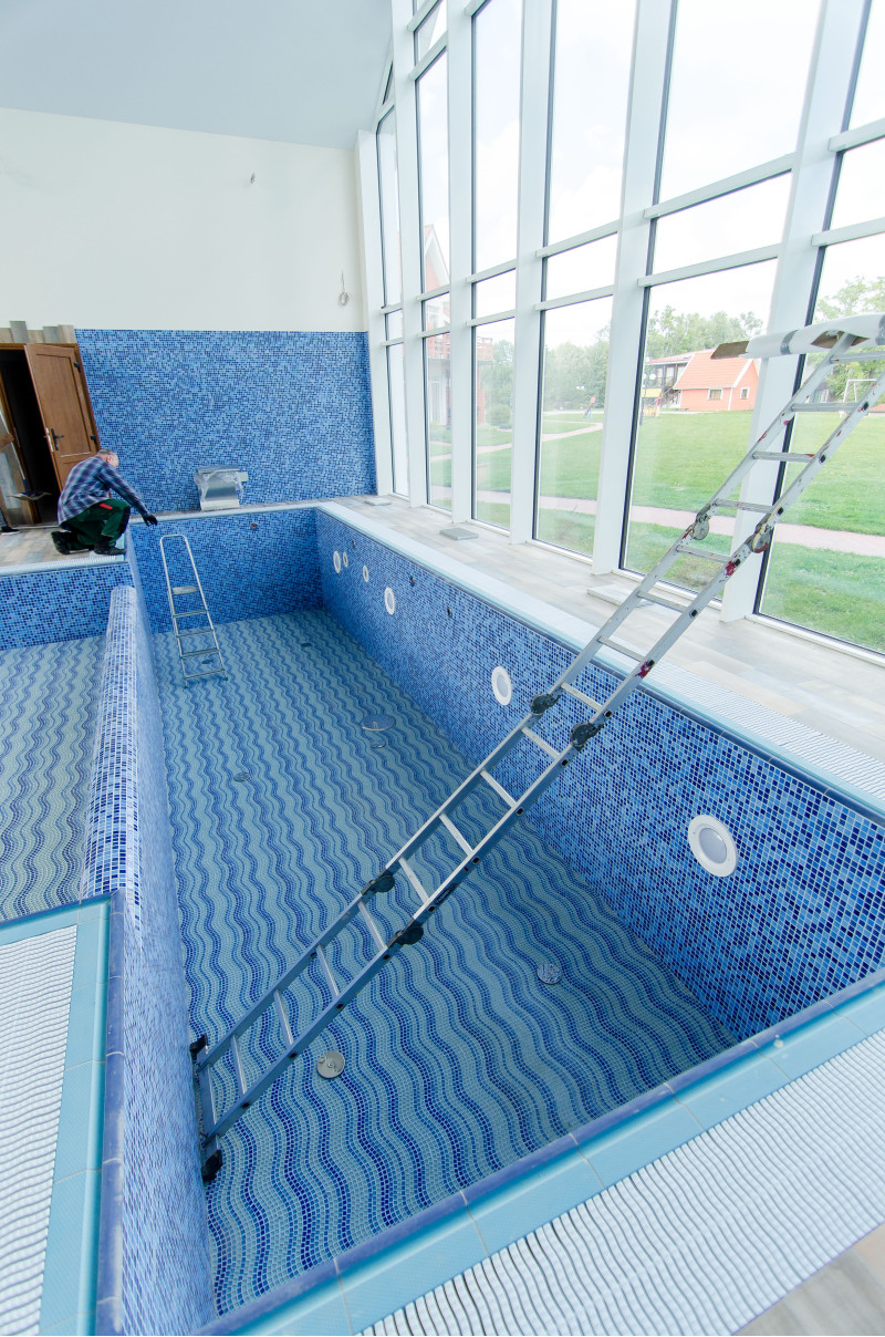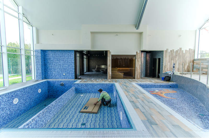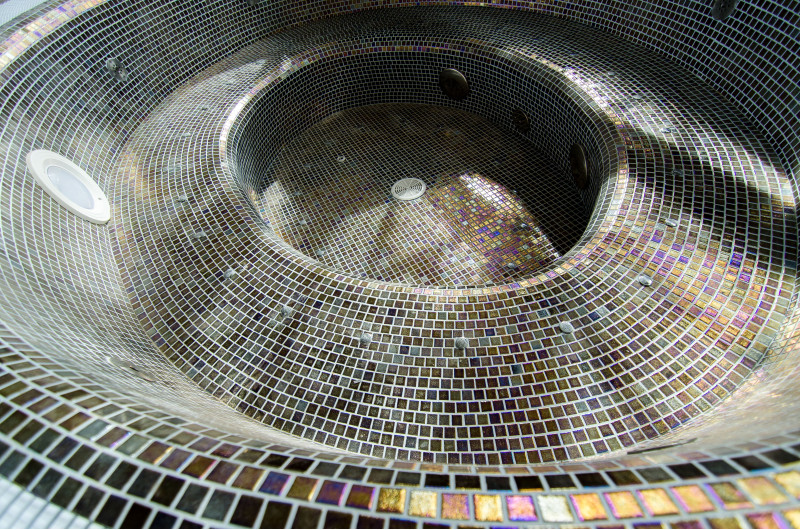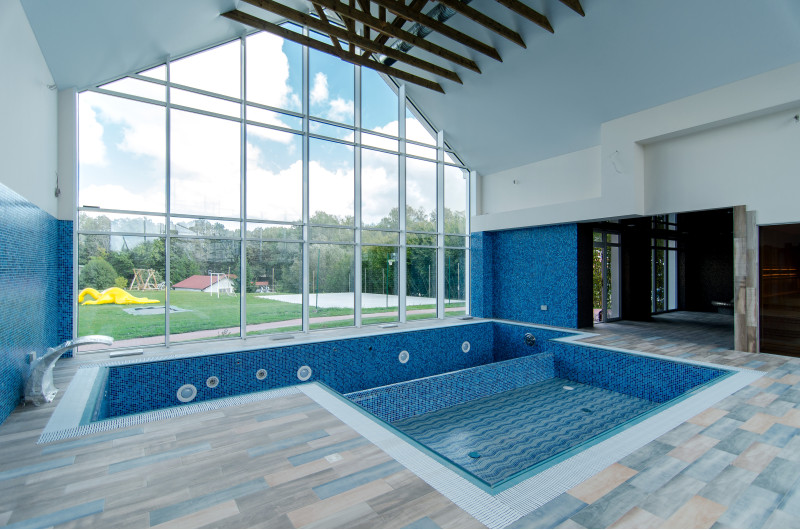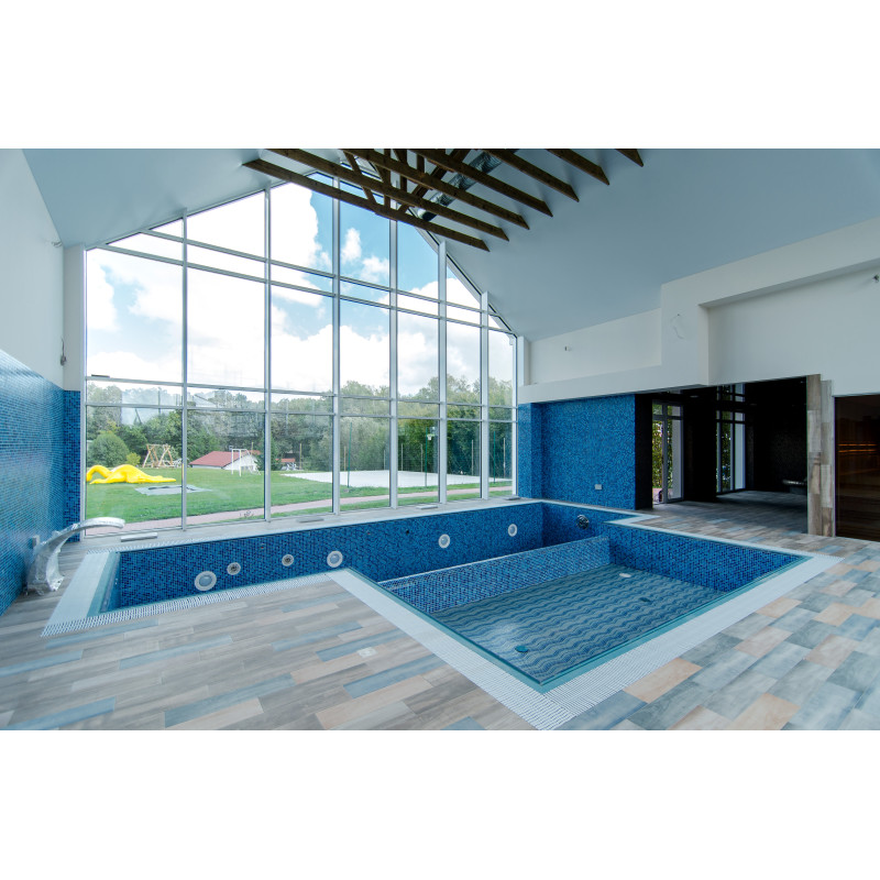 Hidromasažni bazen - 8 sedežev. Opremljen z betonom. Notranjost je pokrita z mozaičnimi ploščicami. Podvodna LED svetilka, masažni curki, filtrirna oprema, oprema za avtomatsko doziranje kemikalij.
