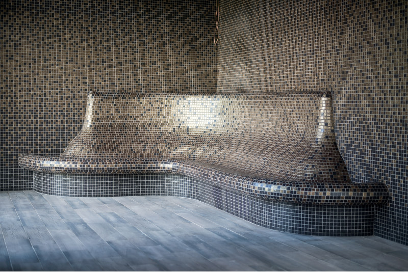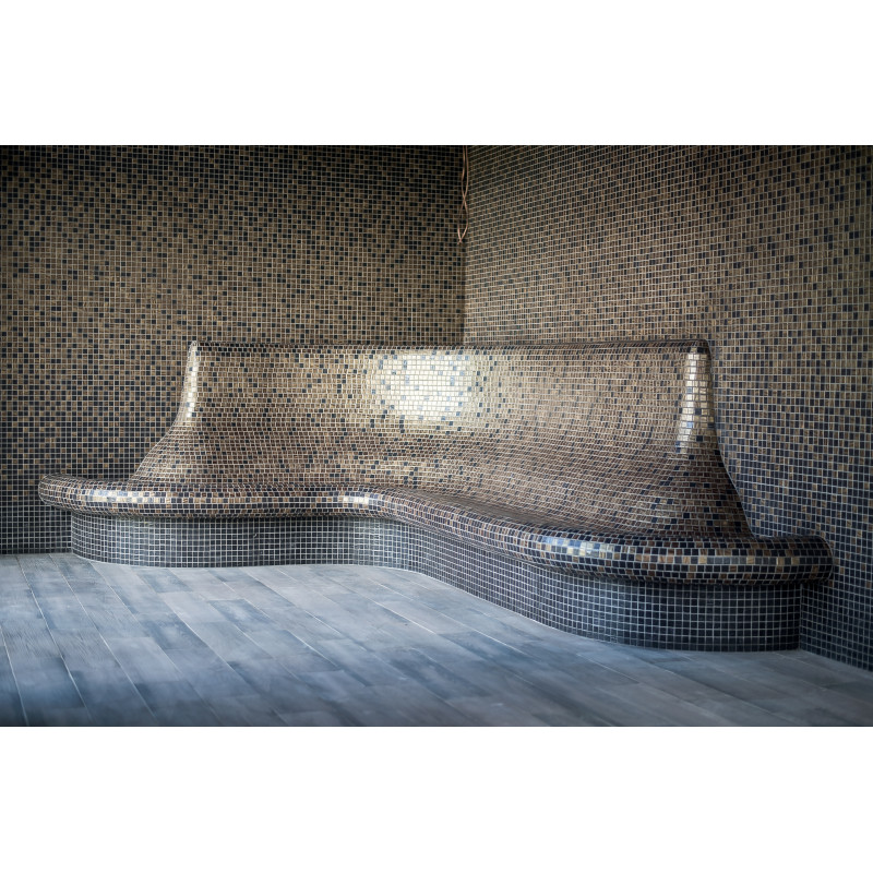 Ogrevana klop. Ergonomska, ogrevana klop z naslonom v obliki črke L skupaj s priključkom za ogrevanje vode na dovod toplote, z ojačitvijo in hidroizolacijo.