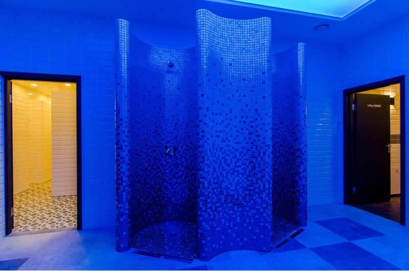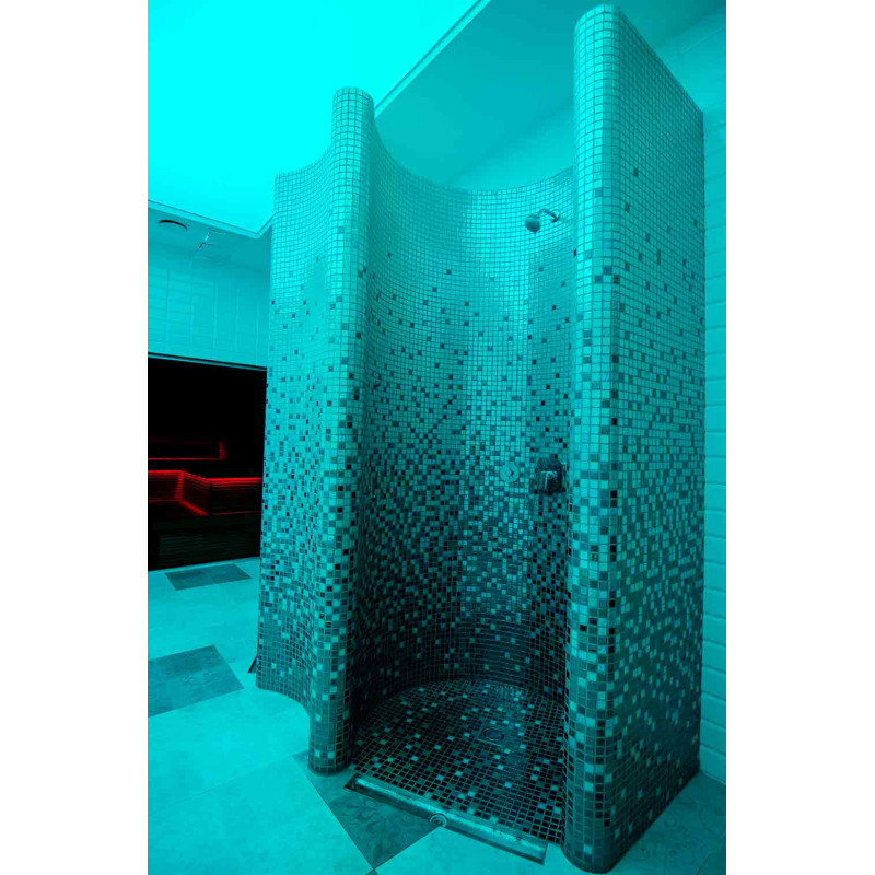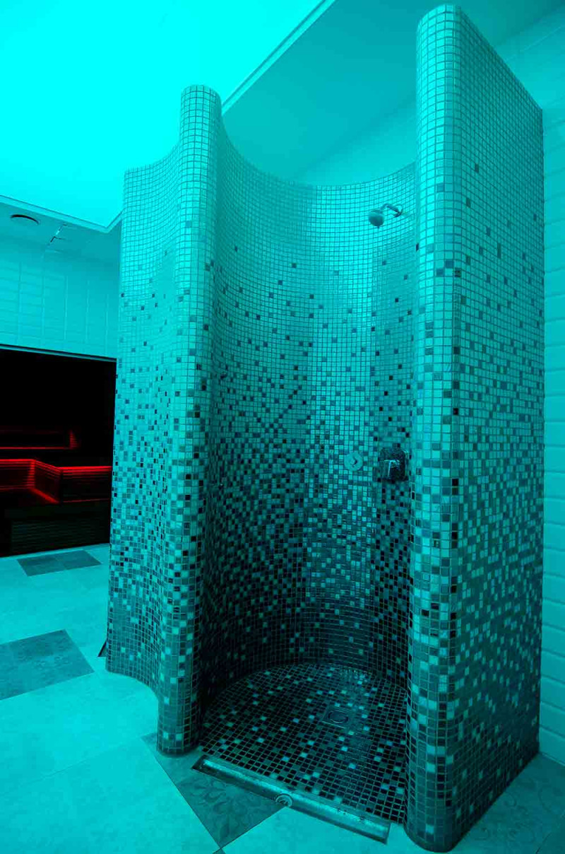 Kalupi za prhanje so narejeni iz XPS 300 z uporabo specifikacij. tehnologija rezanja po individualni zasnovi. Montirani kalupi, hidroizolirani s hidroizolacijo, mazano z Schonoxom. Lepljene mozaične ploščice, prilagojene ukrivljenosti in napolnjene s sivo hidroizolacijo Schonox. Prhe - za različne namene. Eden od njih - za preprosto pranje, drugi - za hlajenje po savni s stranskimi curki hladne vode.