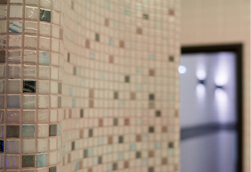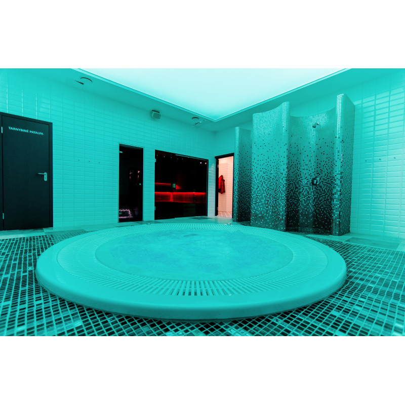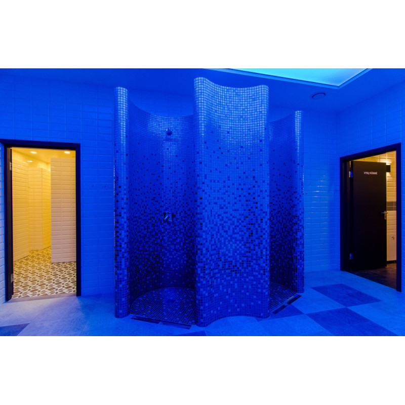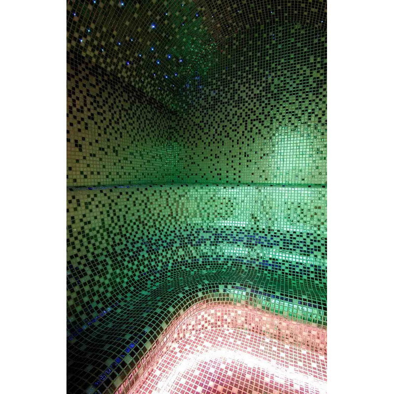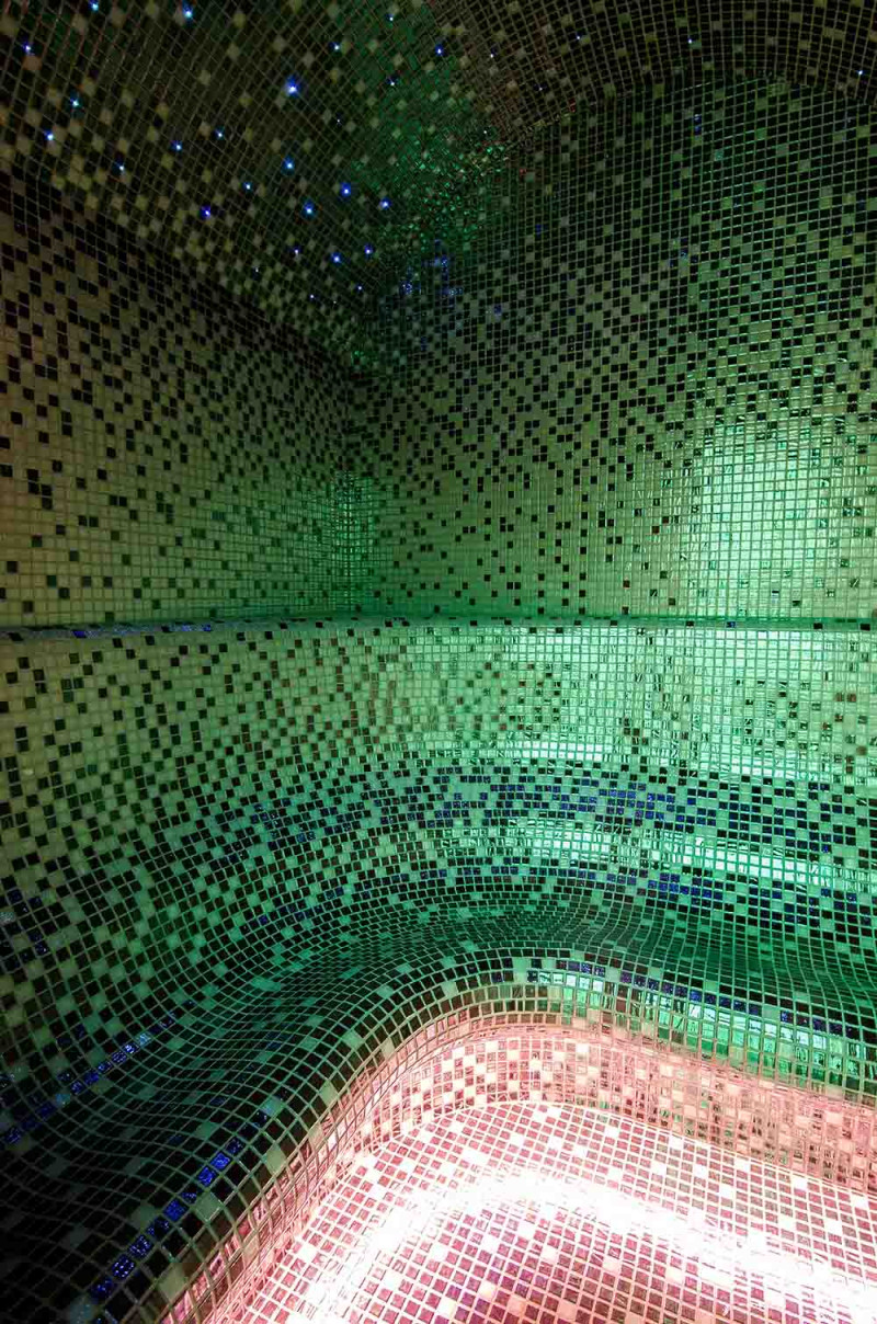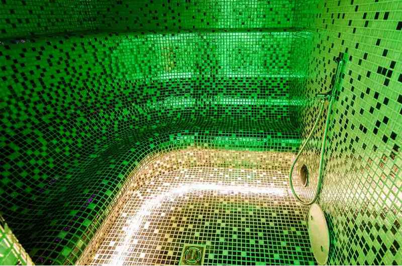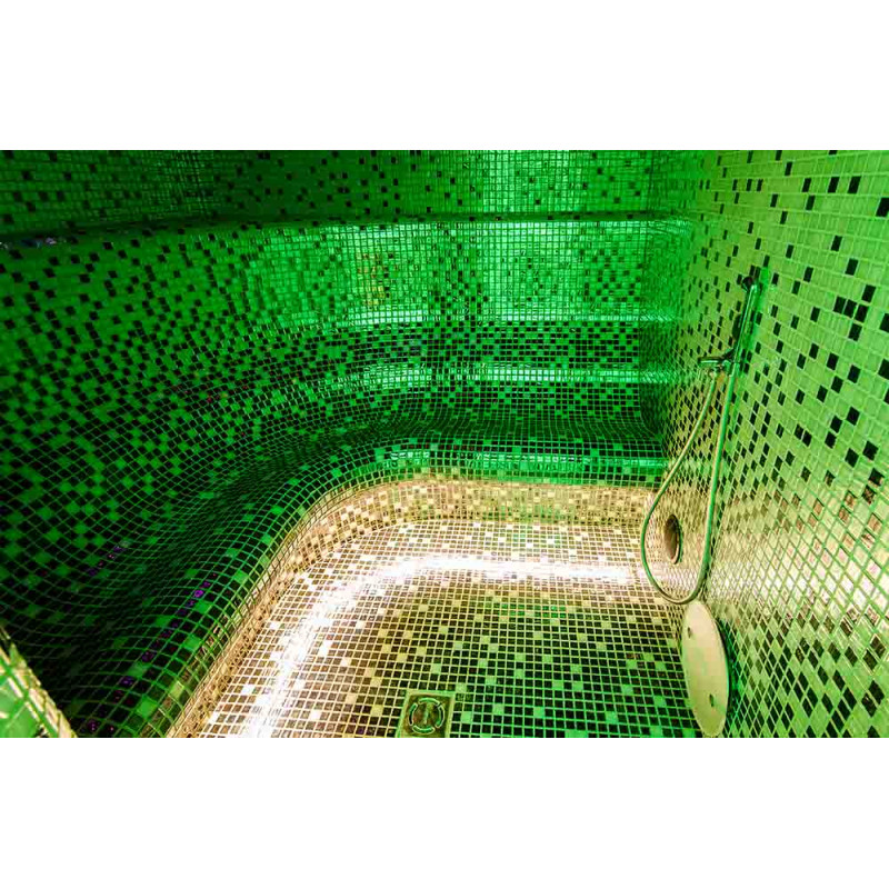 Notranje površine parne kopeli so oblikovane po individualnem projektu iz ekspandiranega polistirena z uporabo neprekinjenega rezanja EPS stirena. Lepljene mozaične ploščice, prilagojene ukrivljenosti in napolnjene s sivo hidroizolacijo Schonox. Tla v sobi so ogrevana. Vrata - aluminijast okvir, kaljeno tonirano steklo. Oprema za parno kopel: