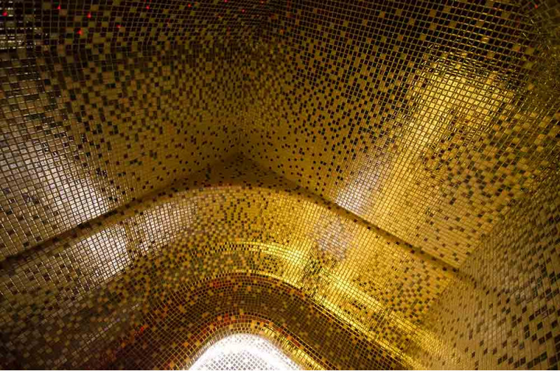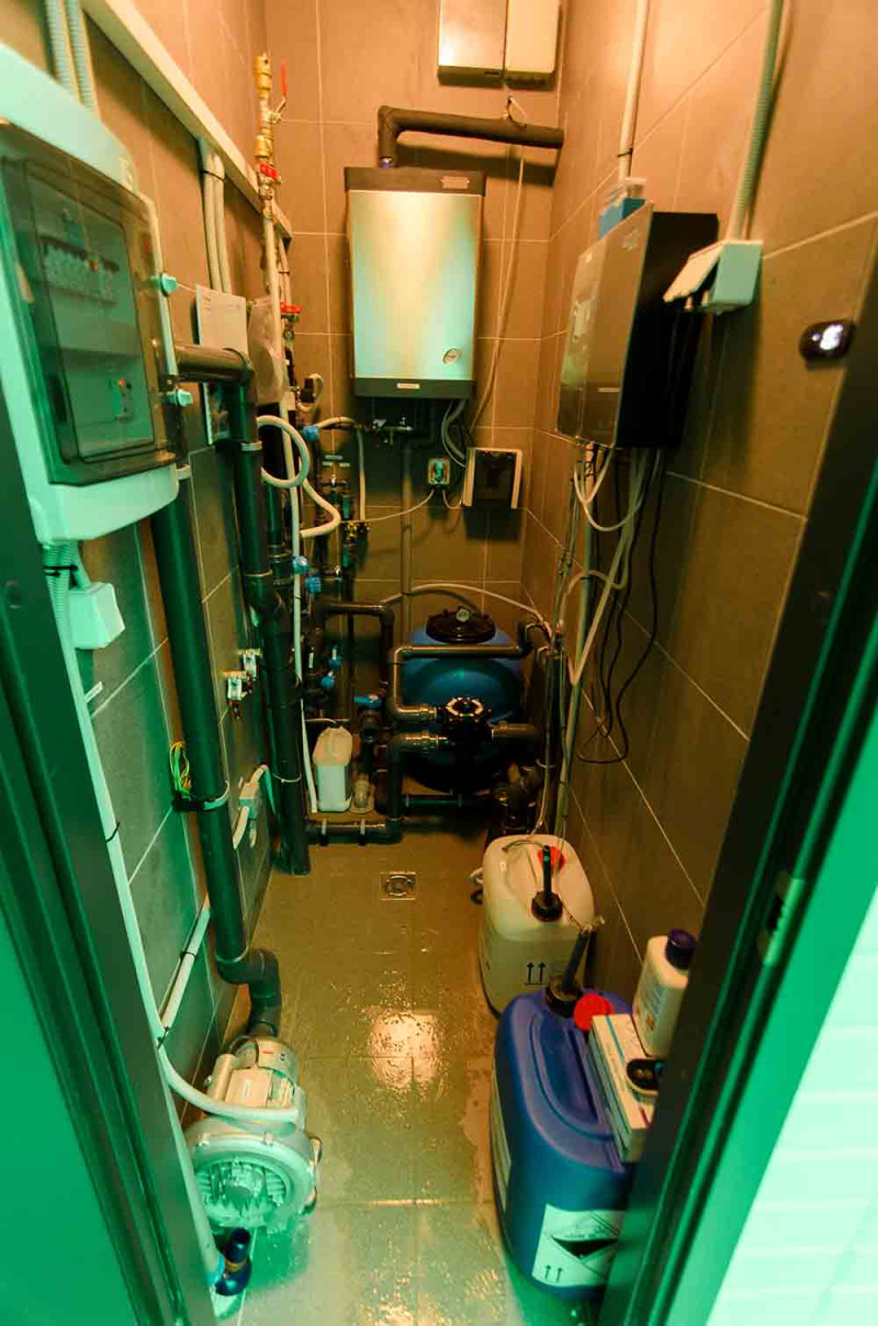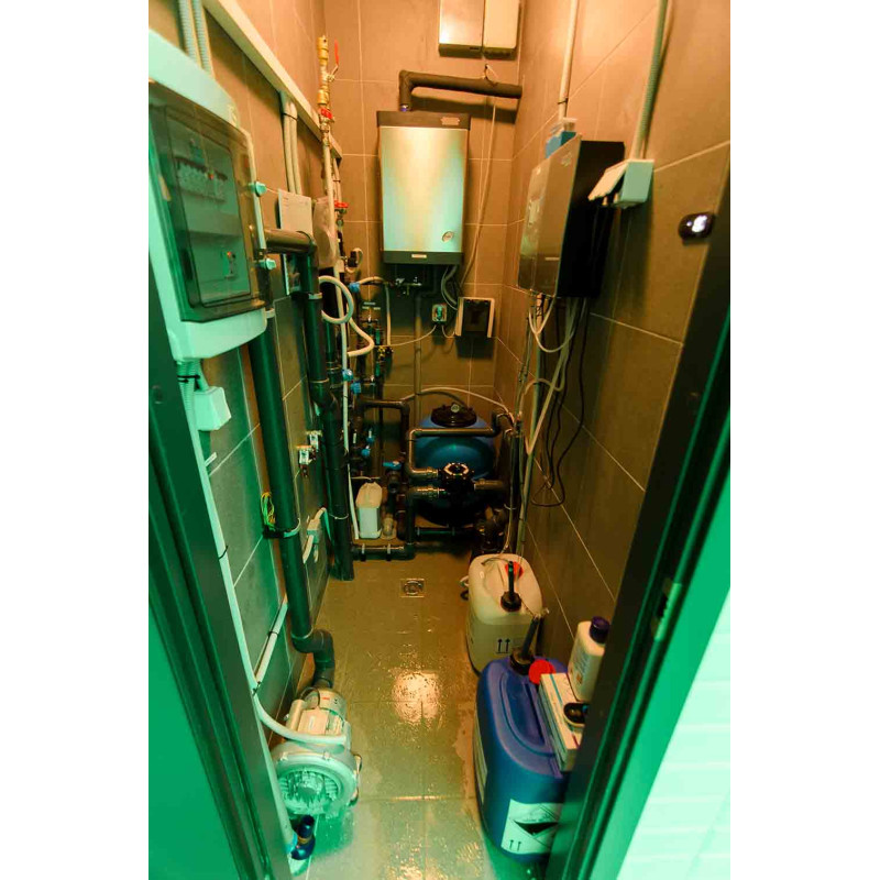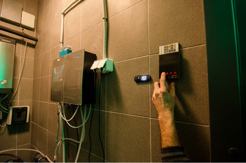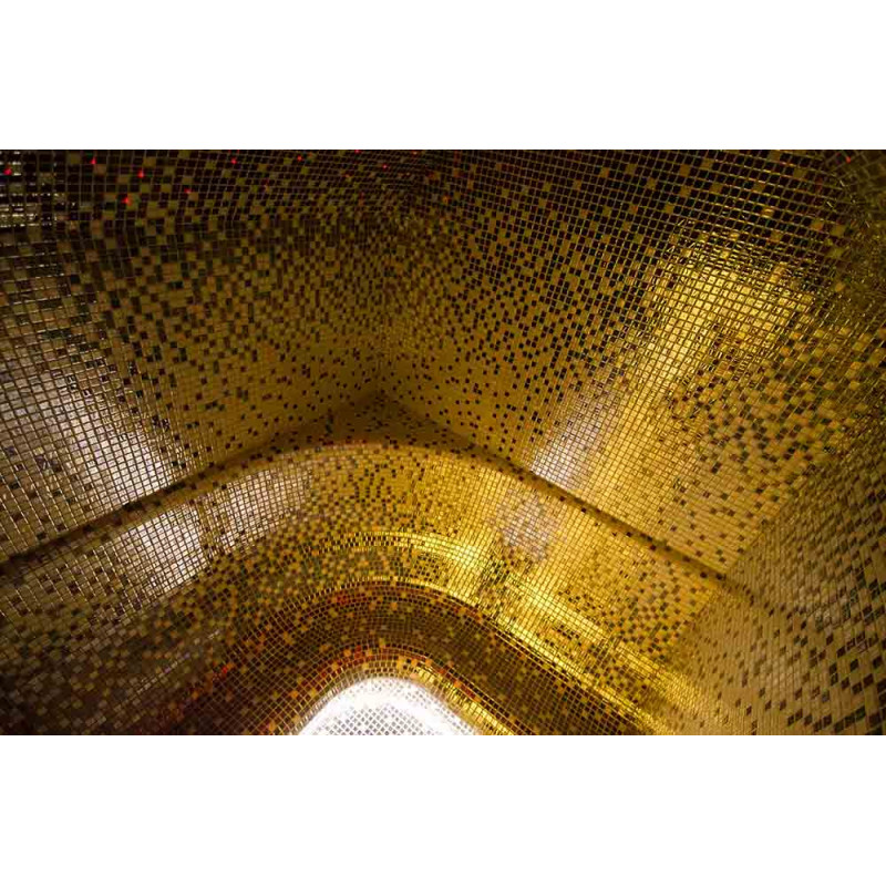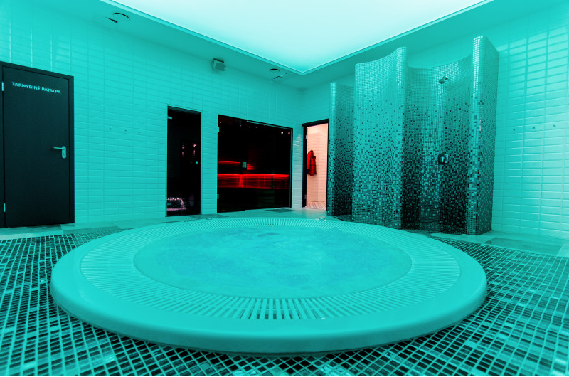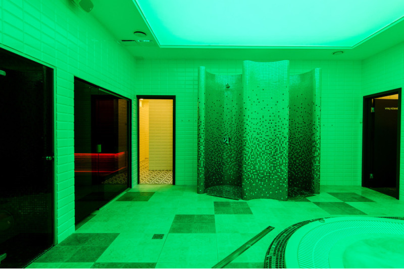 Notranje površine parne kopeli so oblikovane po individualnem projektu iz ekspandiranega polistirena z uporabo neprekinjenega rezanja EPS stirena. Lepljene mozaične ploščice, prilagojene ukrivljenosti in napolnjene s sivo hidroizolacijo Schonox. Tla v sobi so ogrevana. Vrata - aluminijast okvir, kaljeno tonirano steklo. Oprema za parno kopel: