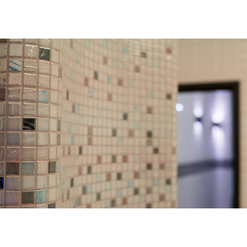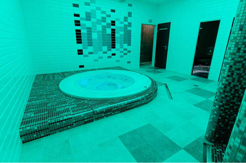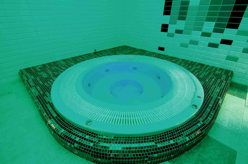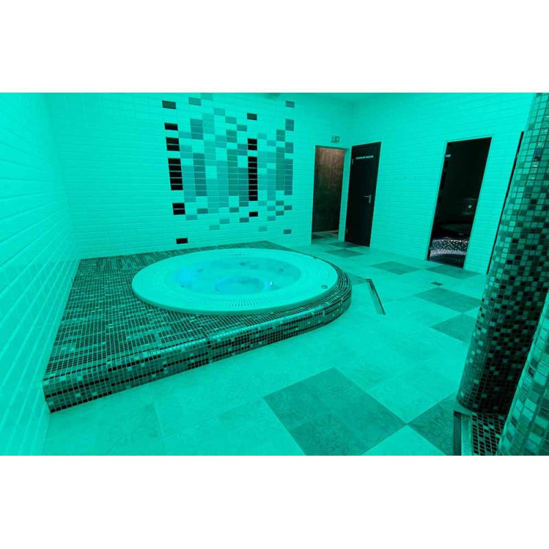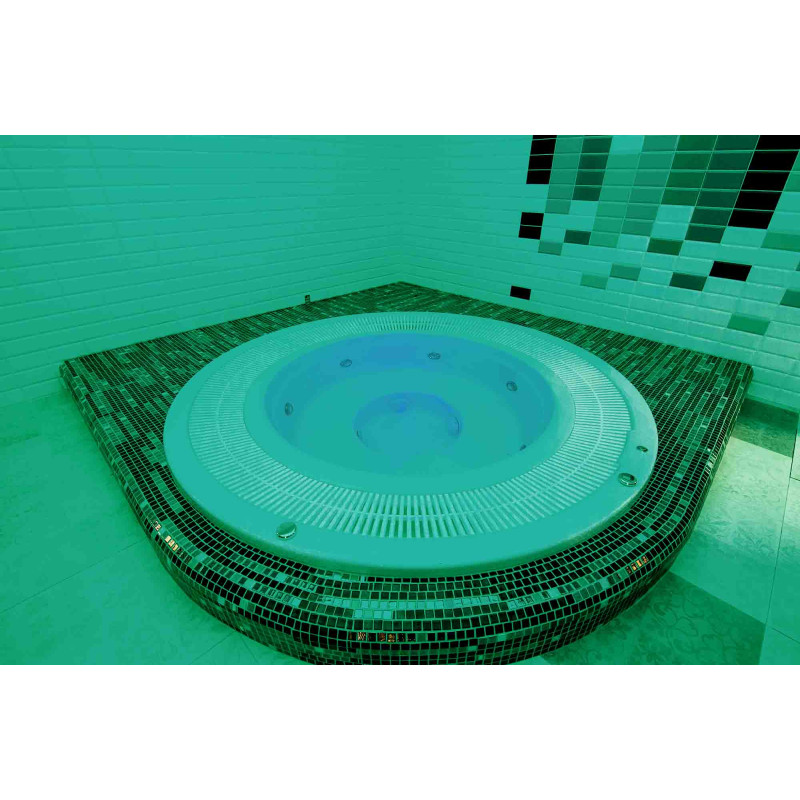 Hidromasažni bazen - komercialni. Ploščice okoli bazena - stekleni mozaik. Oprema: