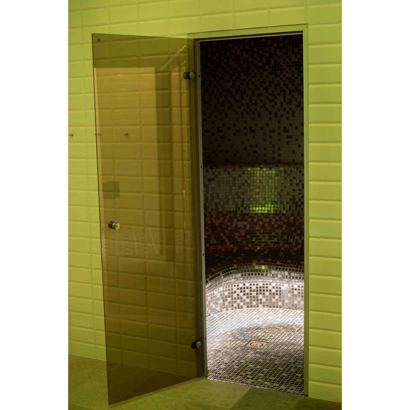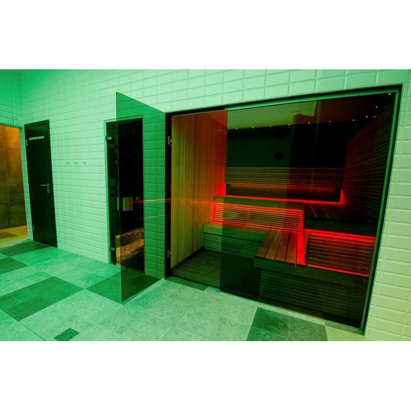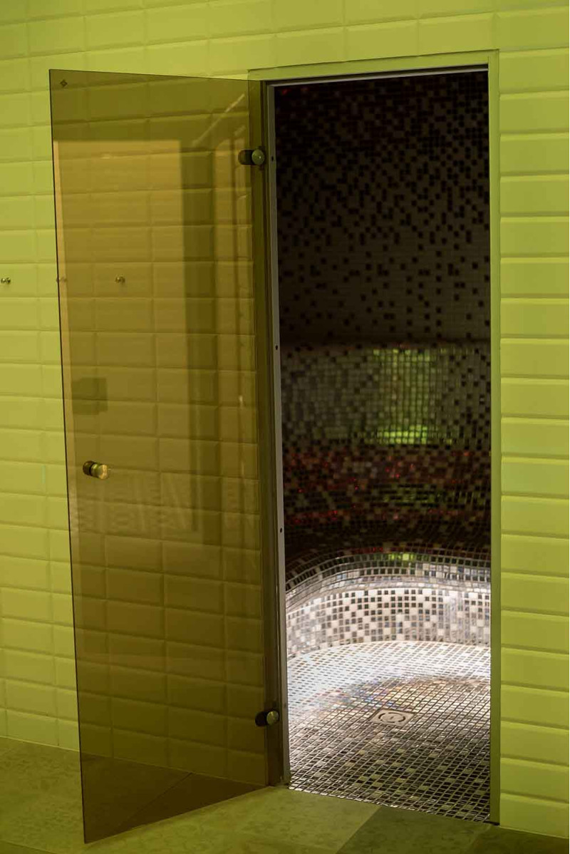 - ustvarja brezhiben slog, steklena vitrina, nameščena v savni, širi prostor in ustvarja vtis lahkotnosti, daje prostoru svetlobo in sodobnost. Steklena vitrina steklo - tonirano, kaljeno, aluminijast okvir,